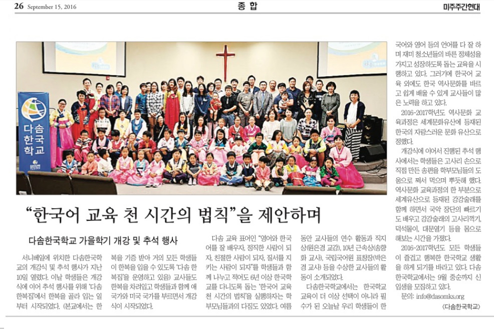 [재외동포신문] 다솜한국학교 가을학기 개강; 추석행사 개최 Attachments: 2016_09_12_DongpoNews.pdf[ ]427 kB Read more: [재외동포신문] 다솜한국학교 가을학기 개강; 추석행사 개최