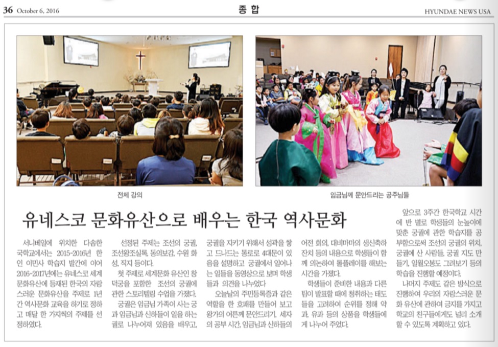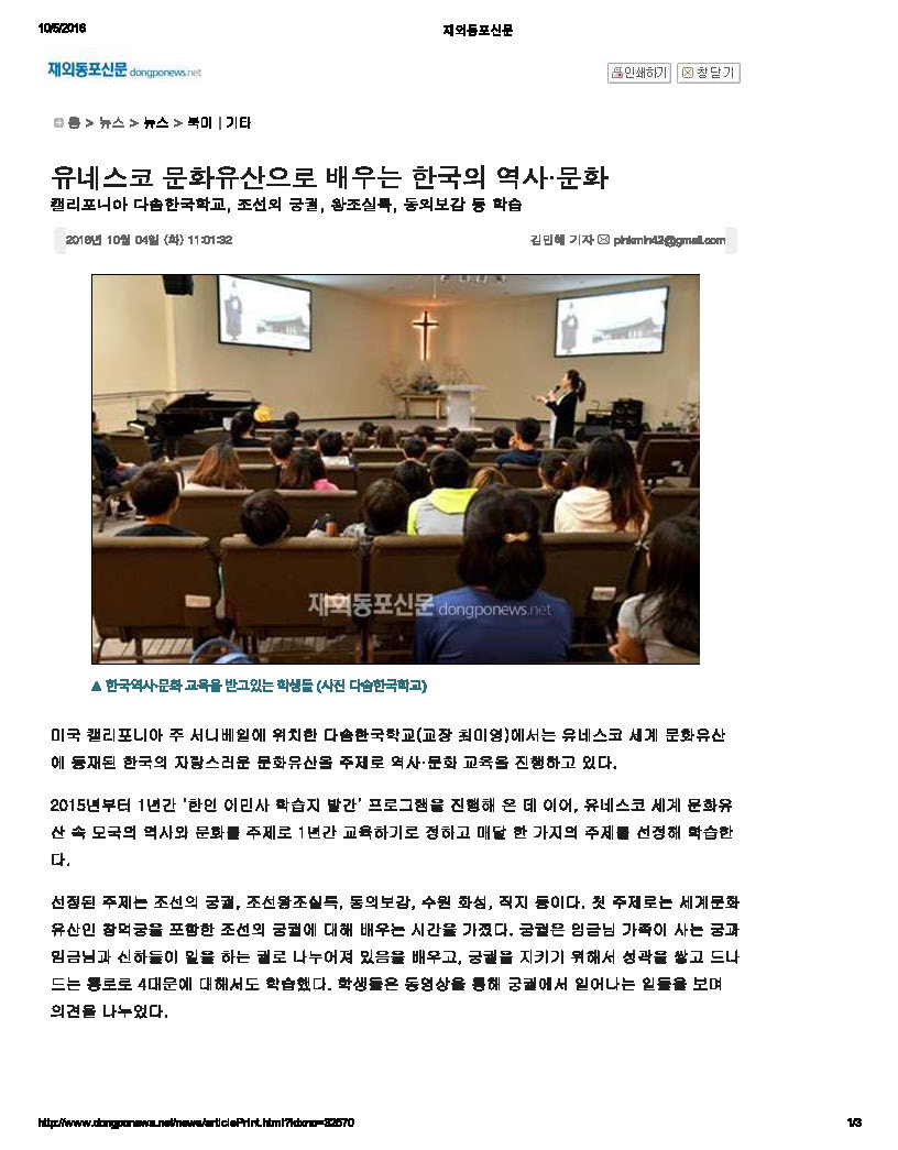 [재외동포신문] 세계문화유산으로 배우는 한국역사문화 지난 10월 4일 재외동포신문에 보도된 본교 역사문화 교육 관련 기사입니다. Attachments: 2016_10_04_Dongpo_News_UNESCO.pdf[ ]450 kB