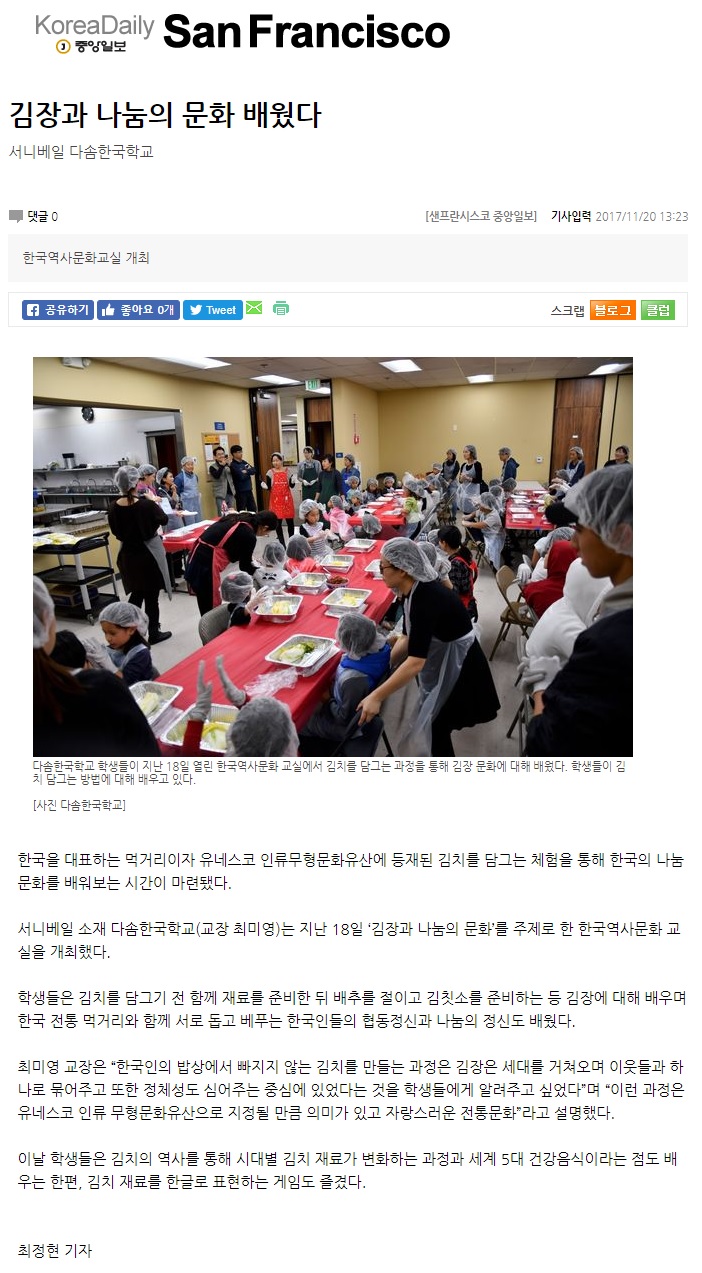 2017년 12월 27일 다솜한국학교에서는 방학을 맞이하여 샌프란시스코에 위치한 위안부 기림비와 아시안아트뮤지엄으로 필드 트립을 갔습니다. 먼저 St. Mary Square에 위치한 위안부 기림비를 방문한 학생들은 세 명의 소녀가 함께 손을 맞잡고 있는 것이 힘을 모으는 것 같아서 좋다고 이야기를 했습니다. 일본군에 의해 인권을 유린당한 위안부에 관해서 잊어서는 안됨을 가르쳐 하는데 어떻게 접근해야 할지 어려움이 있지만 우리 학생들이 잊지 않게 하기 위해서는 기림비가 있다는 것을 알게 하는 것에서 시작해야 하는 것 같습니다. 사진을 통해서 기억하게 하기 위해서 학생들과 모두 함께 사진을 찍었습니다.
