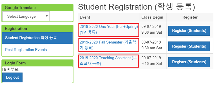 4. 가을학기와 봄학기까지 등록할 수 있는 "1년 등록"은 가을학기 등록 기간에만 등록 기회가 있고 등록비 할인 혜택과 형제 할인 혜택이 있습니다. (1년 등록은 가을학기부터 봄학기까지입니다. 봄학기부터 시작되는 1년 등록은 없습니다.) 1년 등록과 학기 등록 중에 하나만 선택하여 등록하십시오. (보조교사는 등록하기 전에 미리 학교 측의 허가를 받으십시오.)