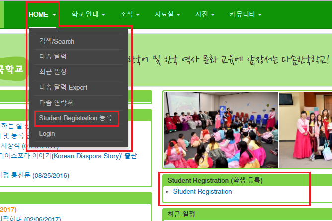 2. 웹 페이지 상단 Home 메뉴에서 [Student Registration 등록]을 클릭하거나 홈 페이지 사진 슬라이드 박스 아래에 있는 "Student Registration"을 클릭합니다. (아래 그림 참조)