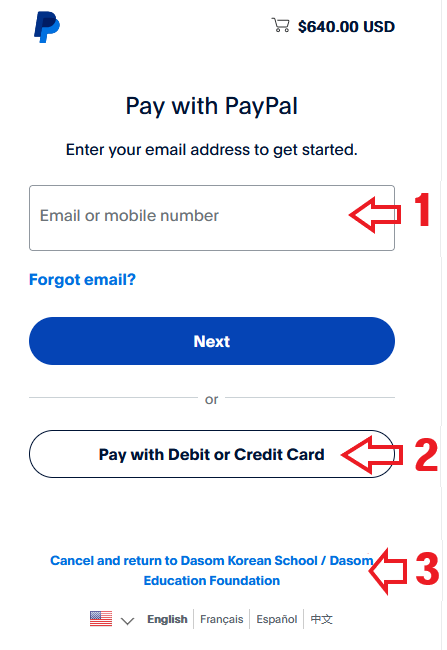 2. PayPal 화면에 청구된 등록비가 위에 보이고, 아래 부분에서 지불 방법을 선택할 수 있습니다.