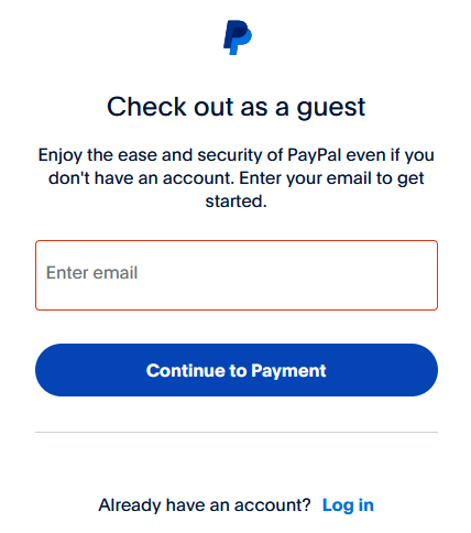 7. PayPal account로 등록된 email address로는 Guest로서 check-out할 수 없습니다. PayPal account에 등록된 email address를 이용해서 결제하는 경우에는 처음부터 1번 입력 칸에 PayPal에 등록된 email address를 입력해서 결제하셔야 합니다. PayPal account를 이용하지 않고 다른 Credit Card로 결제하고자 할 경우에는 PayPal에 등록되지 않은 email address를 입력하셔야 Guest로 check-out을 진행해서 credit card로 결제하실 수 있습니다.