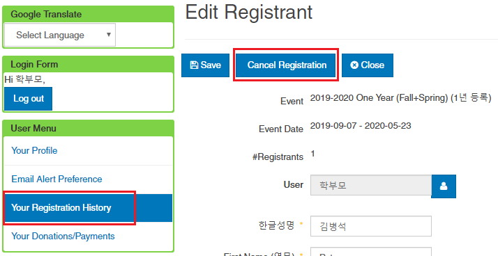 3. 학생 등록을 취소하려면 오른 쪽에 보이는 [Cancel Registration] 버튼을 누르면 같이 등록한 모든 자녀들의 등록이 취소됩니다. First Name 칸의 이름을 클릭한 후 [Cancel Registration] 버튼을 클릭하여 취쉬할 수도 있습니다. (아래 그림 참조)