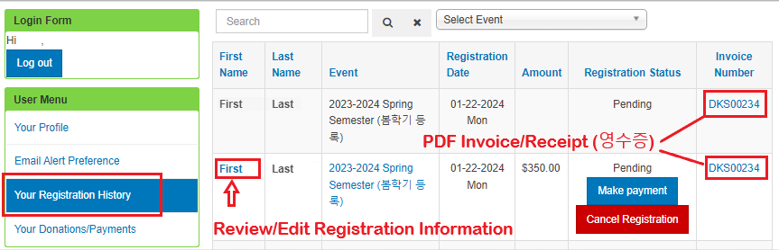 웹을 통해 학교에 학생을 등록하고 결제한 경우에는 웹 계정(User Account)에 로그인하면 등록한 정보를 확인 및 수정하거나 PDF 영수증을 내려받을 수 있습니다.