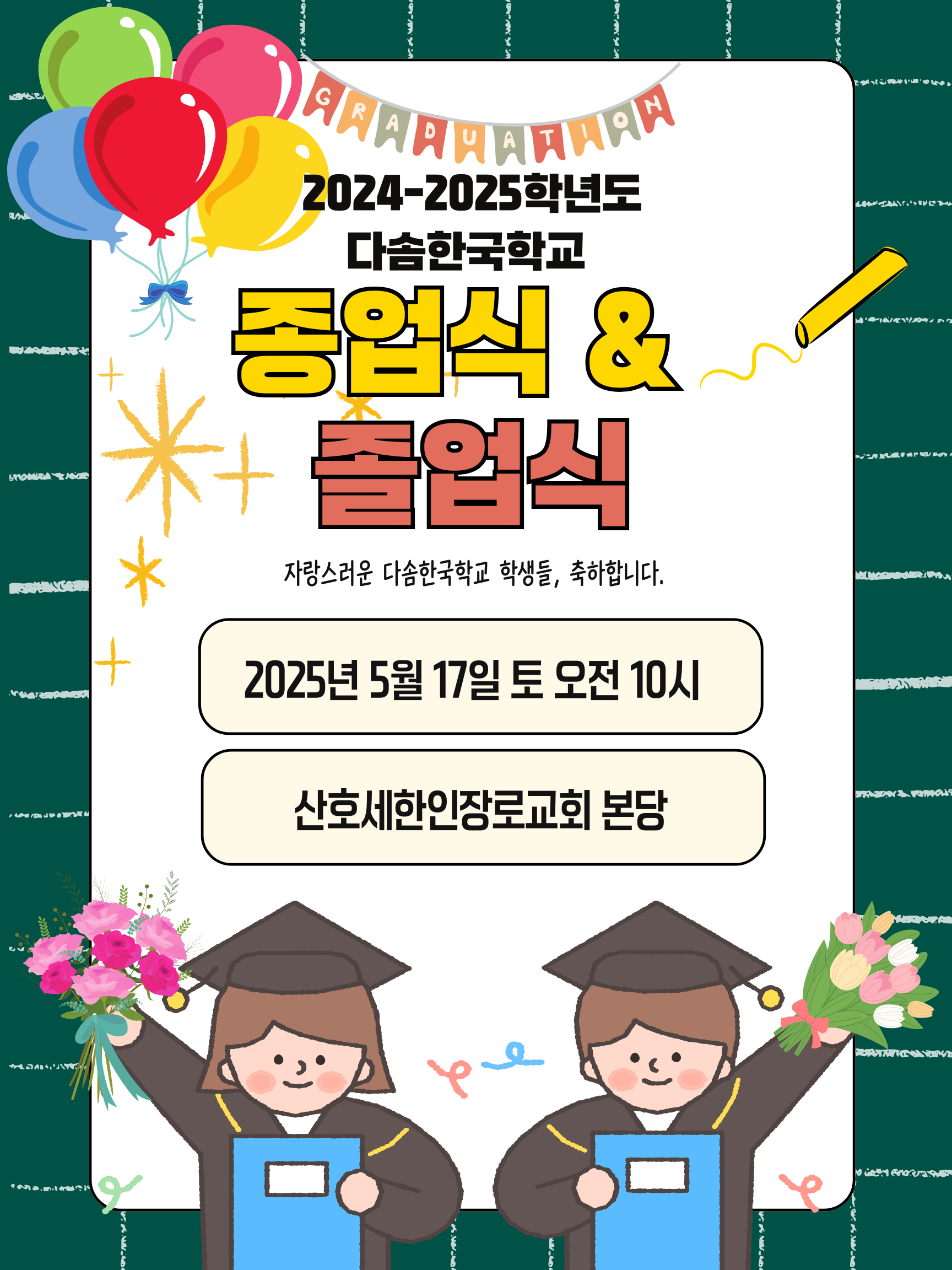 [가정통신문] 2024-2025학년도 종업식 및 졸업식 2024-2025학년도 종업식 및 졸업식이 다음과 같이 있습니다. 학부모님들께서는 모두 참석해 주시기를 바랍니다. 감사합니다. 일시: 2025년 5월 17일 오전 10시 장소: 산호세한인장로교회 본당 Prev Next