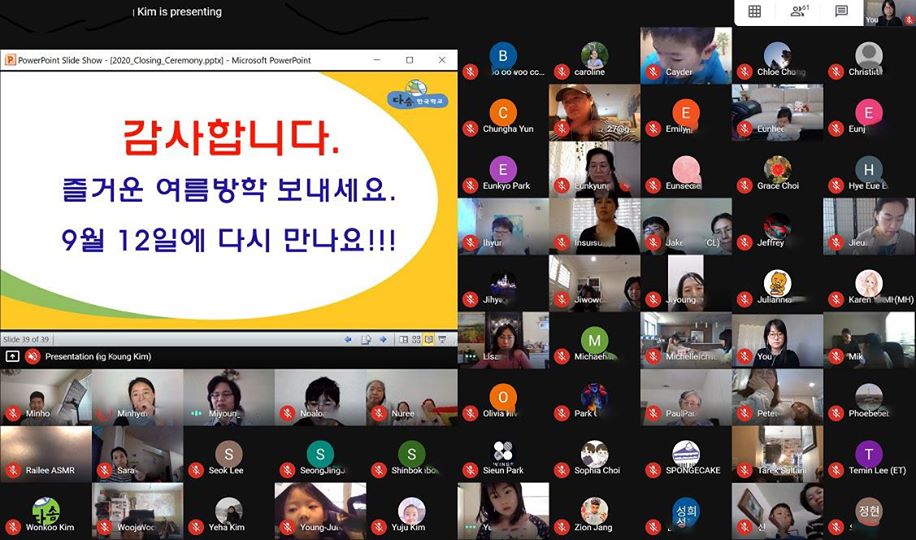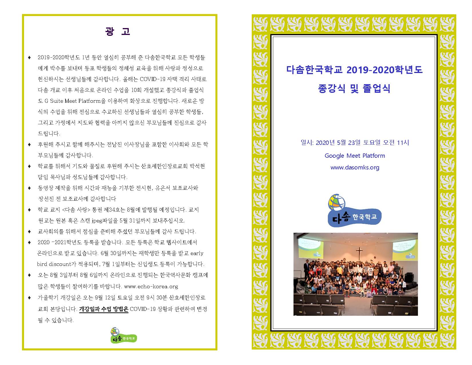 오는 5월 23일 토요일 오전 11시부터 구글 MEET platform을 활용하여 2019~2020학년도 종강식 및 졸업식을 합니다. 모두 참석하셔서 자녀들을 격려해 주시고 칭찬해 주십시오.