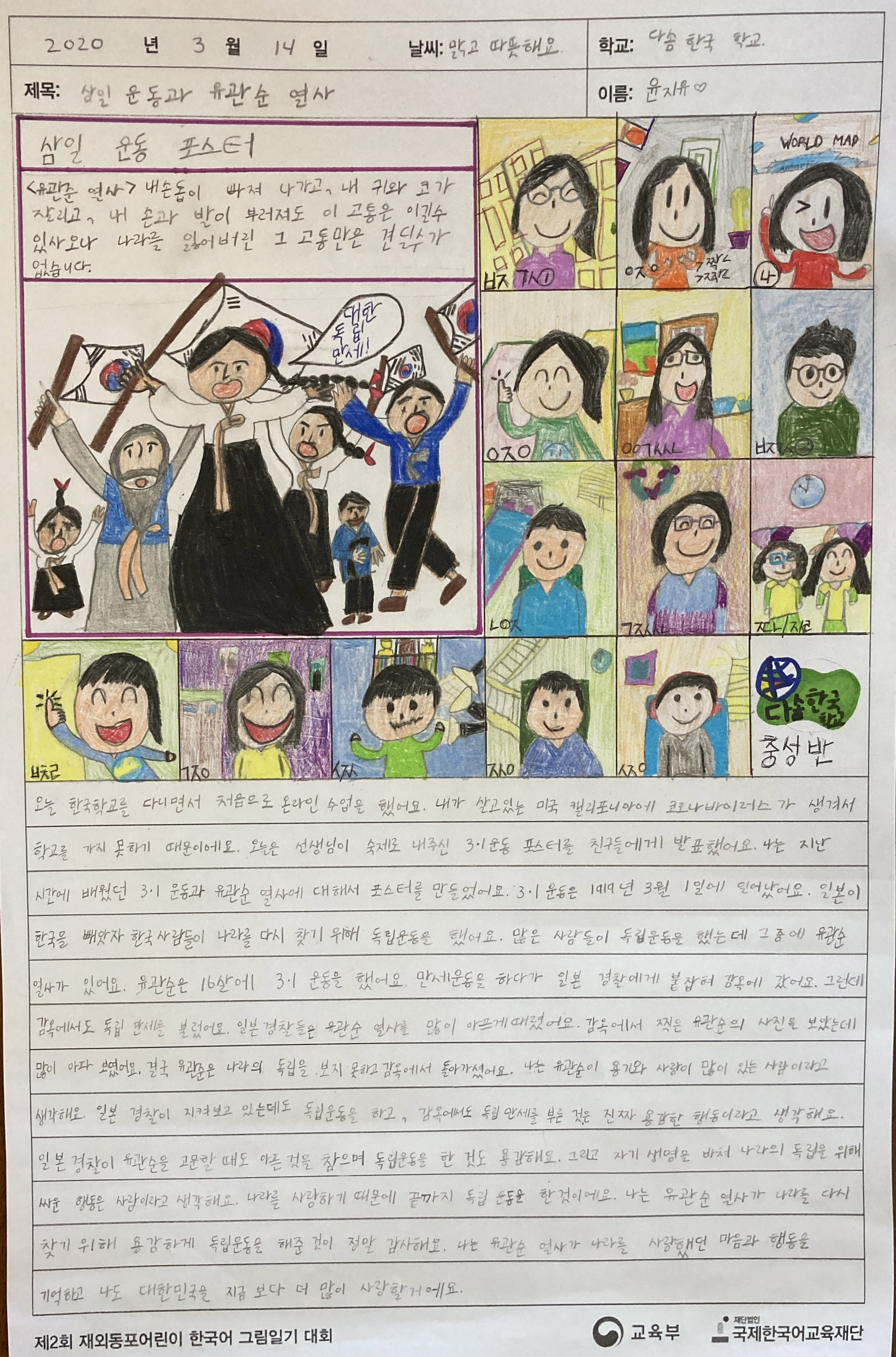 교육부가 주최하고 국제한국어교육재단이 주관한 제2회 재외동포 어린이 한국어 그림일기대회가 지난 2020 6 10일부터 7 24일까지 개최되었고 전세계 36개국 473명이 참가하여 최종 15명의 수상자가 선정되었습니다. 본교  충성반에 재학중인 윤지유 학생이 대상을 차지하여 부총리겸 교육부장관상을 수상하였다. 윤지유 학생은 지난 3월 둘째 주부터 구글MEET 화상 수업으로 한국학교가 진행된 모습을 통해 본인이 삼일절 수업에서 배운 유관순 열사에 관한 프로젝트 발표를 하는 것을 중심으로 그림일기를 그렸습니다.