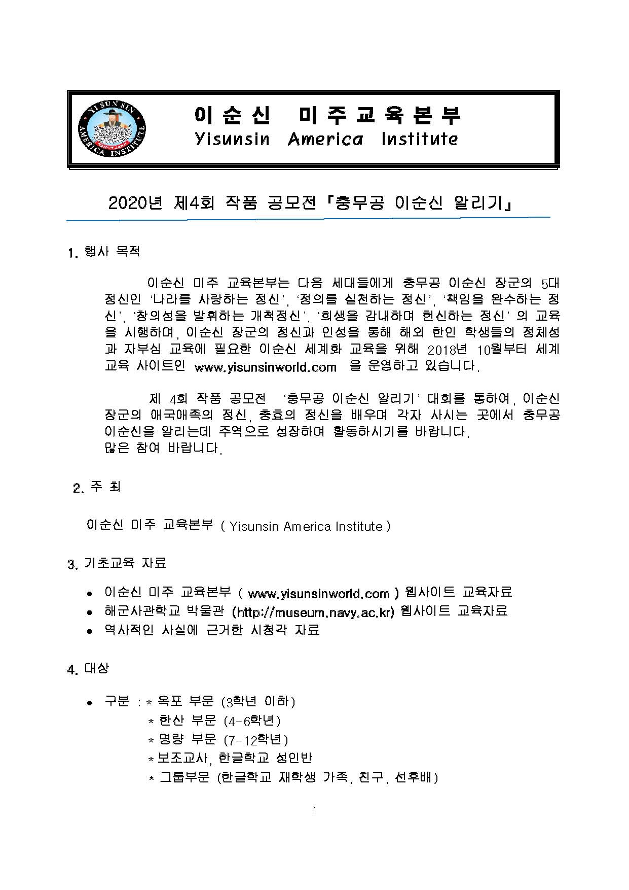 2020 제4회 충무공 이순신 바로 알리기 작품 공모전 Attachments: 2020_3회이순신글쓰기수상작품집.pdf[ ]6991 kB 제4회이순신작품공모전응모서world.doc[ ]192 kB 제4회작품공모전-충무공이순신알리기안내문.pdf[ ]231 kB Prev Next