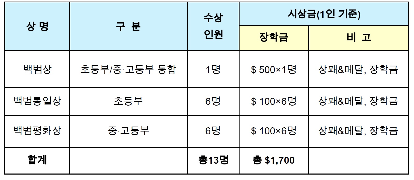 - 수상자 배출 학교 전체 : 각 학교당 필요 교육 도서 기증(US $200 상당)