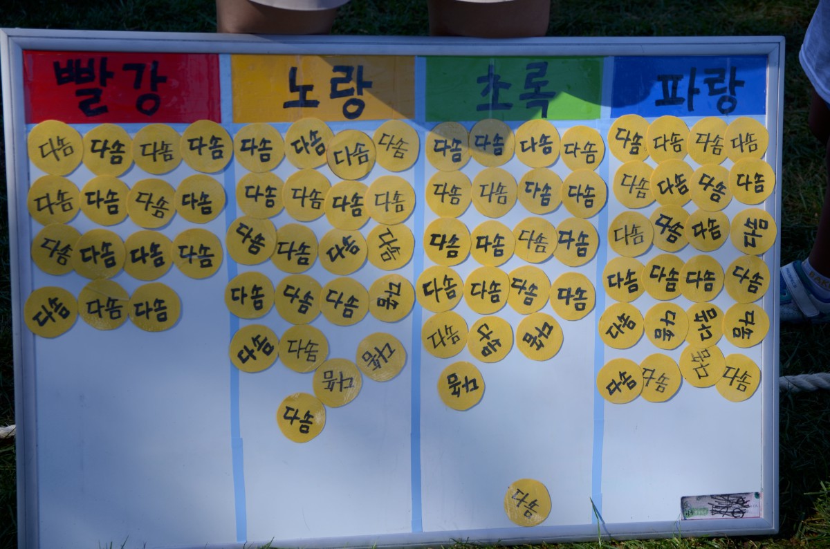 - 색판 뒤집기: 앞 뒤 색이 다른 색판을 일정한 시간 동안 뒤집는 경기였습니다. 열심히 뒤집어도 또 뒤집히고 다시 뒤집히는 재미난 시간이었습니다.
