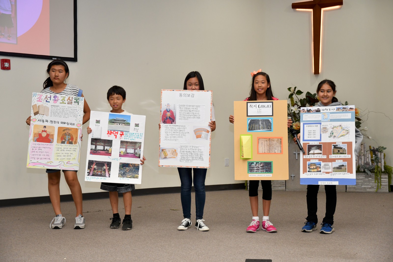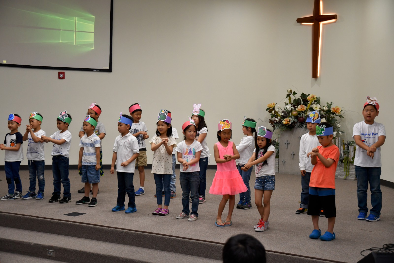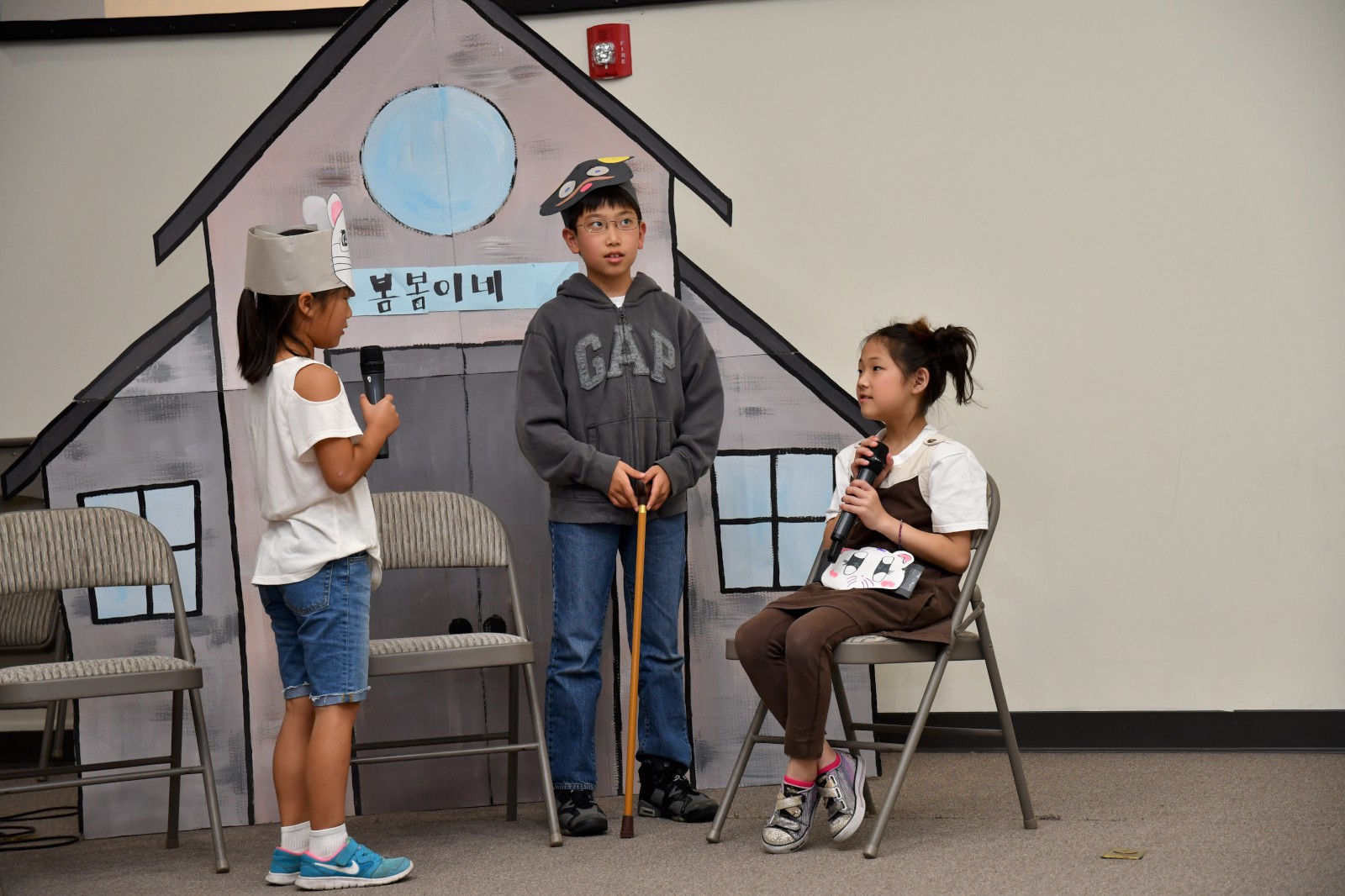 사랑반과 기쁨반에서는 <주먹가위보>, <아기돼지 삼형제>, <그대로 멈춰라> 등의 동요를 율동에 맞추어 불러서 부모님들과 학생들의 박수를 받았습니다. 충성반에서는 지난 4월 22일 북가주 구연동화대회에서 장하진 학생이 발표하여 동상을 수상한  ‘용기를 내, 봄봄’을 각색한 연극을 발표하였습니다.