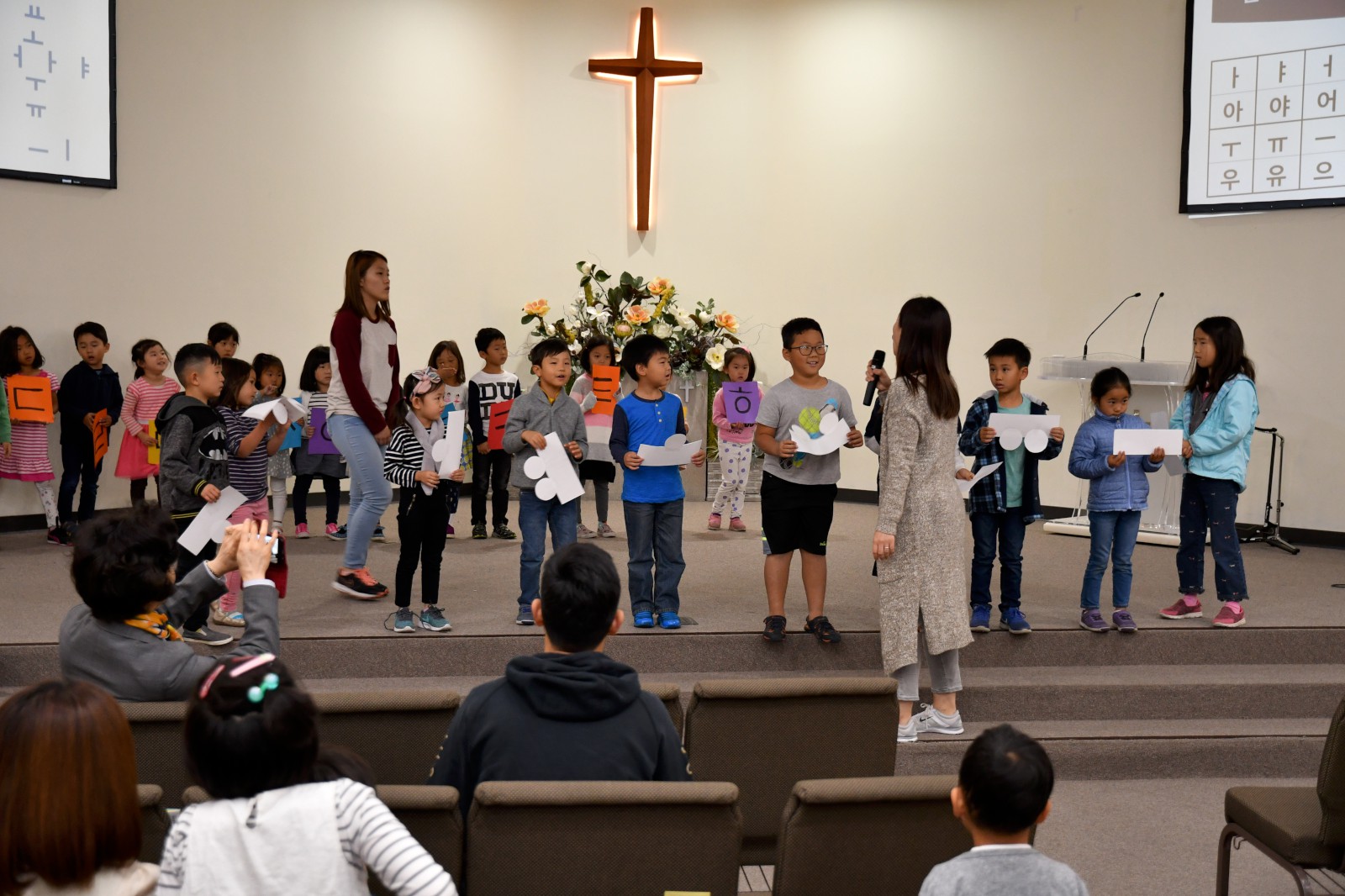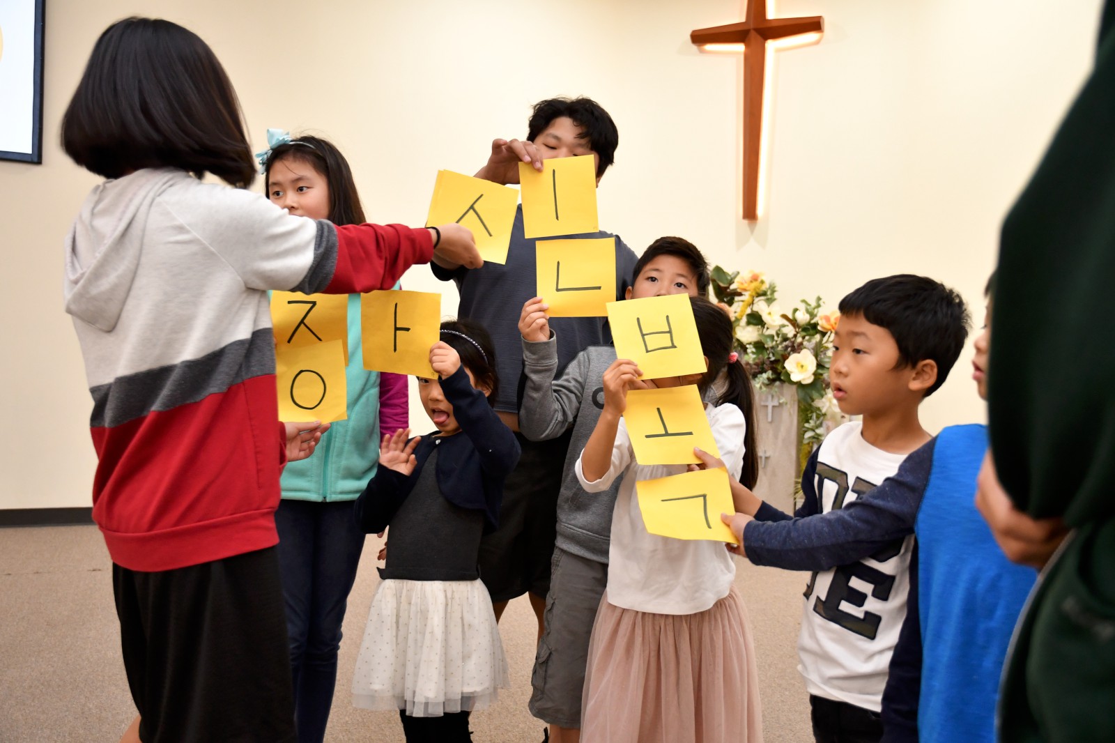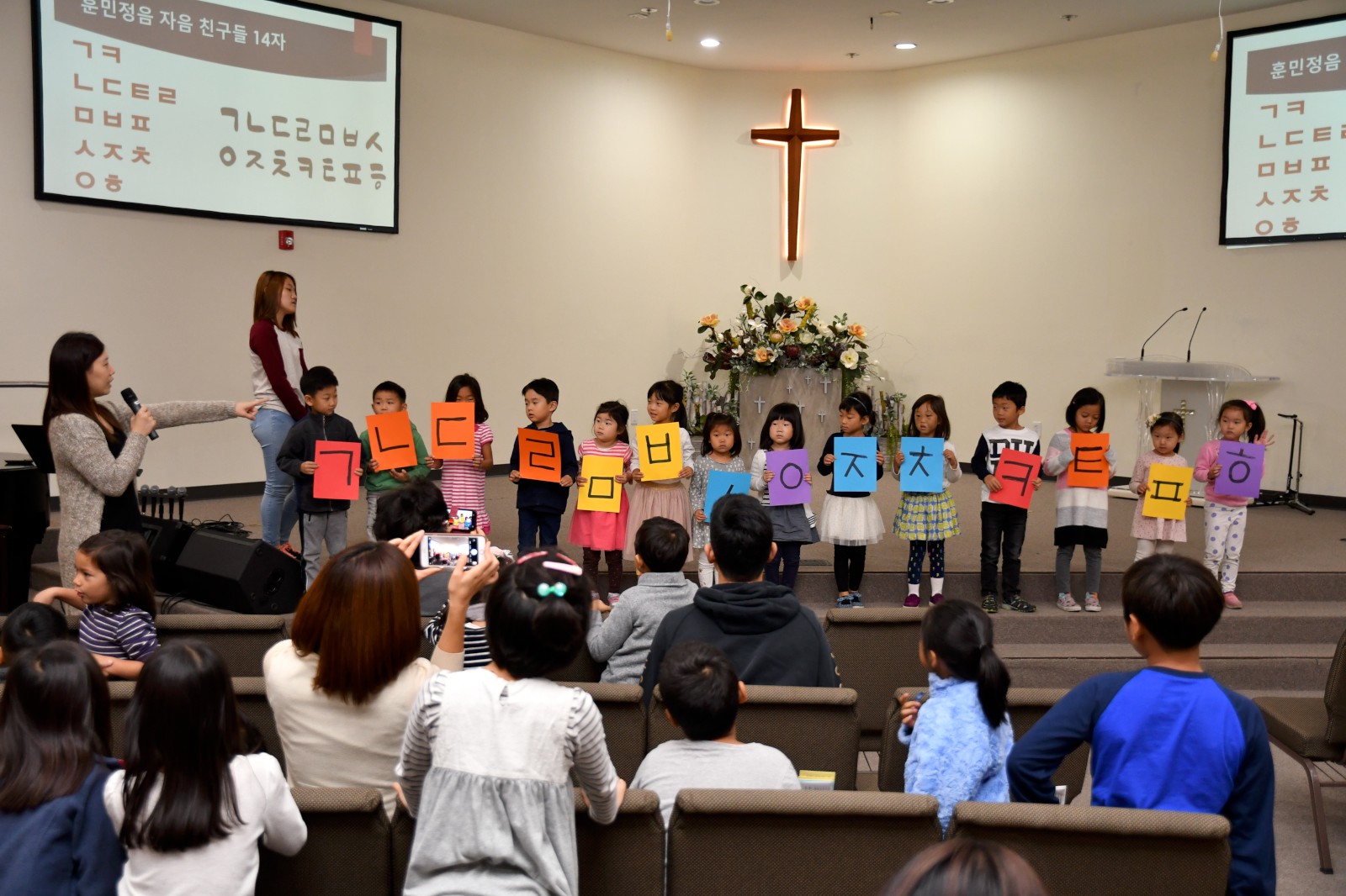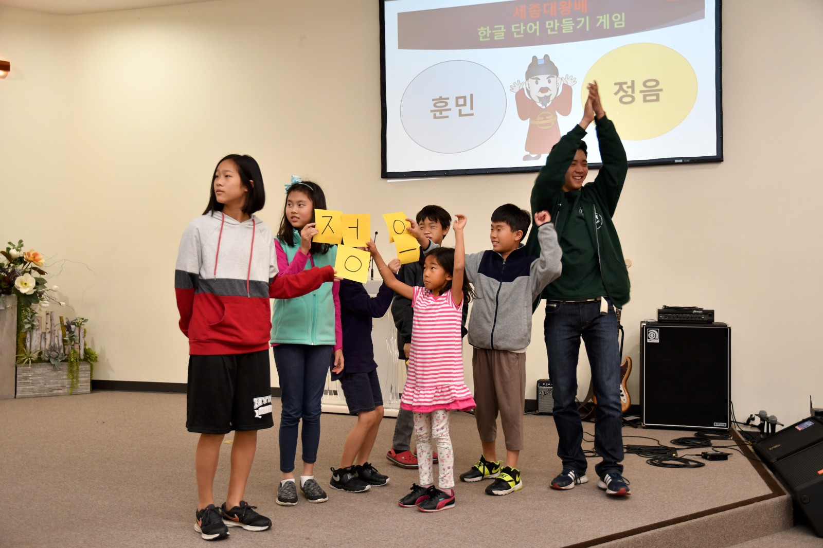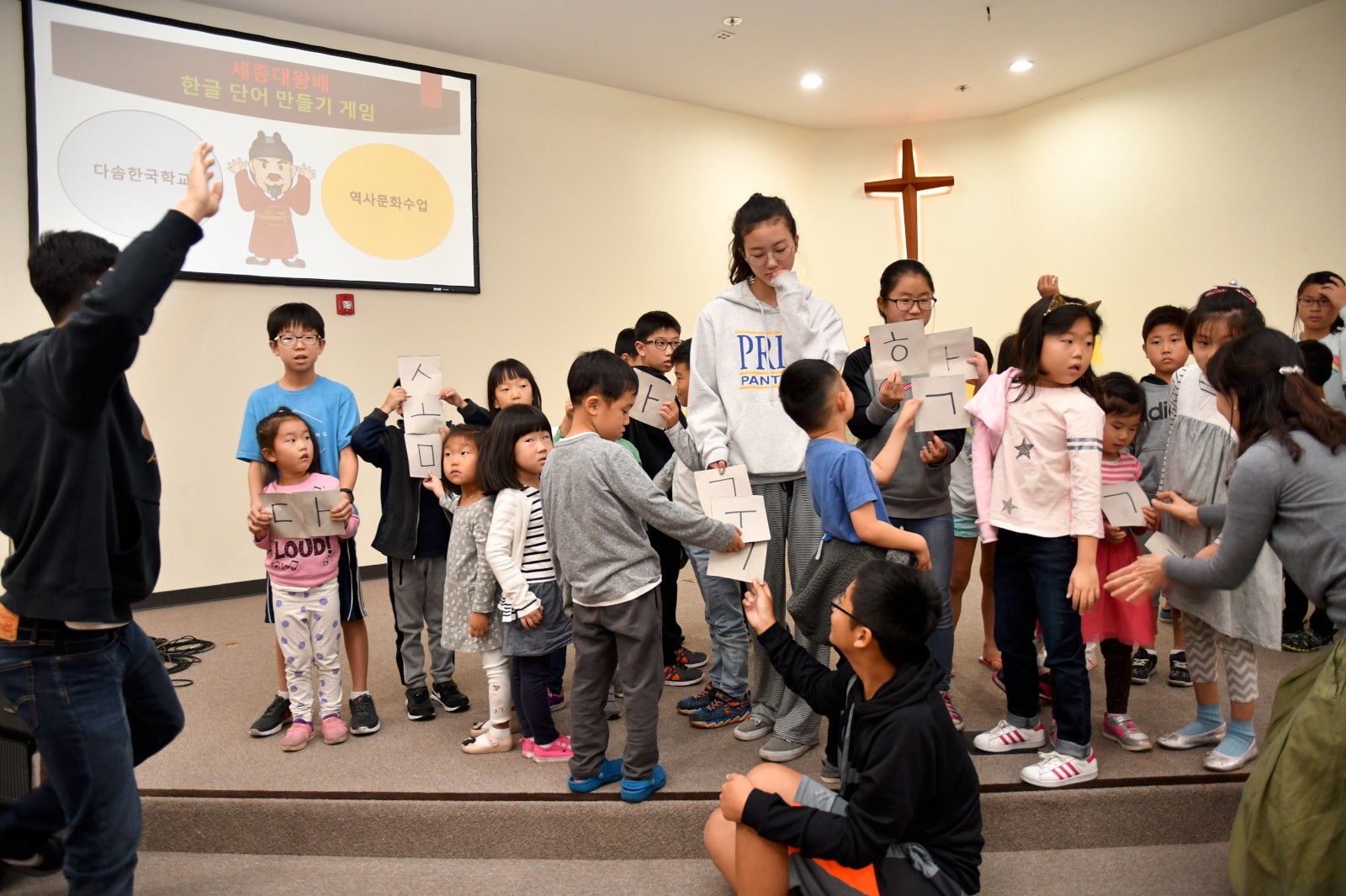어린 학생들과 큰 반 학생들이 팀을 이루어 글자 만들기 게임에서 협동으로 글자를 만들어 보고 “백성을 가르치는 바른 소리~”로 시작되는 한글 노래를 배우며 수업을 마쳤다. 앞으로 3주 동안 학생들은 각 반의 수준에 맞는 학습지를 통해 <훈민정음과 세종대왕>에 관하여 더 자세히 공부하게 된다.