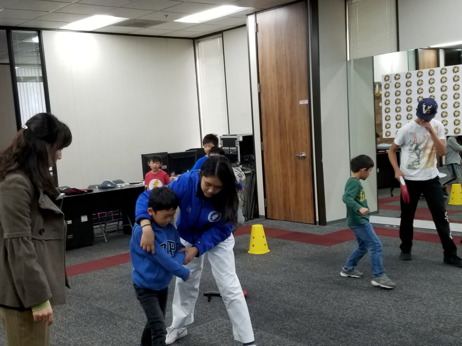 원은경 교감선생님이 감독을 하시고 미국 국가 대표 선수인 배정은 학생이 담당하고 있는 태권도반 수업 모습입니다.