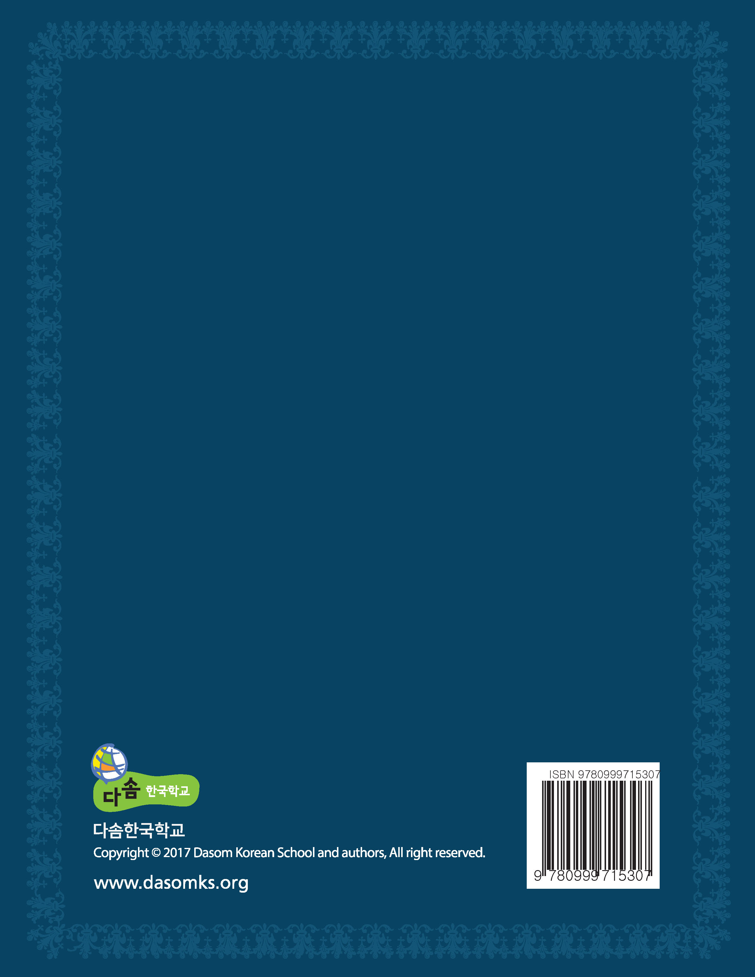 책을 앞면과 뒷면을 찍어 보았습니다. 다솜한국학교 로고와 ISBN이 선명하게 잘 보입니다. 인쇄를 맡아주셔서 멋지게 인쇄해주신 Better Yearbook 이민섭 대표님께 감사합니다.