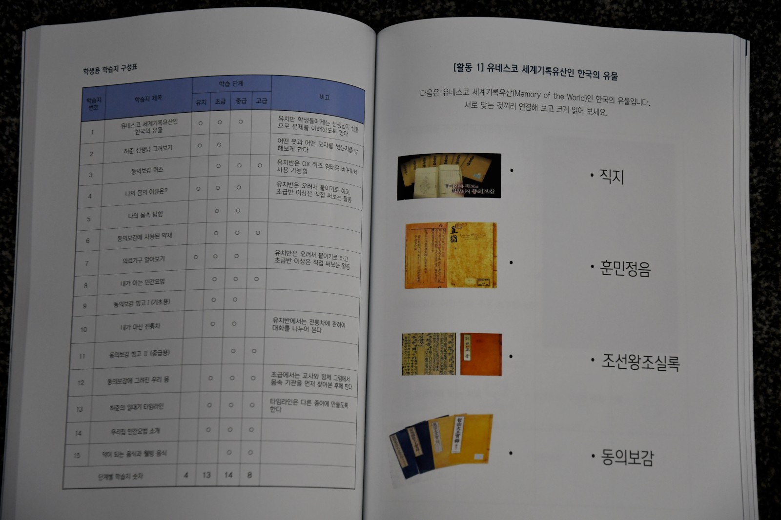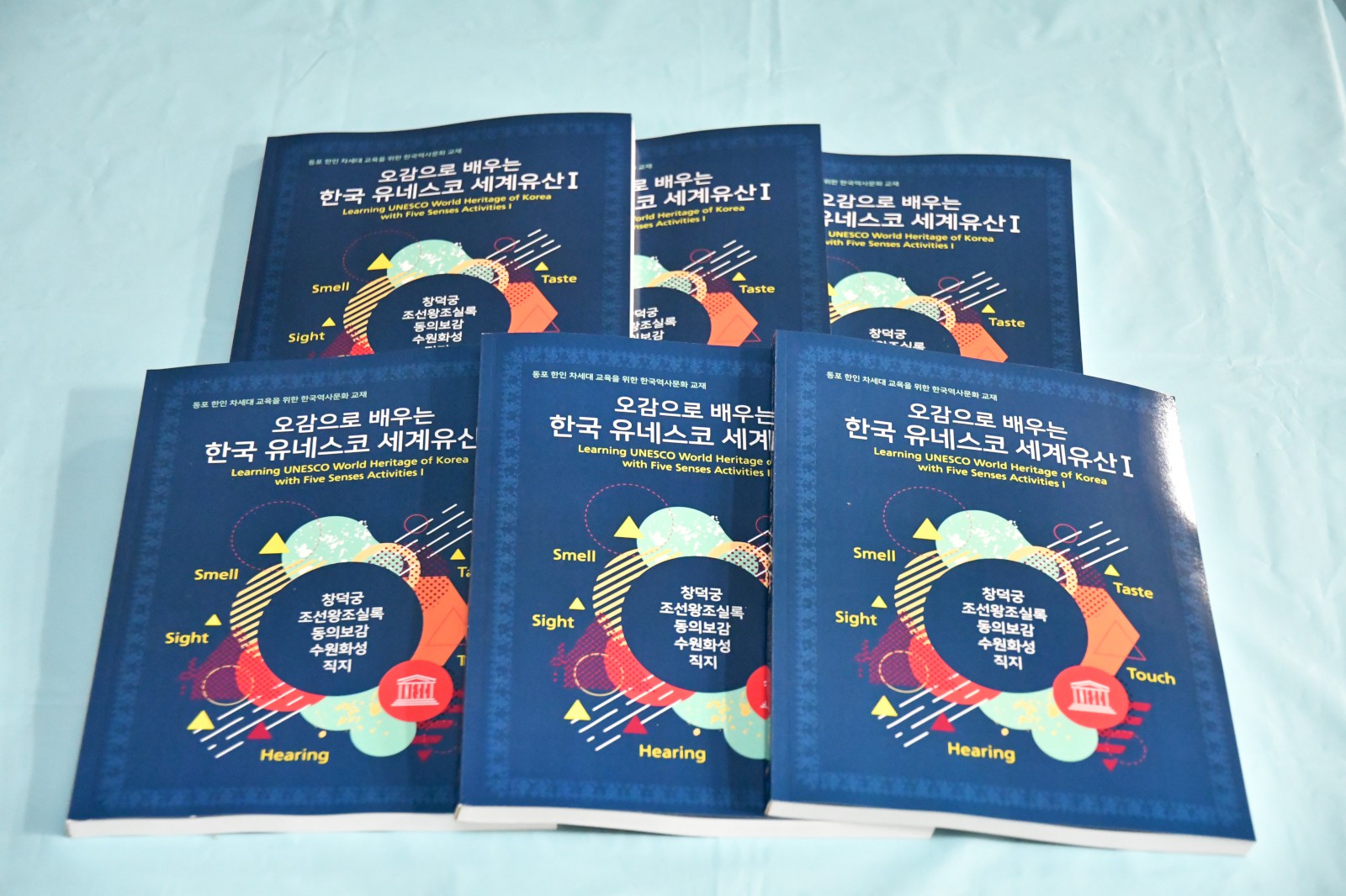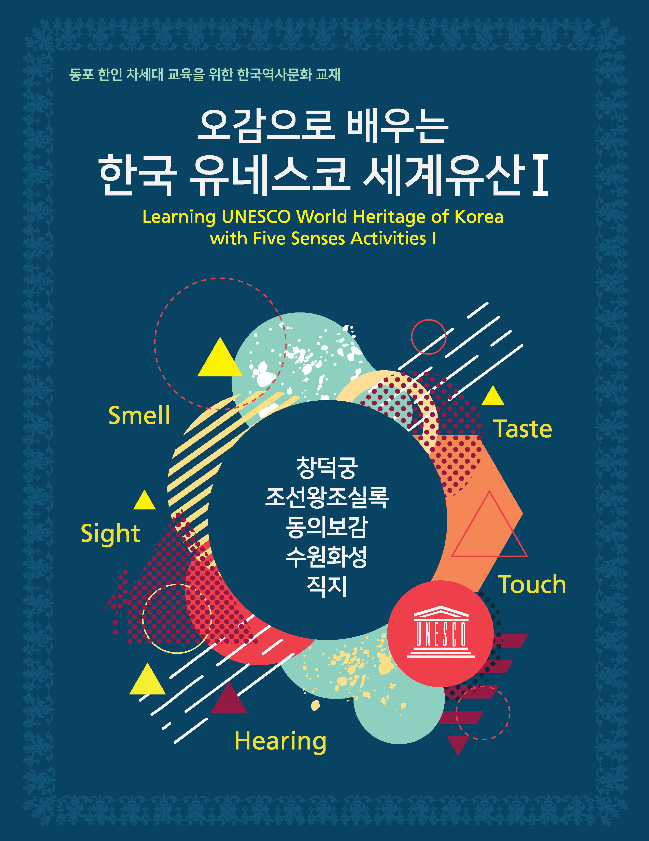 총 250페이지 (ISBN 978-0-9997153-0-7) 분량의 교재에는 ‘창덕궁과 조선의 궁궐 생활, 조선왕조실록과 임금님의 이야기, 동의보감과 허준의 일생, 수원화성과 정조대왕, 직지와 잃어버린 유산을 찾아서’등 5개의 단원으로 구성되어 있습니다. 각 단원별로 학습 목표와 내용, 그리고 4차시의 강의 계획안과 동영상 목록, 역할극 대본, 전체 활동 계획, 퀴즈, 단어 카드 및 참고 자료 등을 포함하는 교수 학습 계획안, 전체 강의용 파워포인트, 유치, 초급, 중급, 고급으로 구성된 학생용 학습지 등이 나와 있으며 부록으로는 학습지 답안과 단어 목록이 한글과 영어로 되어 있다. 마지막으로 본교에서 학습한 활동 내용과 사진을 첨부하였습니다.