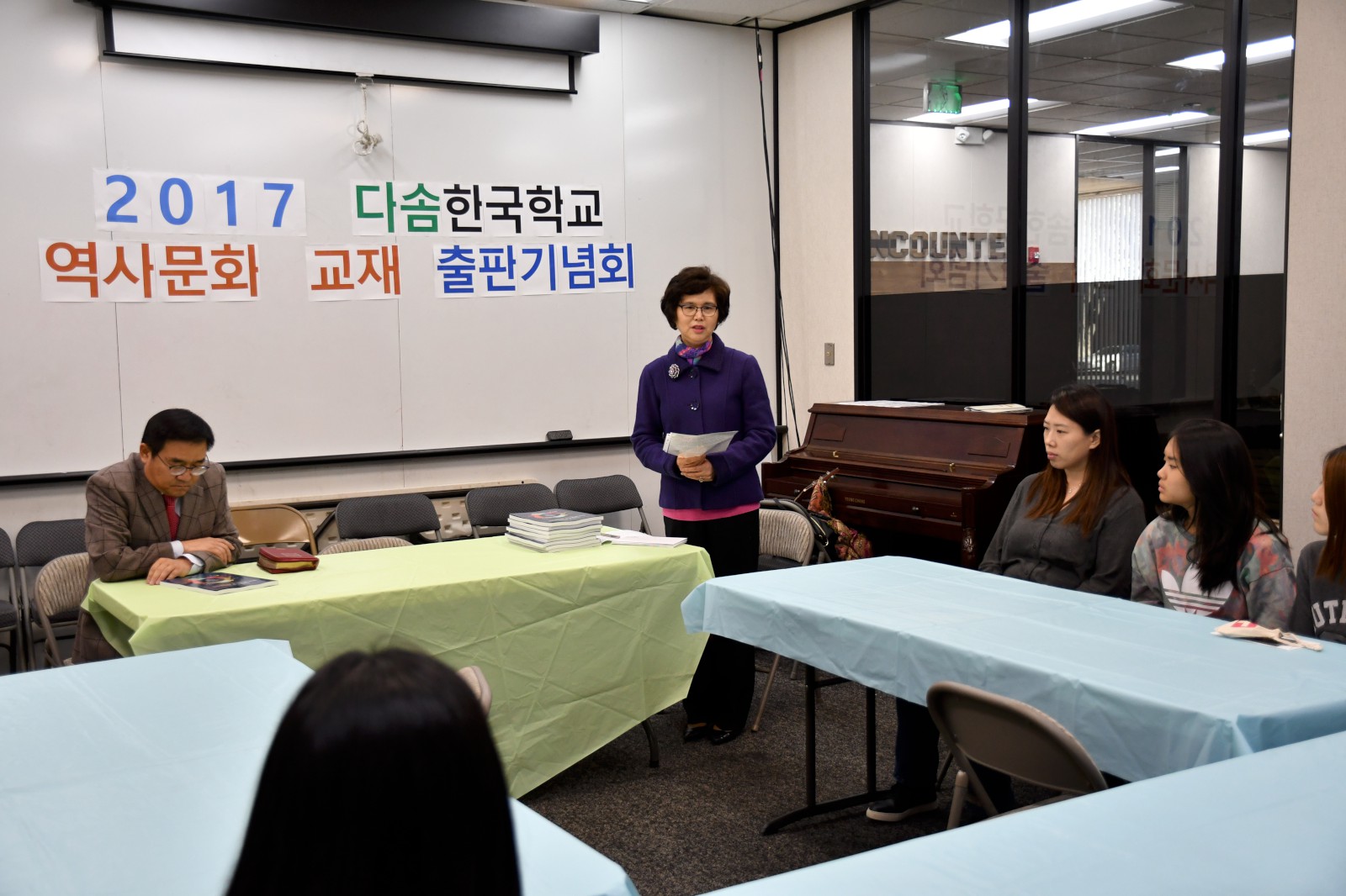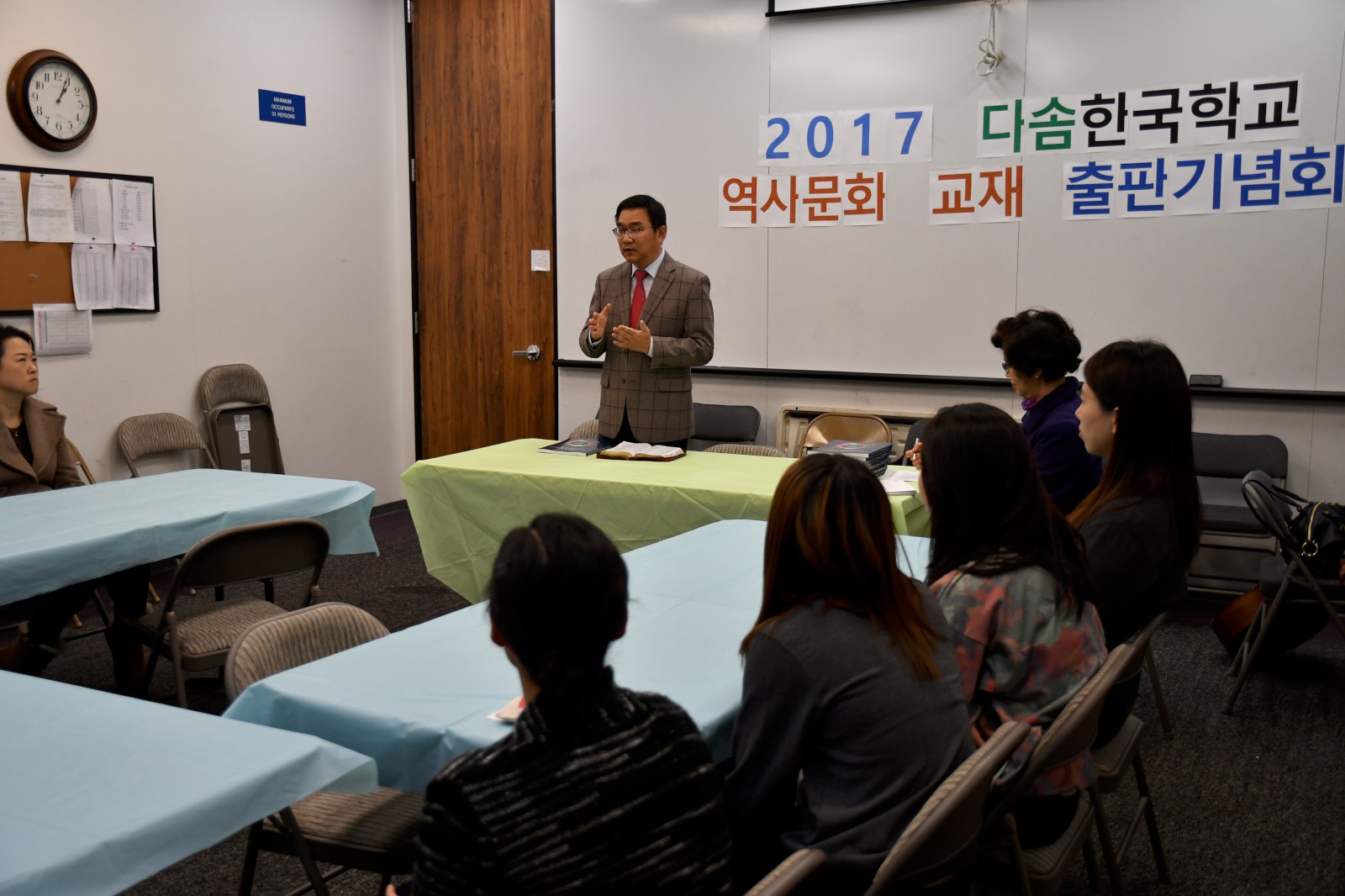 사진에서는 산호세한인장로교회 박석현 목사님께서 축하의 인사와 함께 시편 77편 1절~20절 말씀으로 말씀을 전해 주고 계십니다. 옛적의 하나님의 말씀을 기억하고 역사를 통해서 옛것을 기억해야 오늘날 문제의 실마리가 보이기 시작하고 삶의 태도가 바뀐다고 하시며 재미한인으로 살아가는데 역사를 모르면 위축된 삶을 살 수 밖에 없다고 하셨습니다. 유대인들은 어떤 다른 민족보다 정체성 교육에 앞장서는데 그들이 중요하게 생각하는 성인식에서도 그들의 언어로 된 성경을 읽어야 한다며 이는 자신의 언어와 문화를 모르는 사람은 지도자가 될 수 없다는 것을 시사하는 것으로 우리 학생들에게 잘 가르쳐 주기를 당부하셨습니다. 다솜한국학교가 발행인으로 책이 나온 것은 대단한 일이라고 격려해 주시고 앞으로도 바른 정체성 교육에 앞장서 달라고 부탁하셨습니다. 목사님의 격려의 말씀에 모두 공감하고 경청했습니다.