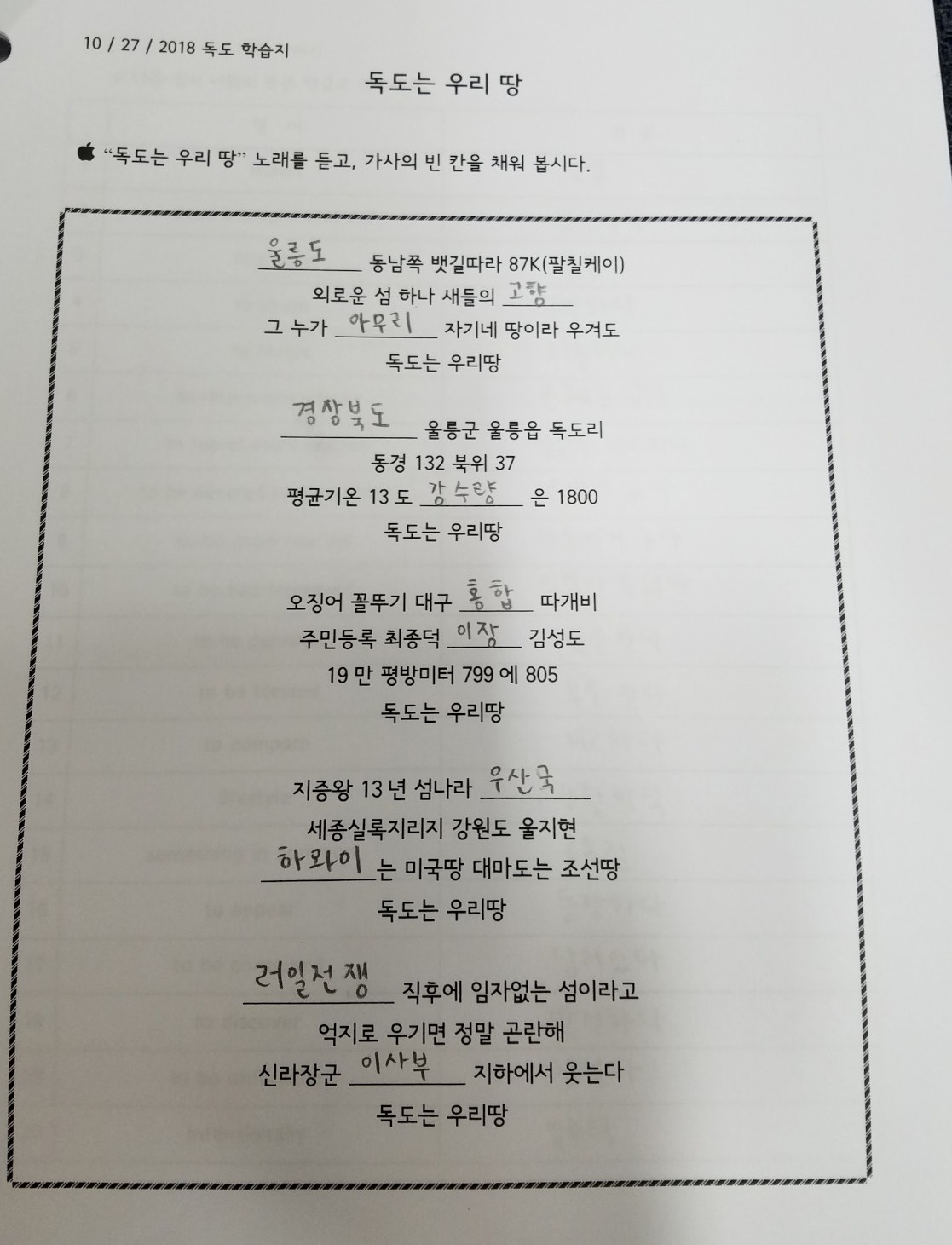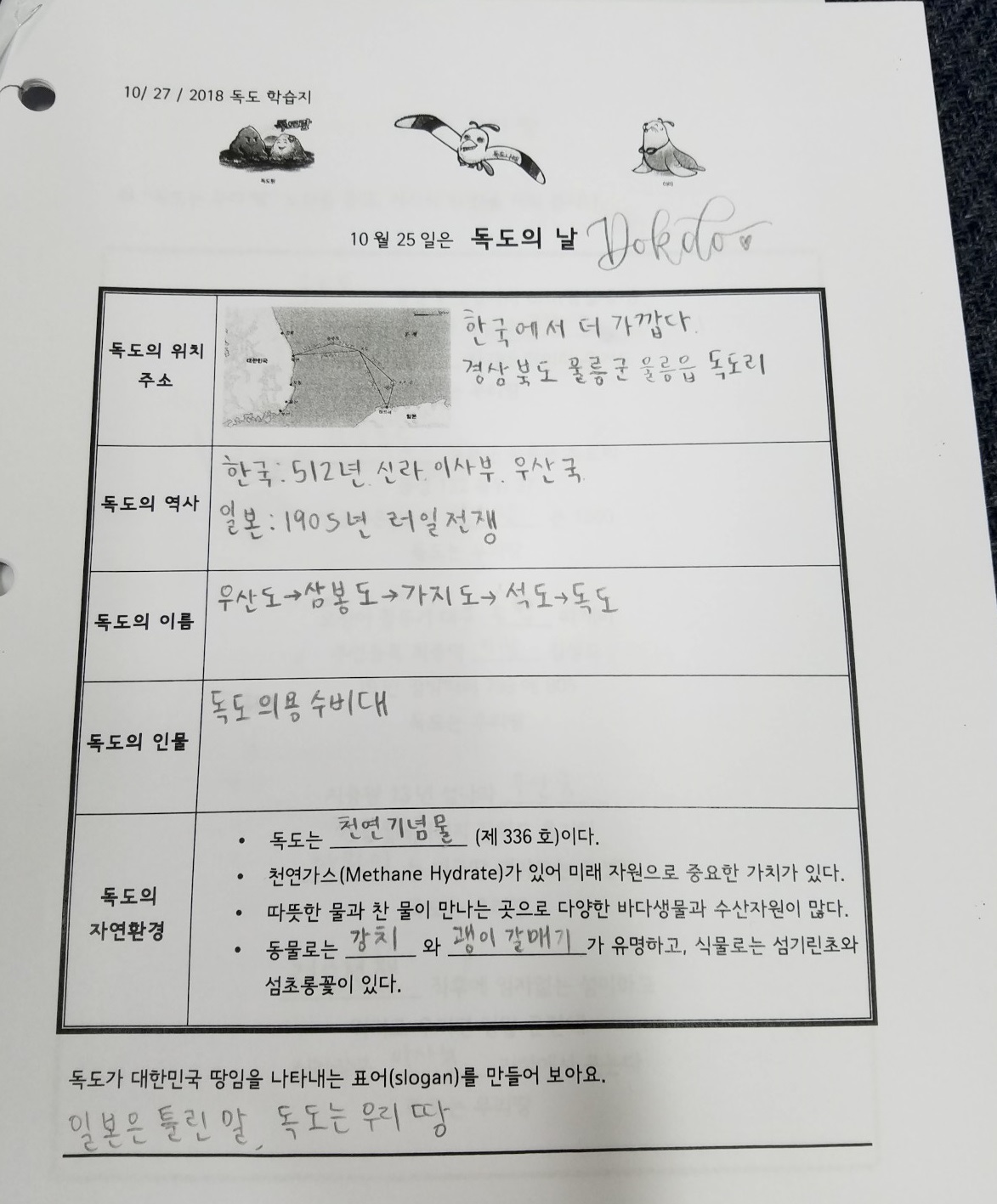 지난 10월 27일에는 독도의 날을 기념하여 모든 학생들이 독도 티셔츠를 입고 독도에 관하여 공부하였습니다.
