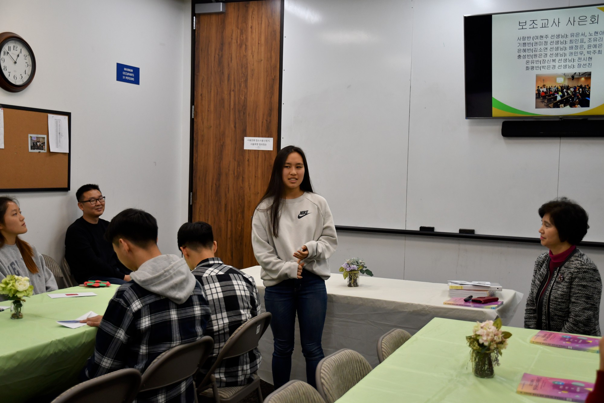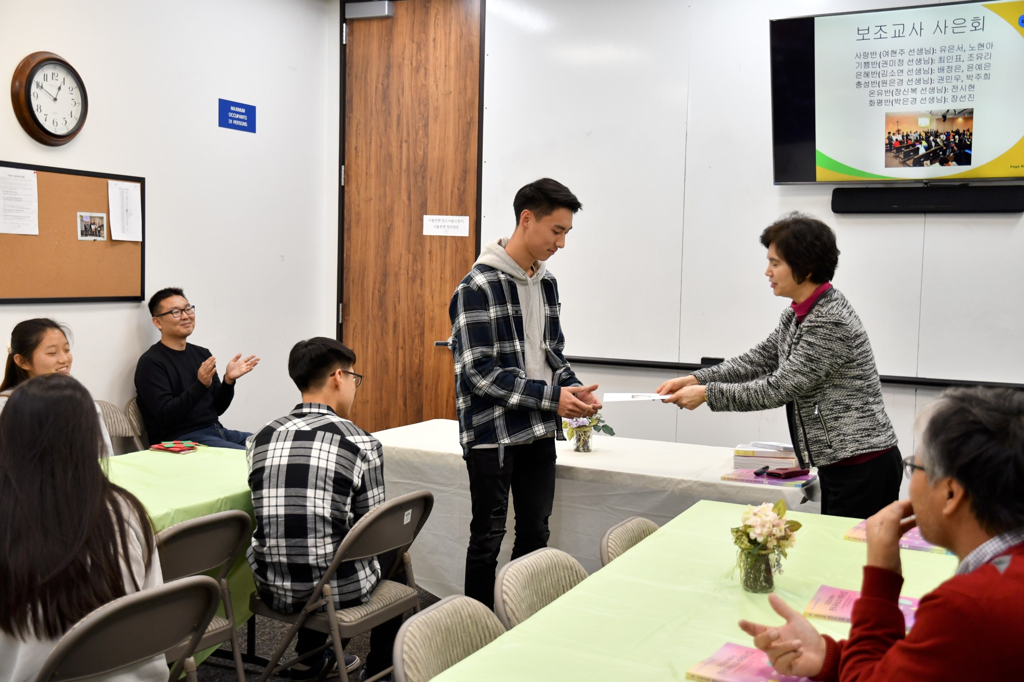 교사 사은회에서는 담임 교사와 보조교사 소개, 보조교사들의 지난 1년 회고 그리고 담임 교사의 칭찬으로 이어졌습니다. 보조교사들은 처음에 힘들었고 열심히 하지 않는 학생들 때문에 지치기도 했지만 1년 혹은 한 학기를 지내면서 학생들과 친해지고 이해도 더 많이 하게 되었다고 했습니다. 또한 담임 선생님들이 얼마나 학생 지도를 위해 애쓰시는지도 알게 되었다고 대견스러운 모습을 보여 주였습니다.