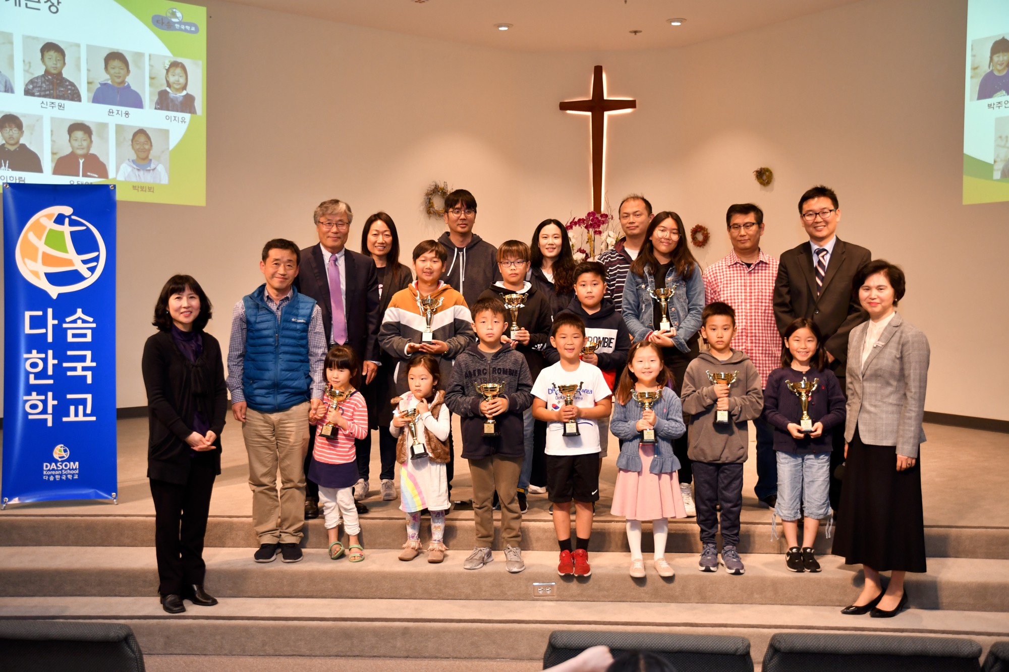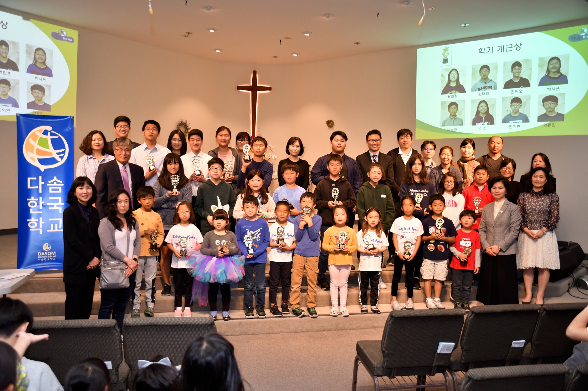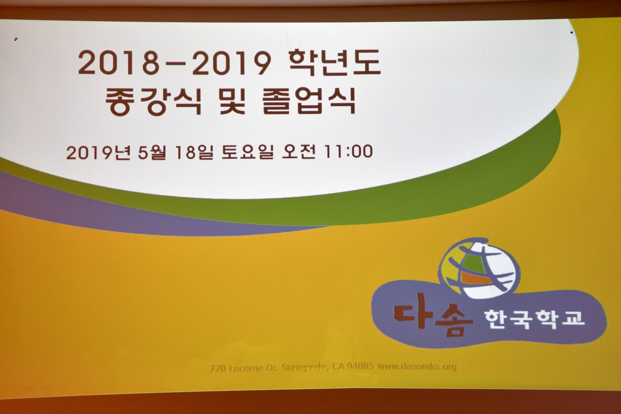 모두 함께 다솜한국학교 2018-2019학년도 동영상을 감상한 후에, 1년 동안 한국학교에서 교사들을 돕고 학생들의 형, 누나의 역할을 한 보조교사들에게 대통령봉사상과 이사장상 및 장학금이 수여되었습니다. 고등학교를 졸업하고 대학교로 떠나는 보조교사들에게는 특별 장학금이 수여되었습니다. 모범상, 우등상, 학기 개근상 및 1년 개근상을 수여하였습니다. 학부모회에도 감사의 시간을 가졌습니다. 2018-2019학년도 개강 일시 및 등록 방법에 관한 광고를 한 후에 종강식을 마쳤습니다.