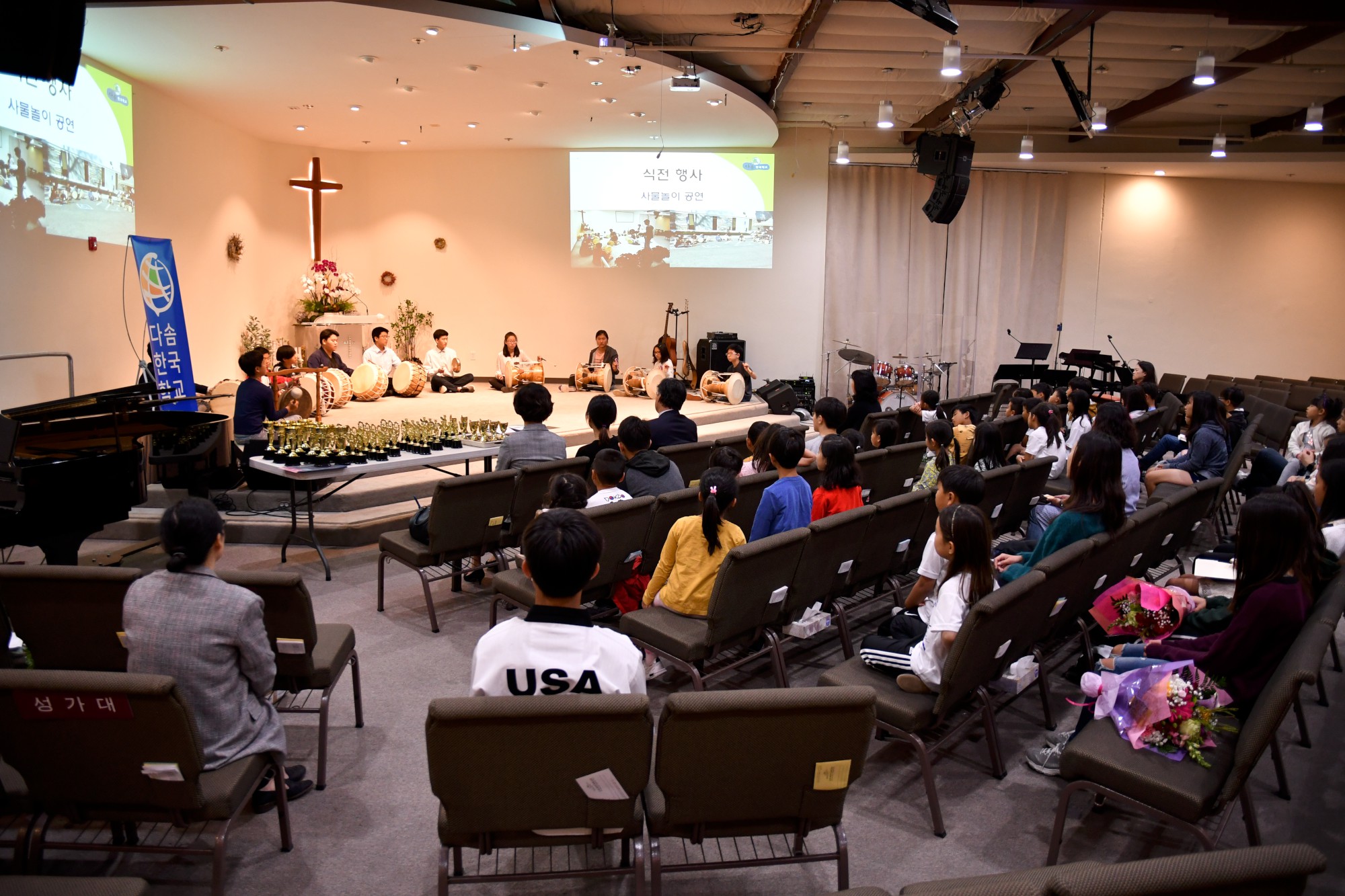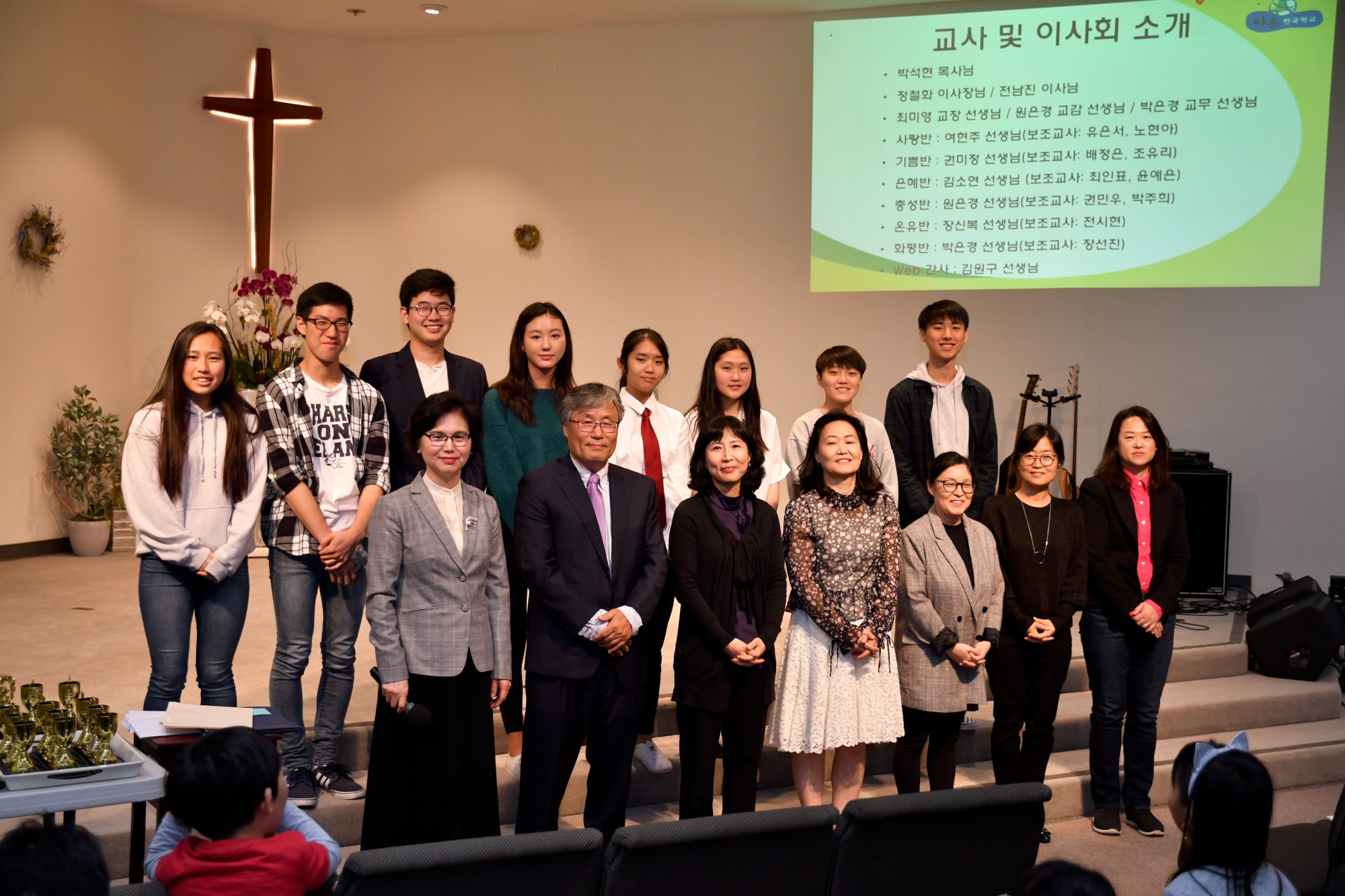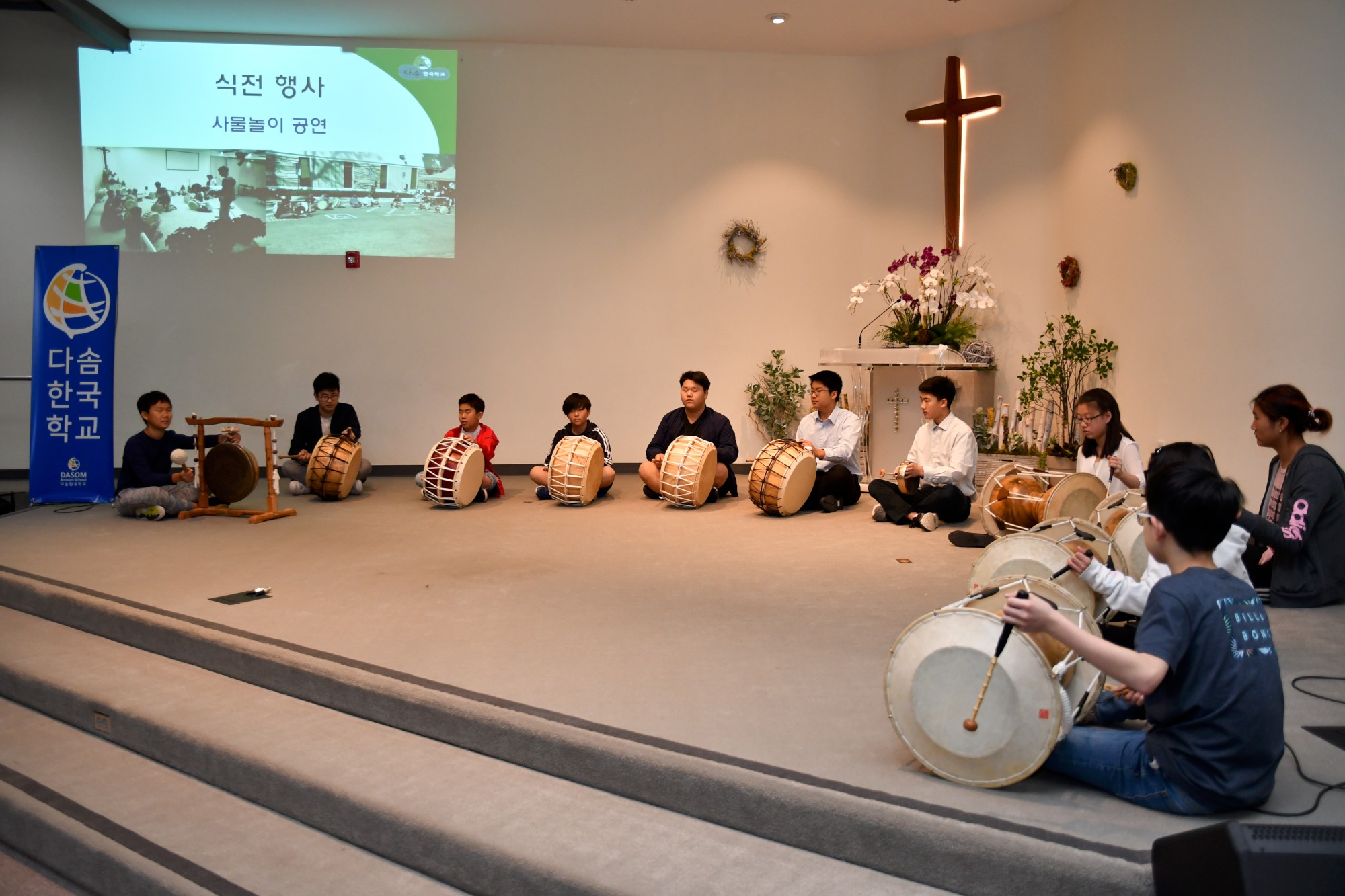 모두 함께 다솜한국학교 2018-2019학년도 동영상을 감상한 후에, 1년 동안 한국학교에서 교사들을 돕고 학생들의 형, 누나의 역할을 한 보조교사들에게 대통령봉사상과 이사장상 및 장학금이 수여되었습니다. 고등학교를 졸업하고 대학교로 떠나는 보조교사들에게는 특별 장학금이 수여되었습니다. 모범상, 우등상, 학기 개근상 및 1년 개근상을 수여하였습니다. 학부모회에도 감사의 시간을 가졌습니다. 2018-2019학년도 개강 일시 및 등록 방법에 관한 광고를 한 후에 종강식을 마쳤습니다.