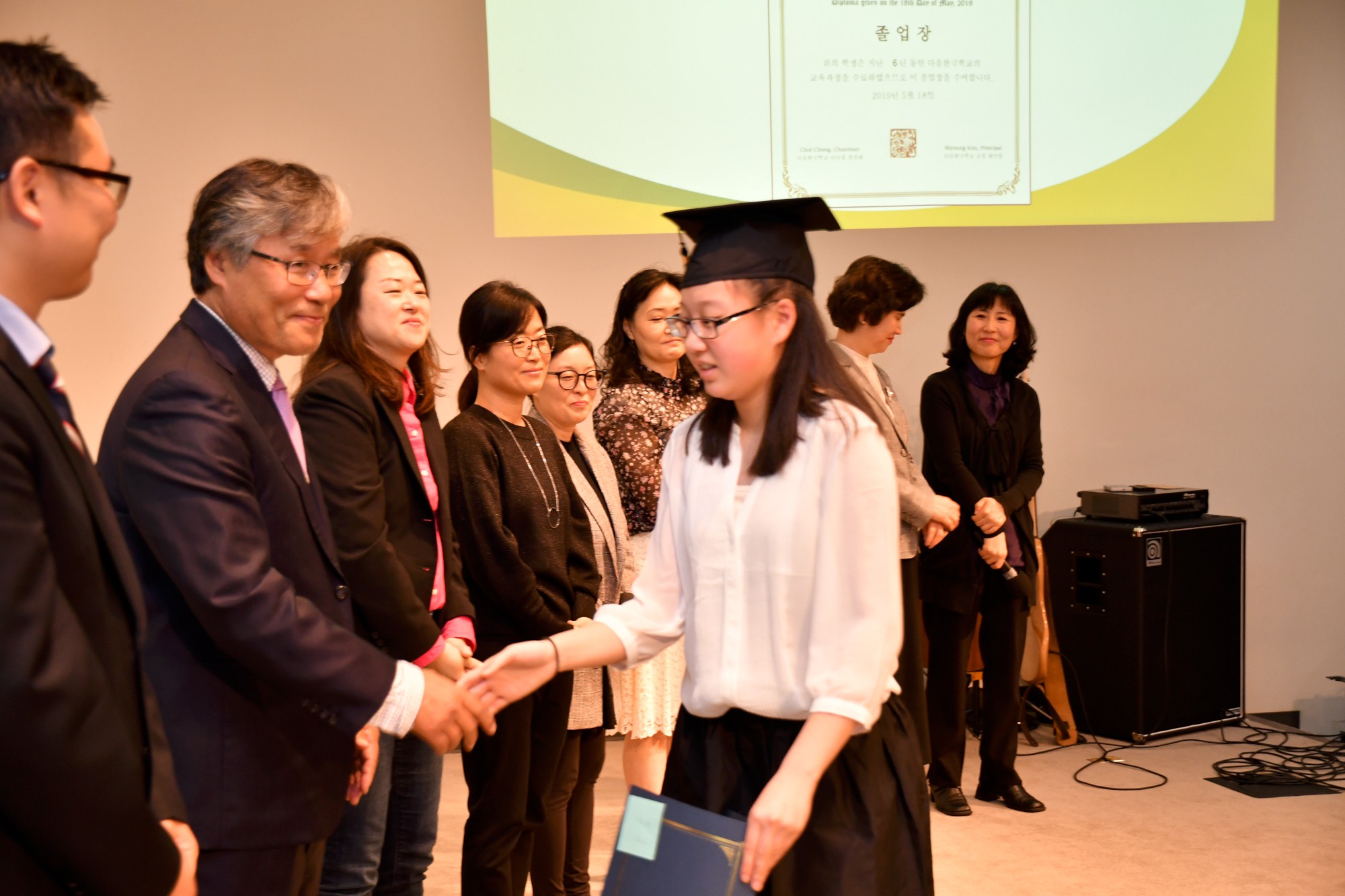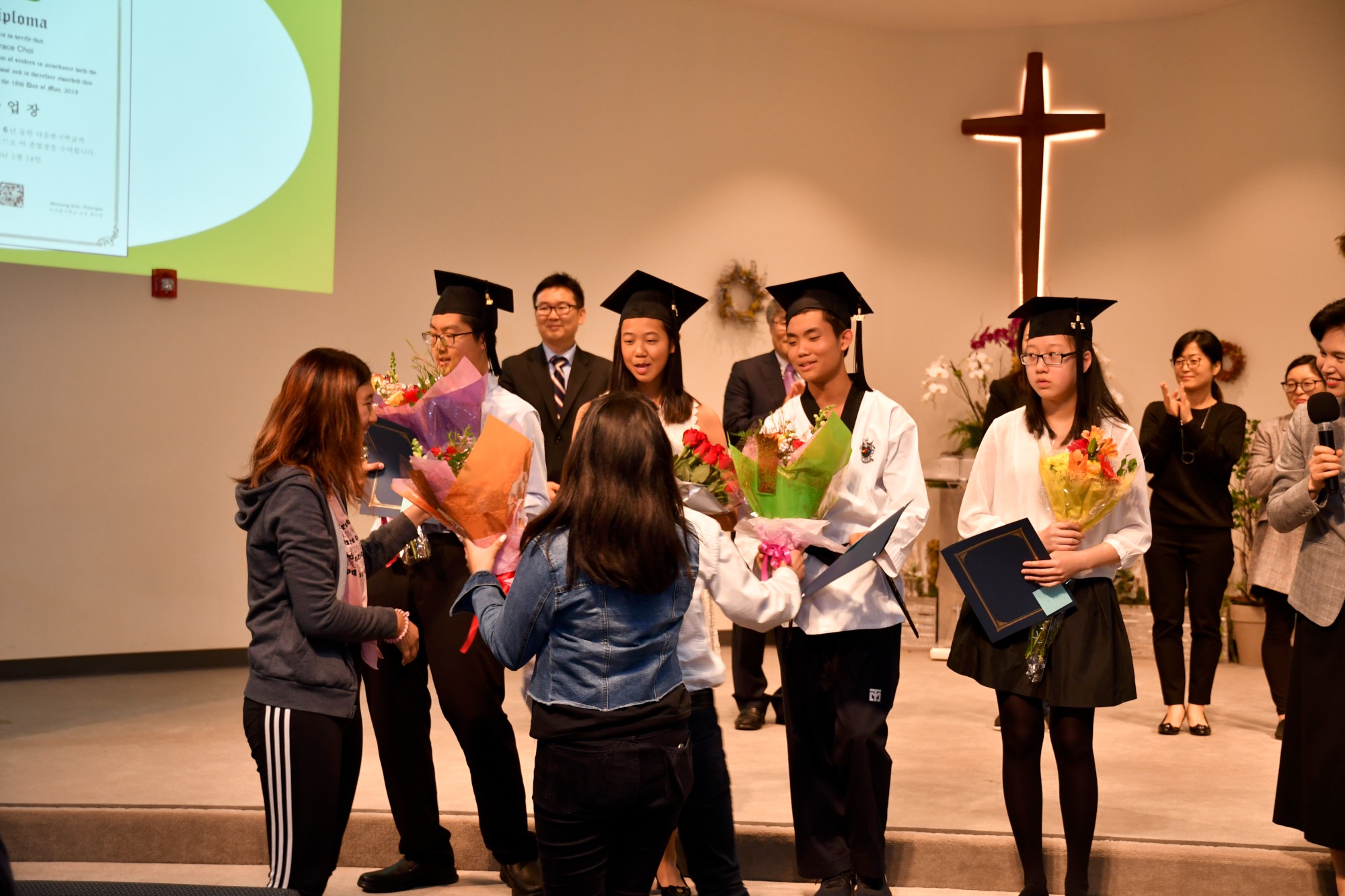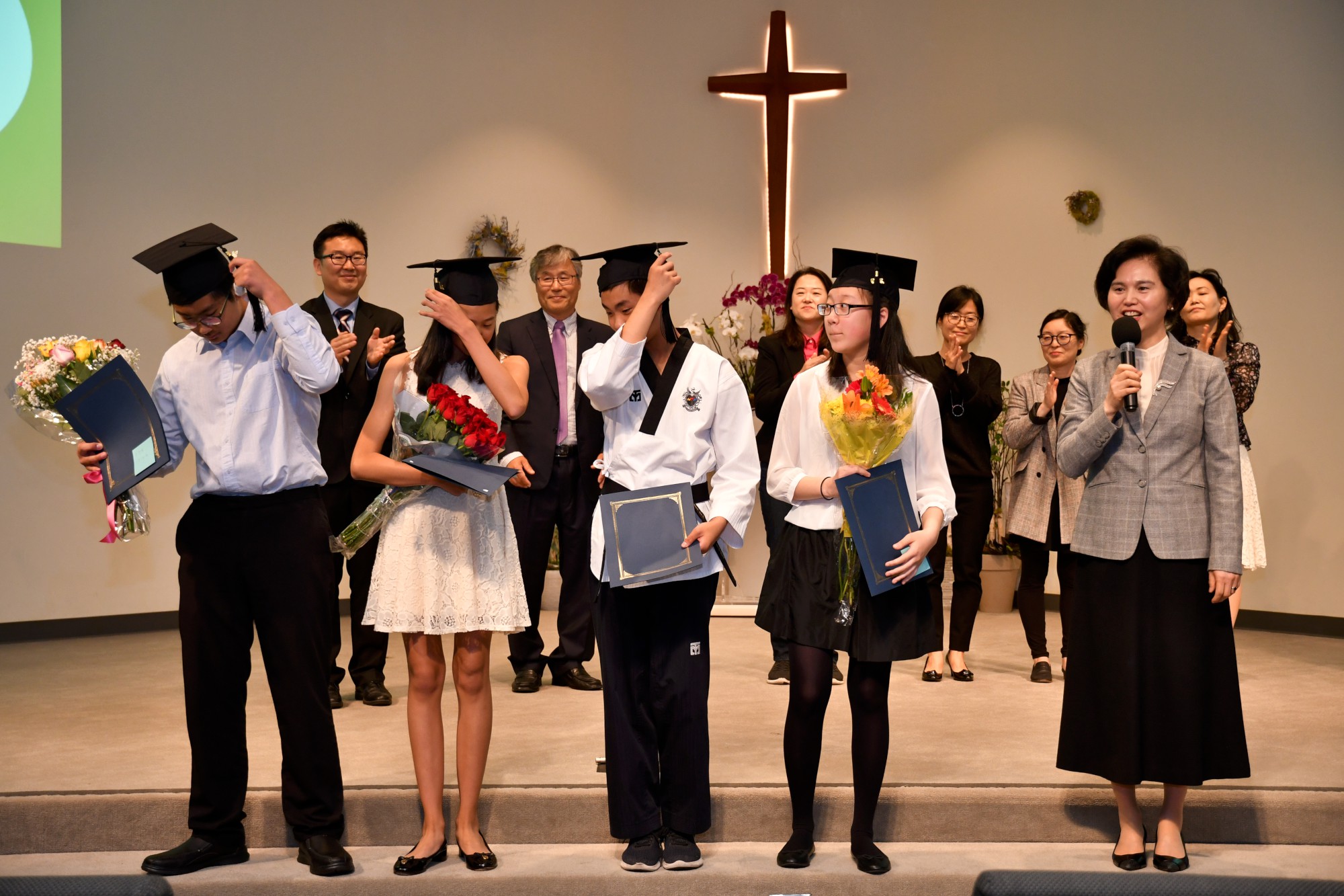 각 졸업생이 한 명씩 단상에 올라와 교장 선생님이 수여하는 졸업장을 받았습니다. 단상에 서 계시는 선생님들과 악수나 허그를 하며 졸업하는 기쁨을 나누었습니다. 모든 학생이 다 졸업장을 받은 후에 교장 선생님이 졸업을 선포하고 학생들은 자신의 오른편에 놓였던 태슬을 왼편으로 넘겼습니다.