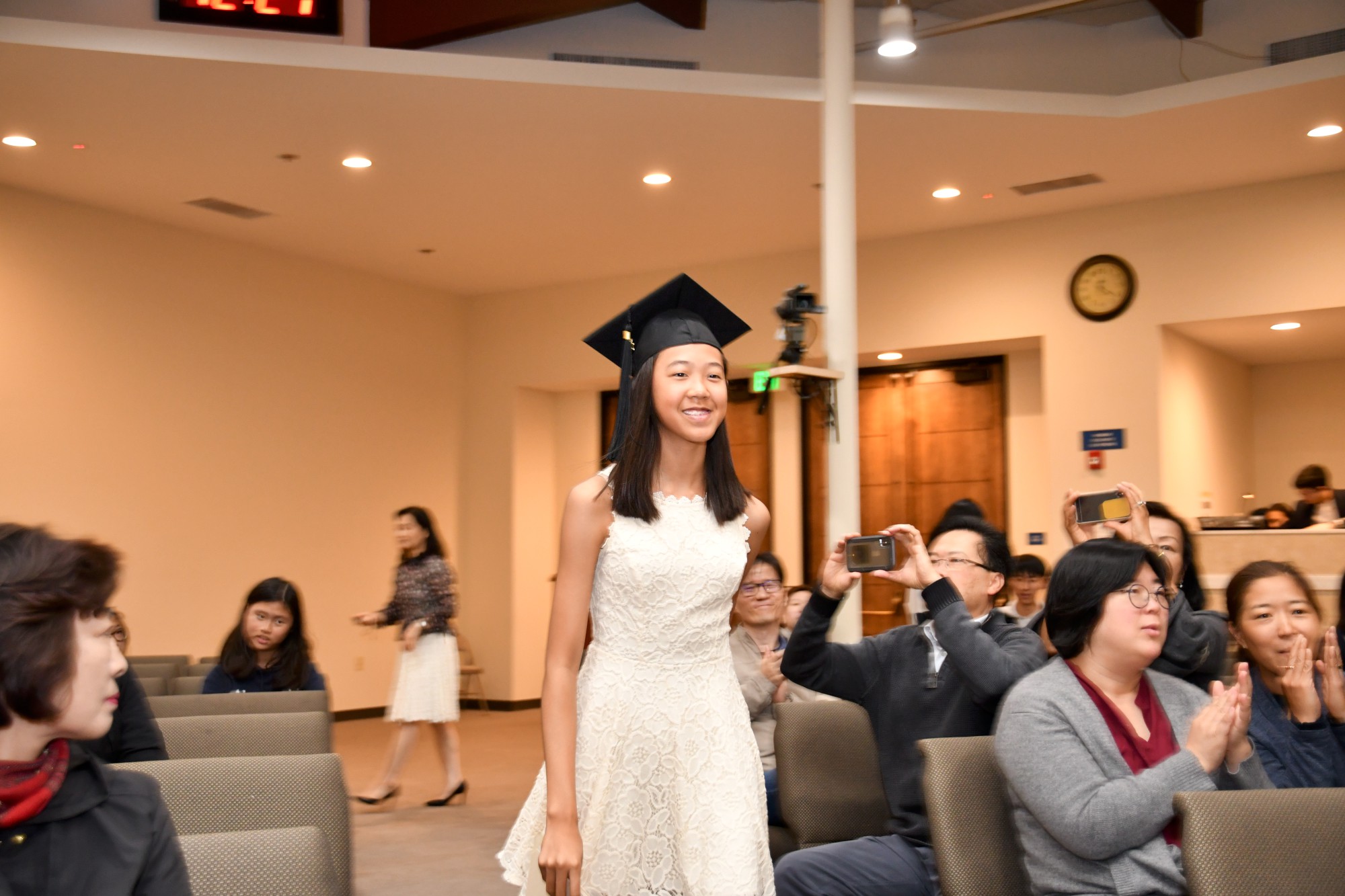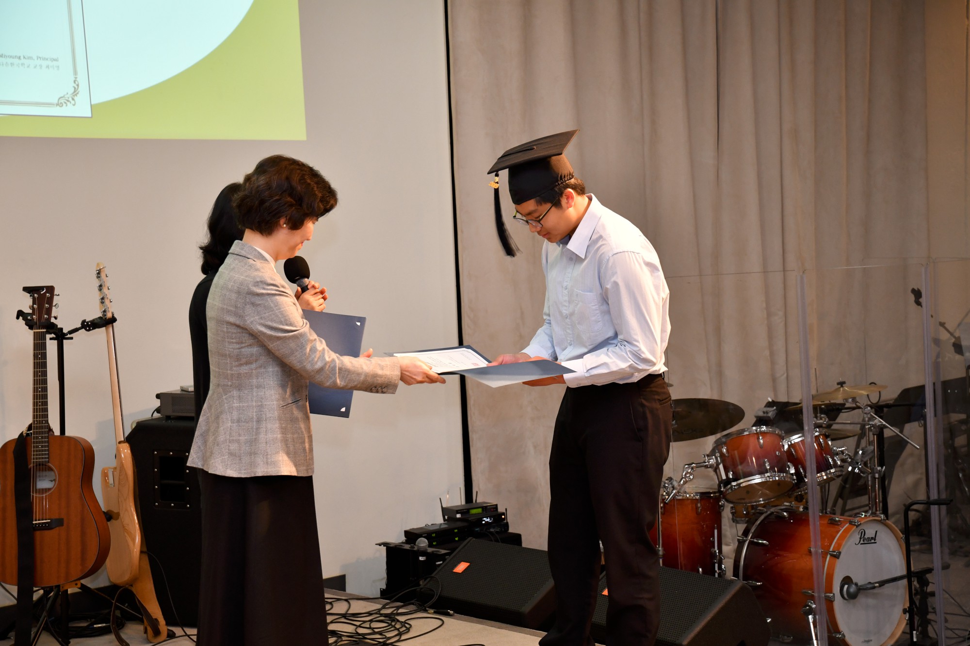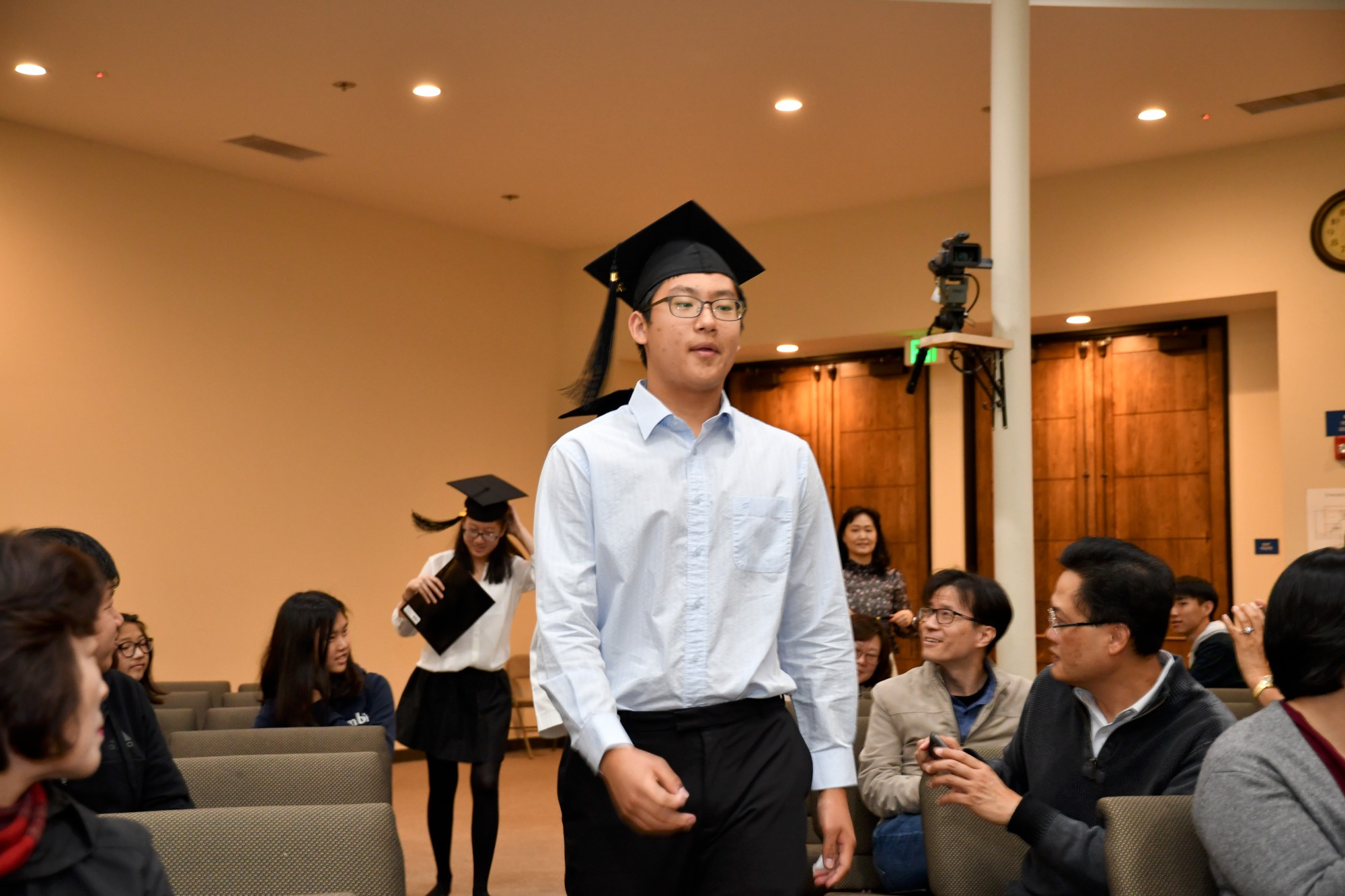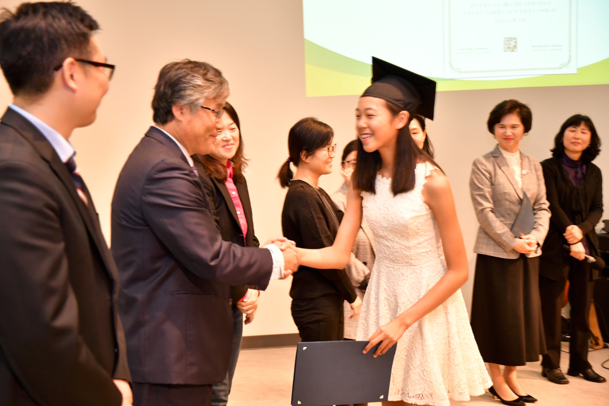 각 졸업생이 한 명씩 단상에 올라와 교장 선생님이 수여하는 졸업장을 받았습니다. 단상에 서 계시는 선생님들과 악수나 허그를 하며 졸업하는 기쁨을 나누었습니다. 모든 학생이 다 졸업장을 받은 후에 교장 선생님이 졸업을 선포하고 학생들은 자신의 오른편에 놓였던 태슬을 왼편으로 넘겼습니다.