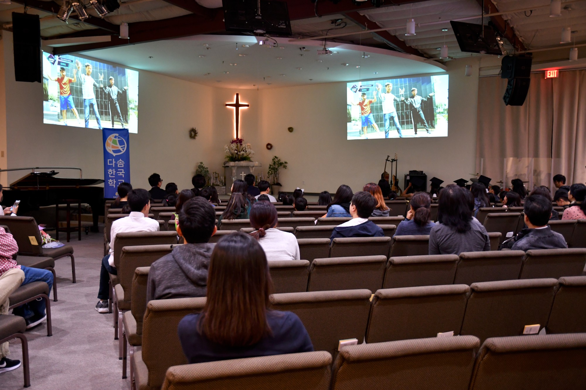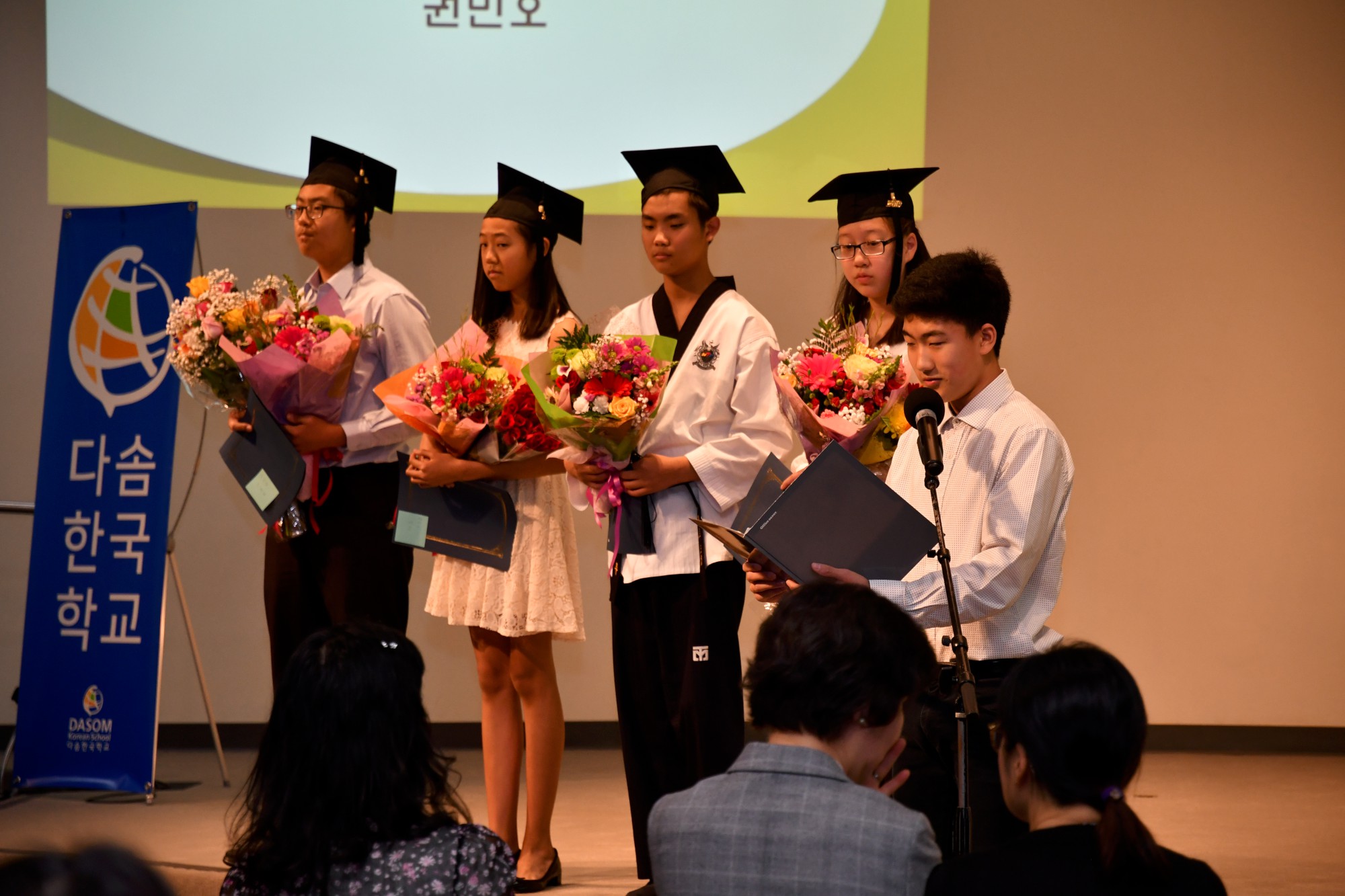 2019학년도 졸업식은 5명의 졸업생이 졸업 모자를 쓰고 <위풍당당 행진곡>에 맞추어 입장하는 것으로 시작되었습니다. 졸업생이 지정된 좌석에 착석한 후에 다솜에서 지냈던 모습을 담은 슬라이드 쇼를 감상했습니다. 이번에 졸업하는 5명의 학생은 2년에서 12년까지 학교에 다녔습니다.