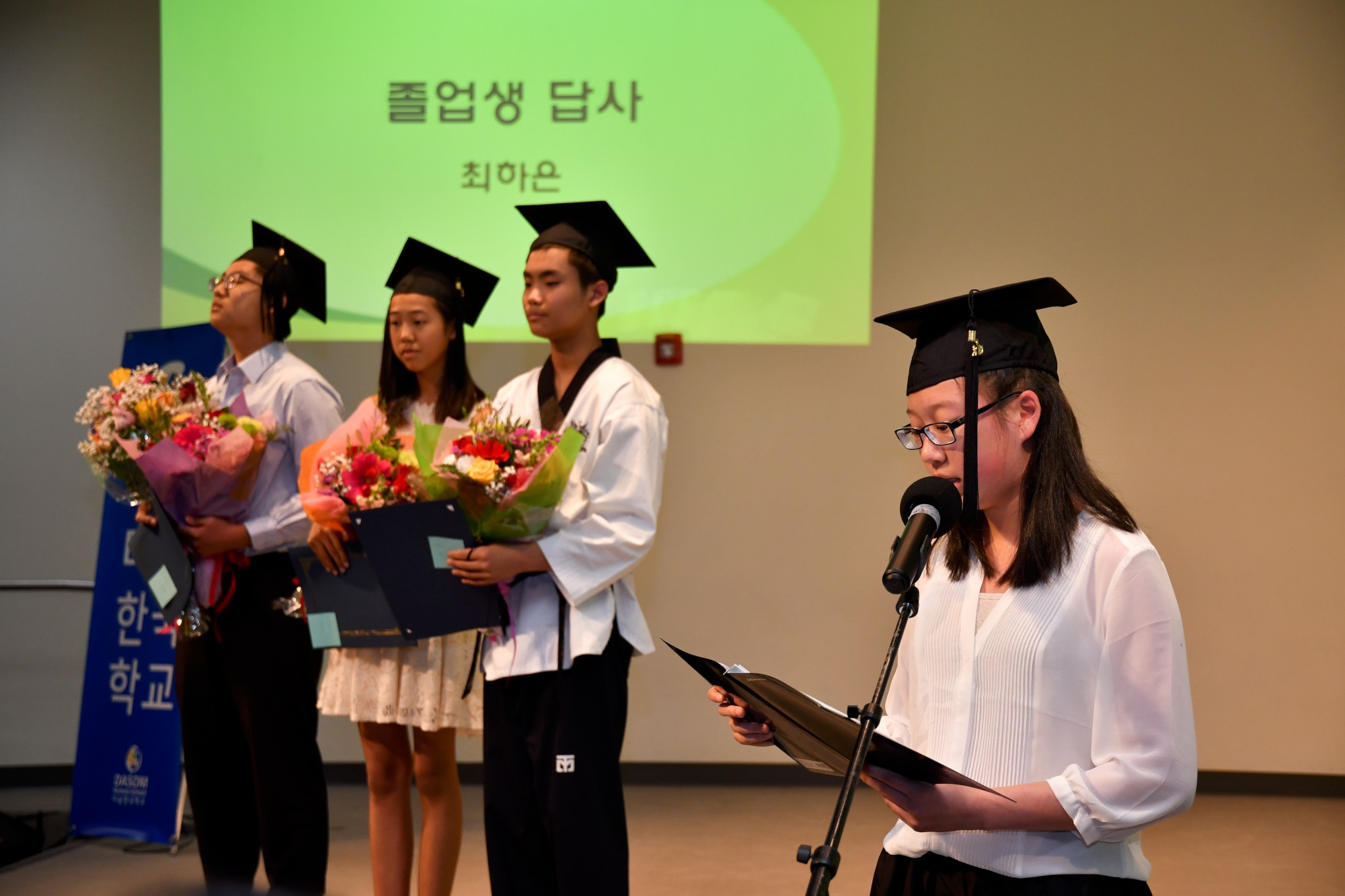 동영상에서 졸업생들은 자신이 다솜에서 즐거웠던 이야기를 나누었습니다. 어린 나이에 언니가 하는 부채춤을 함께 하고 싶어서 부채가 잘 쥐어지지도 않을 때에 배웠던 부채춤이 기억나며 이제는 부채를 자유자재로 다룰 수 있는 것처럼 한국 역사와 문화를 잘 배웠고 토요일은 한국학교에 오는 날임을 항상 기억하게 될 것이라는 학생, 사물놀이 팀에 들어가 장구를 배웠고 공연을 한 것이 가장 마음에 남는 다는 학생, 한국학교는 오래다니지 못했지만 설날 행사에 참여하여 전통놀이를 하고 차와 약과를 먹은 기억도 참 따뜻하고 좋았다는 것, 좋은 소리가 나는 사물놀이 북을 배우면서 연주를 하는 것이 참 좋았다고 했고, 태권도 반을 가르치며 어린 학생들을 가르치며 보람이 있었고 리더십을 배웠다고 하며 앞으로 보조교사로 돌아오겠다고 약속하기도 했습니다. 학생들은 좋은 추억과 이야기 거리를 만든 한국학교를 기억하며 선생님들과 친구들에게 고맙다는 인사를 전했습니다. 후배들에게 한국어를 배우는 것이 쉽지는 않지만 어린 때에 배워 놓으면 좋다고 조언도 아끼지 않았습니다.
