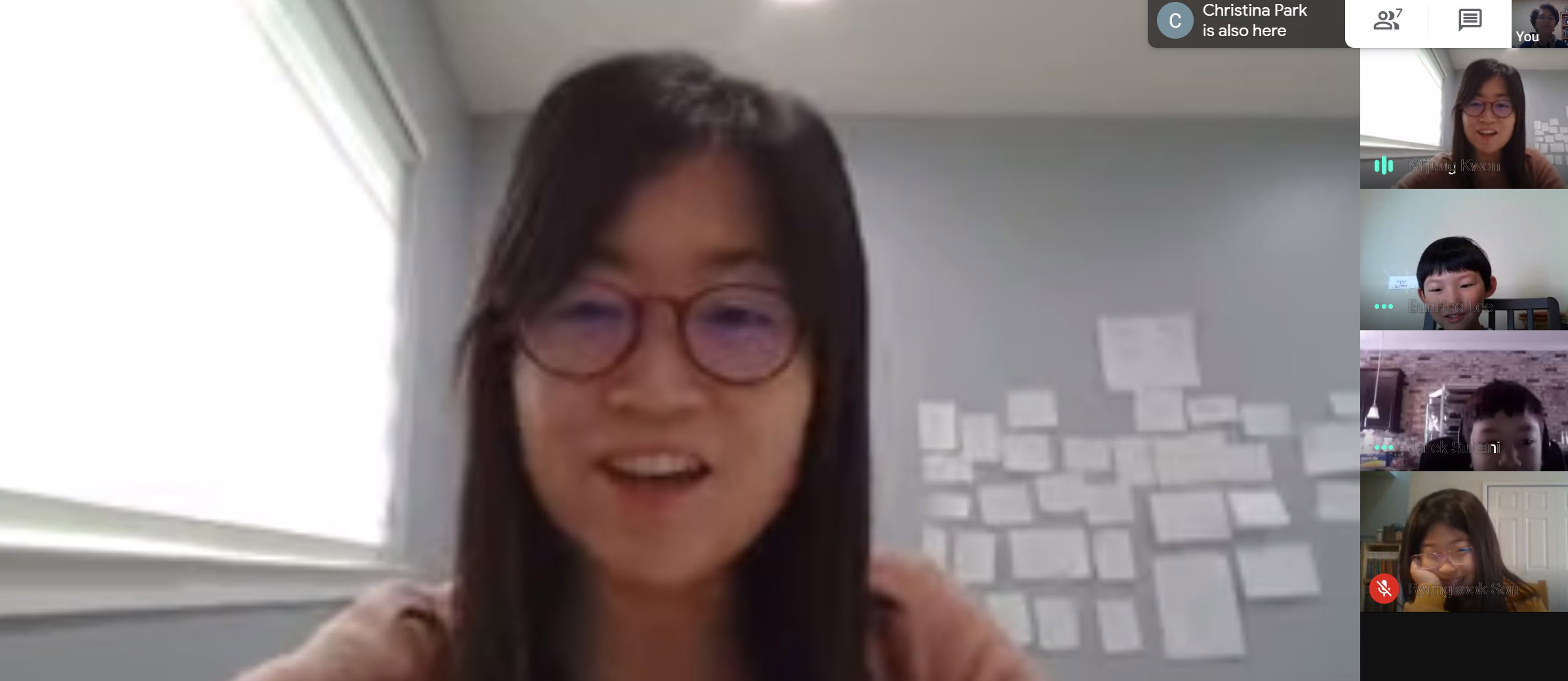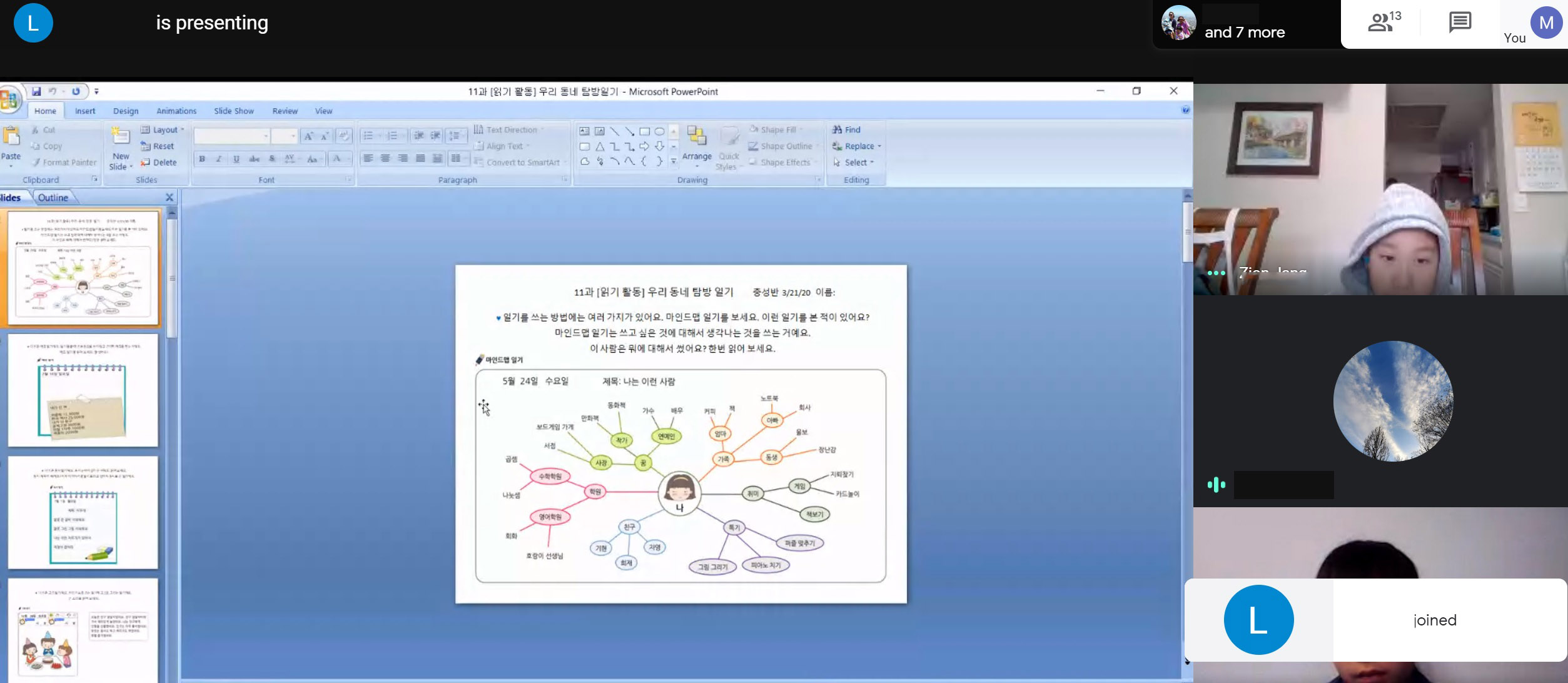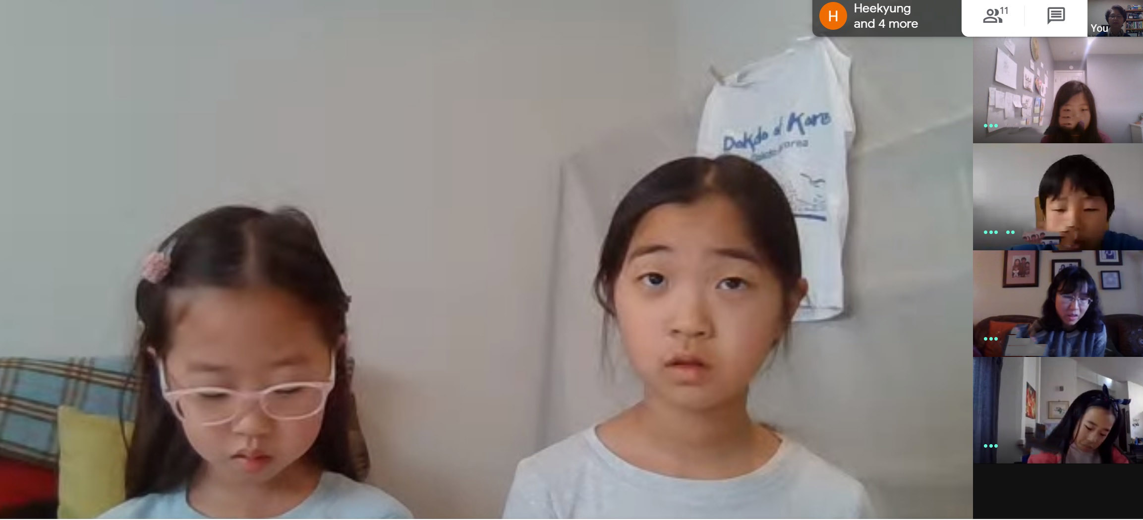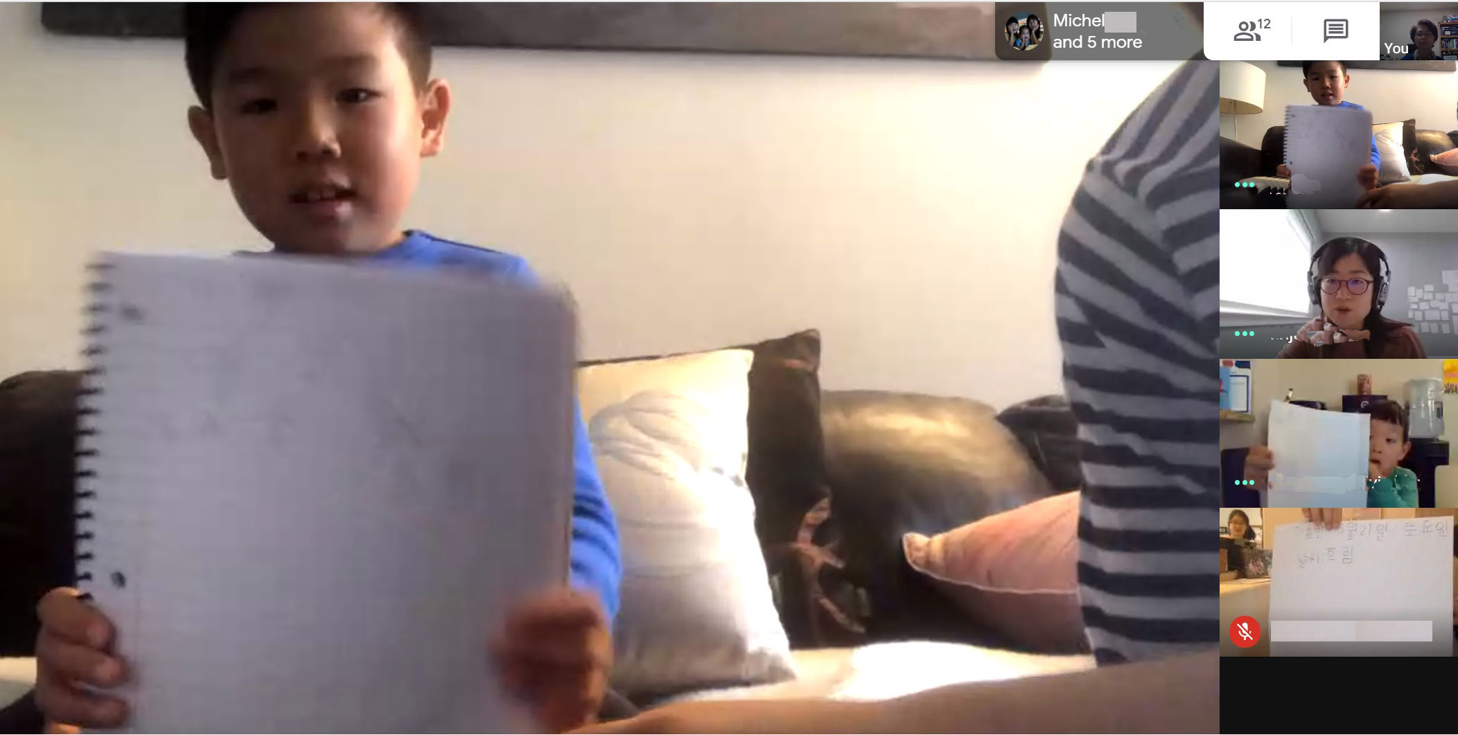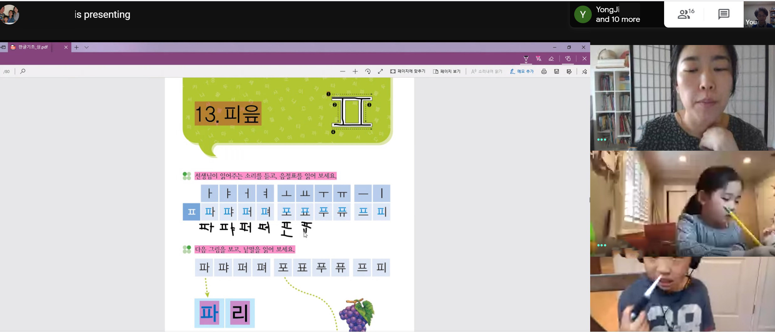 은혜반은 수업 시간이 되기도 전에 학생들이 온라인 상에 들어와서 다른 친구들을 기다리고 있었습니다. 선생님과 함께 오늘이 몇월 며칠인지 알아보고 본인들이 한 숙제 발표를 잘했습니다. 받아쓰기 시험을 보았고 중점적인 내용을 점검했습니다. 지난주보다 더 열심히 수업에 참여했지만 50분이 지나니까 학생들이 힘들어 하는 모습이 보였습니다.