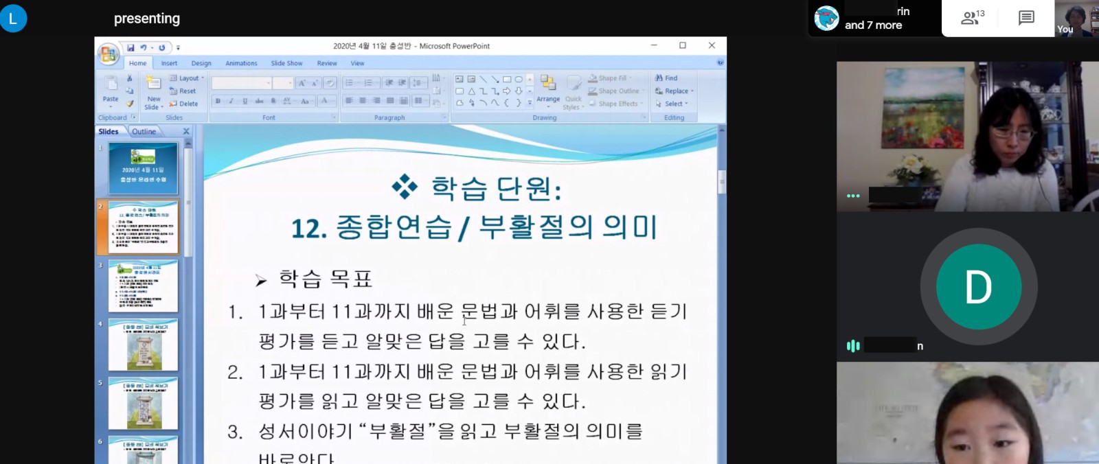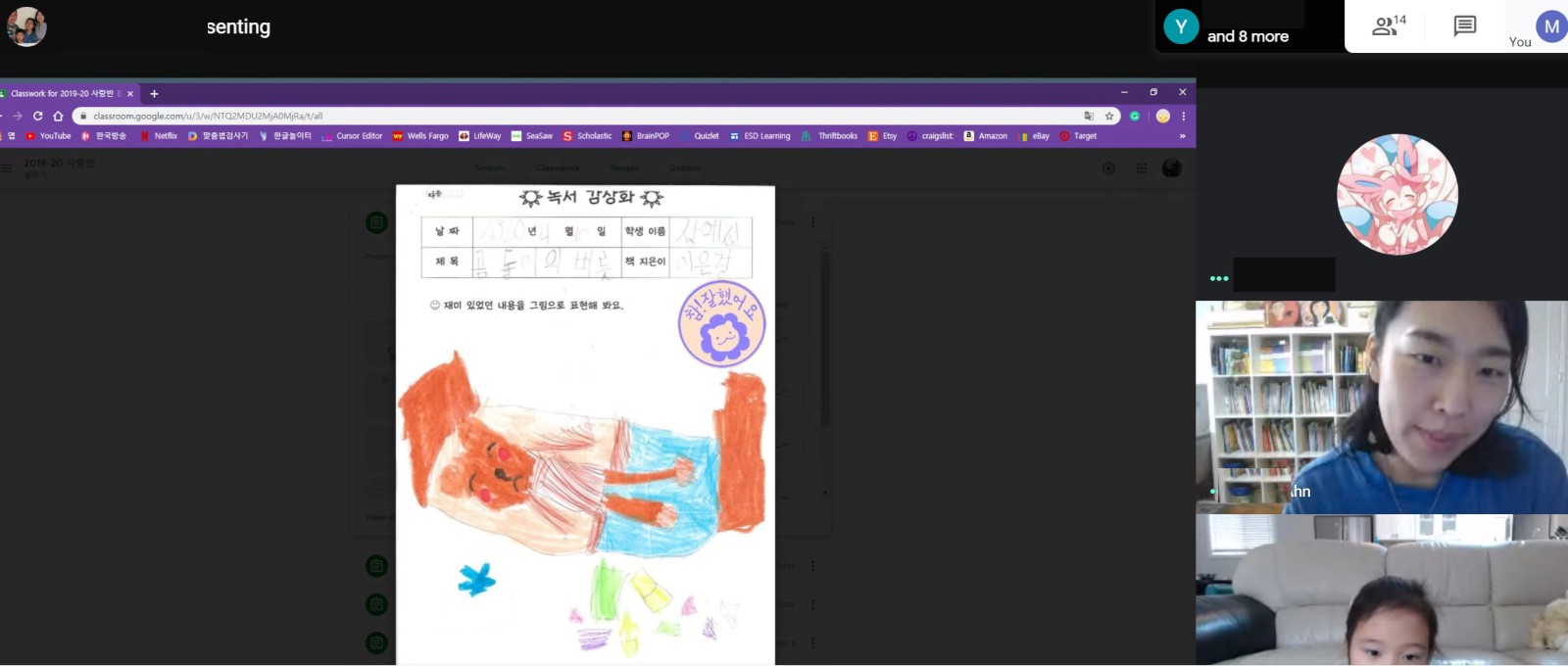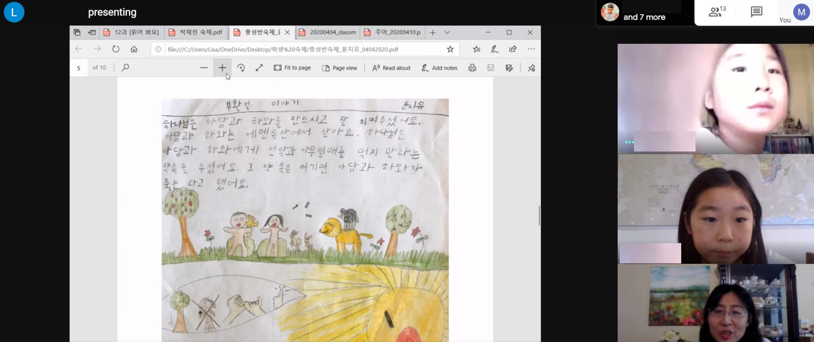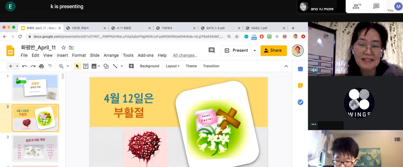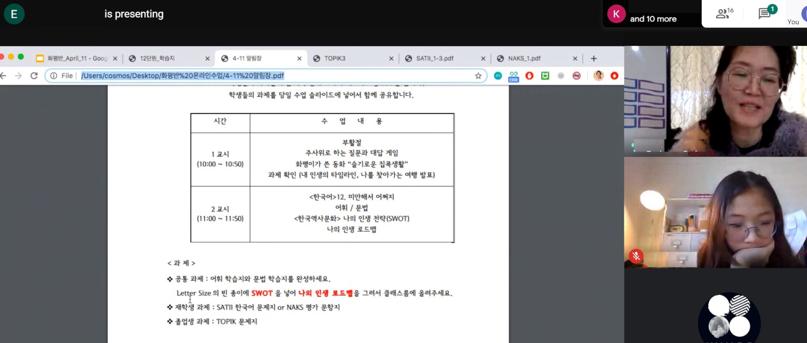 지난 4월 11일에는 5회째 대체수업을 실시했습니다. Google Meet 프로그램을 사용하여 원격 화상 수업과 선생님과의 유선 통화로 하는 수업이었습니다. 정규학교도 온라인 수업이 시작되고 5번째 하는 수업이어서인지 학생들의 출석률도 좋았고 숙제도 진지하게 제출하여 선생님들도 만족하는 수업이 되어가고 있습니다.