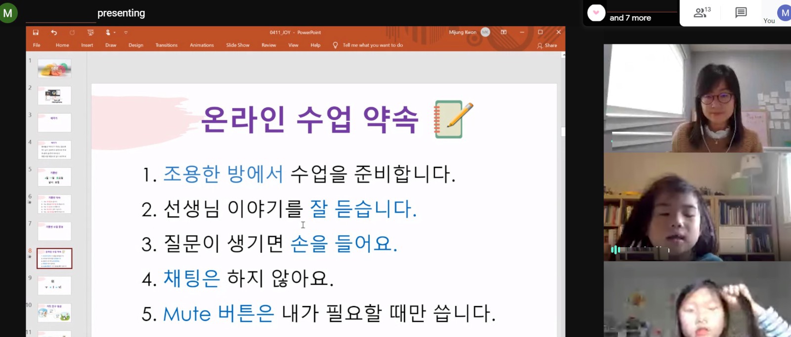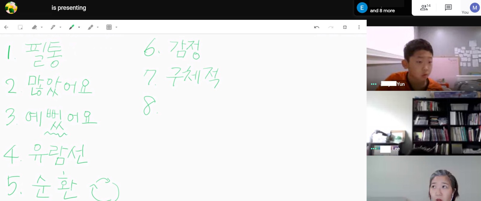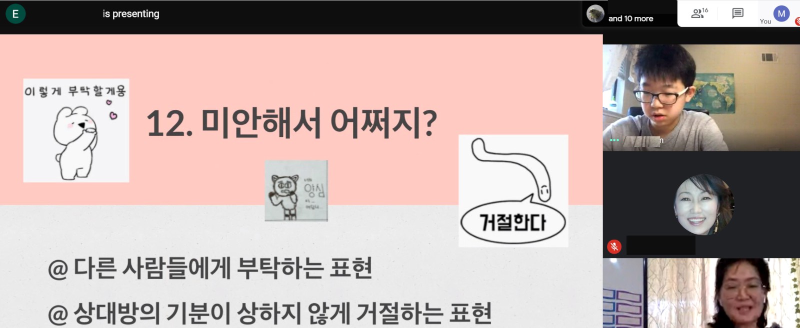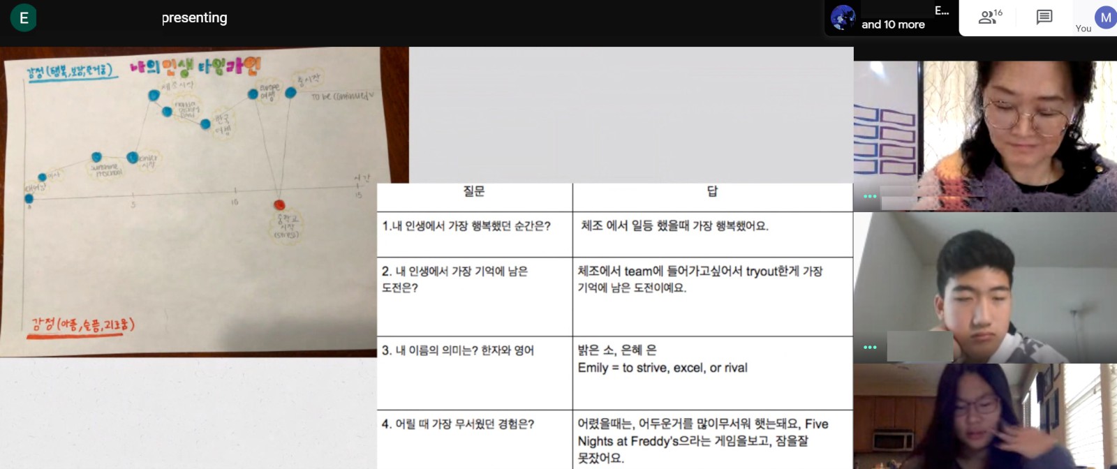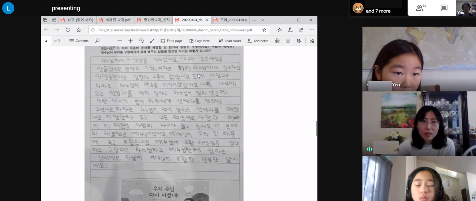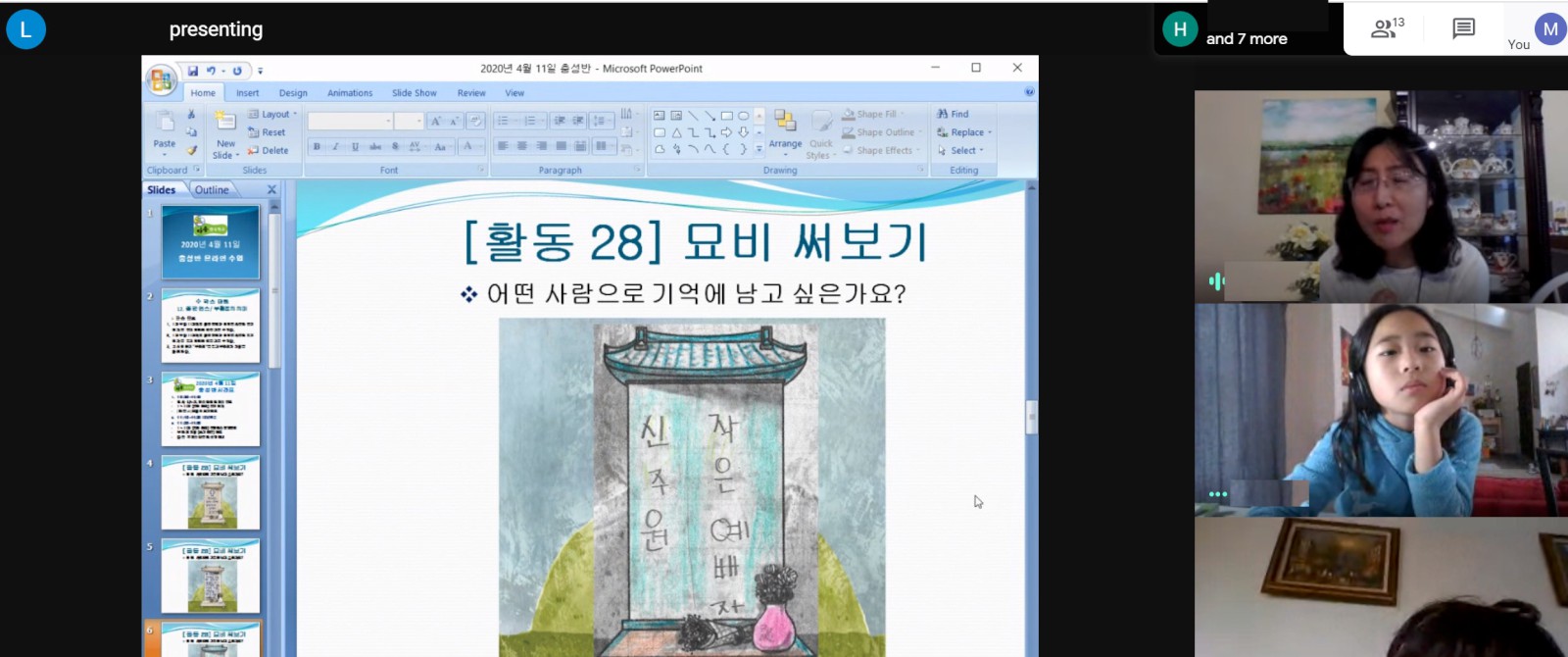 지난 4월 11일에는 5회째 대체수업을 실시했습니다. Google Meet 프로그램을 사용하여 원격 화상 수업과 선생님과의 유선 통화로 하는 수업이었습니다. 정규학교도 온라인 수업이 시작되고 5번째 하는 수업이어서인지 학생들의 출석률도 좋았고 숙제도 진지하게 제출하여 선생님들도 만족하는 수업이 되어가고 있습니다.