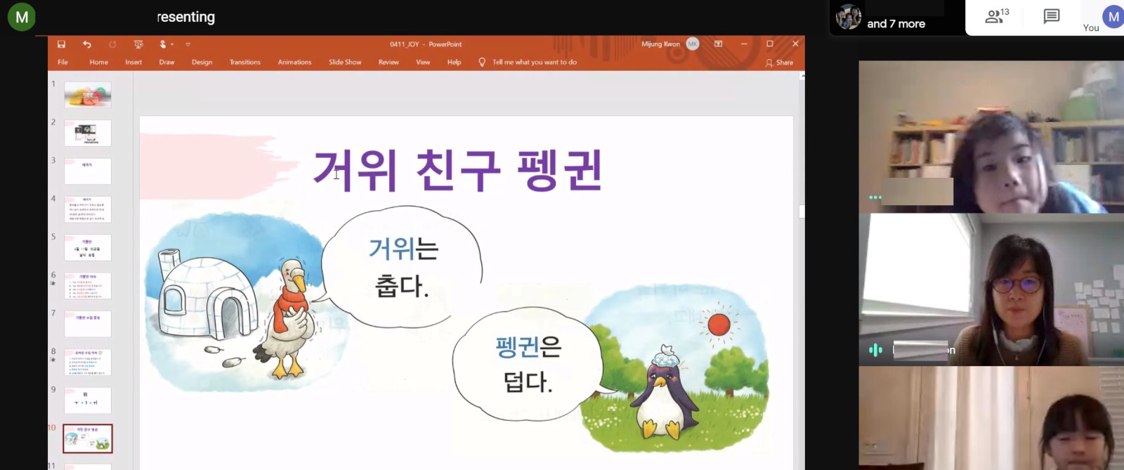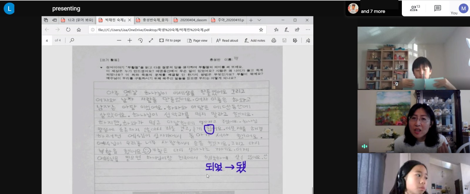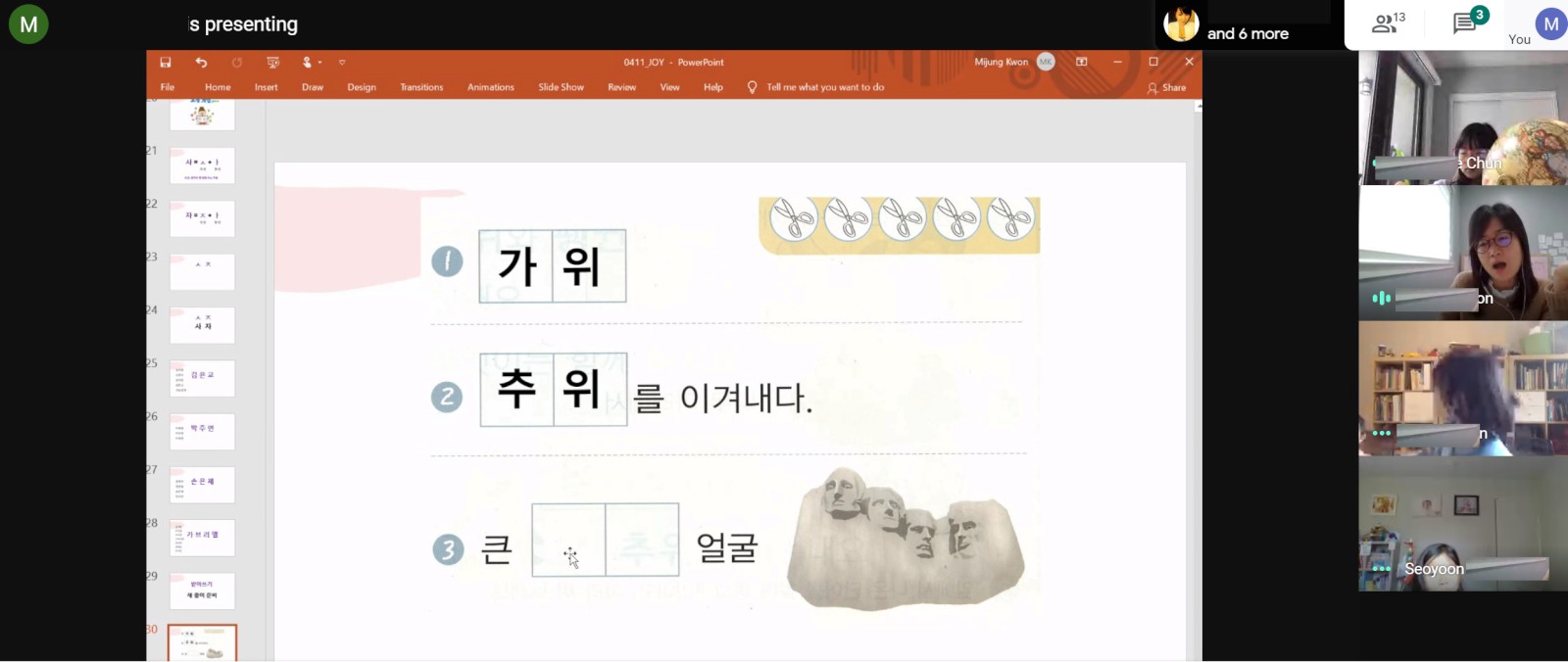 대체수업은 부모님들의 협력이 가장 중요합니다. 알림장을 주의 깊게 읽으시고 숙제를 프린트해 주시고 숙제를 보내주시거나 웹에 올려주시는 모든 부모님들 덕분에 수업이 잘 진행되고 자녀들이 온라인 수업을 따라가는데 지장이 없게 도움을 주심에 감사드립니다.