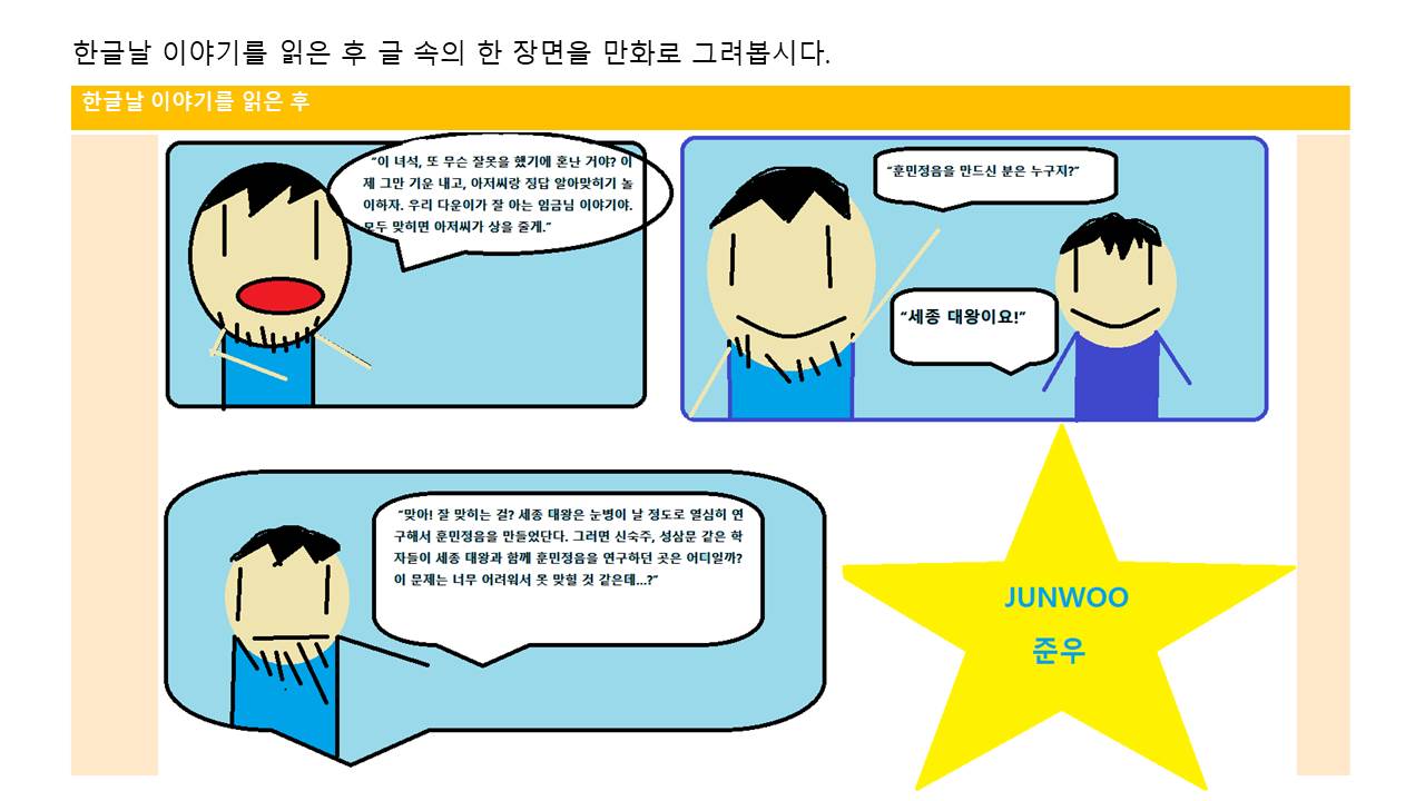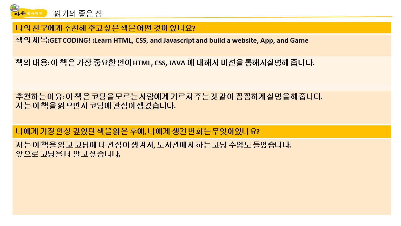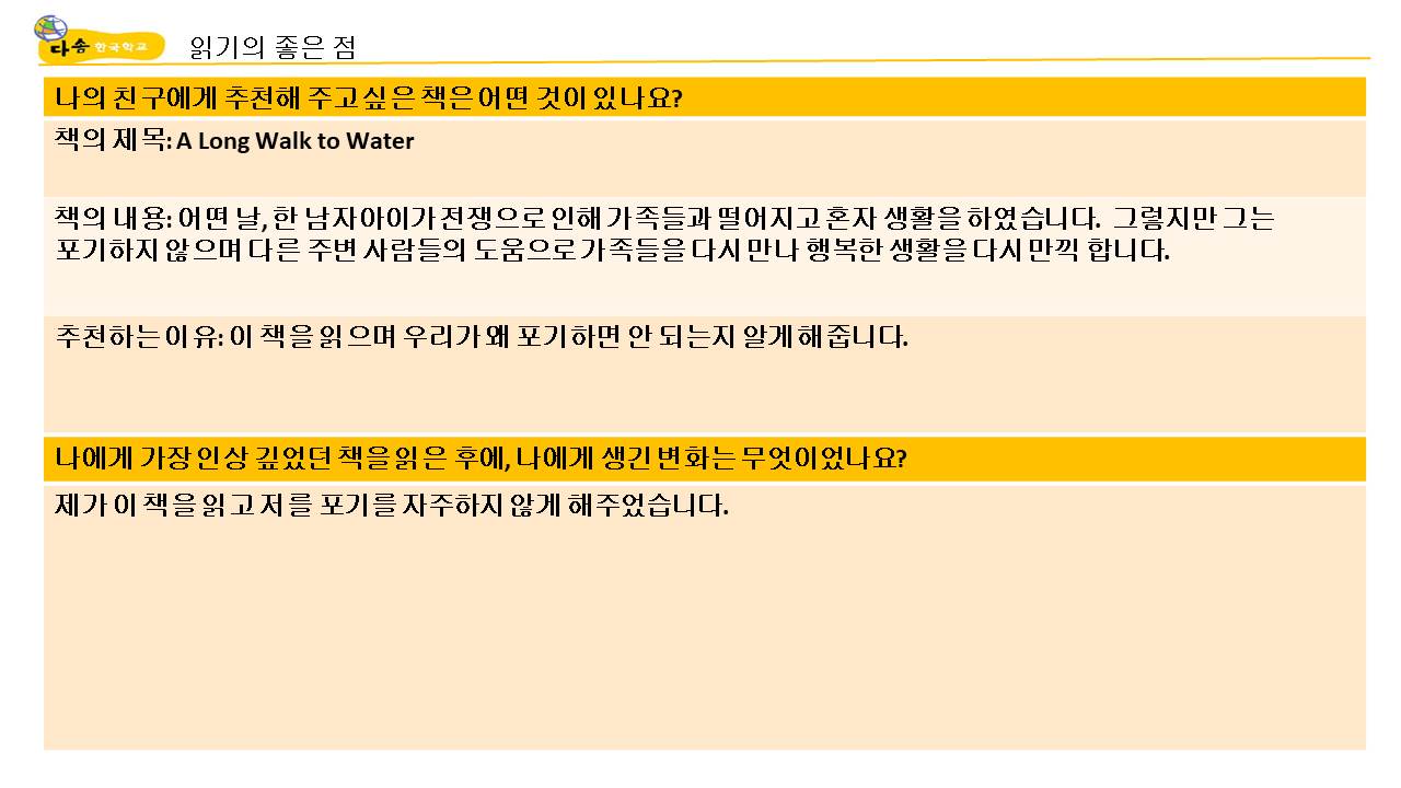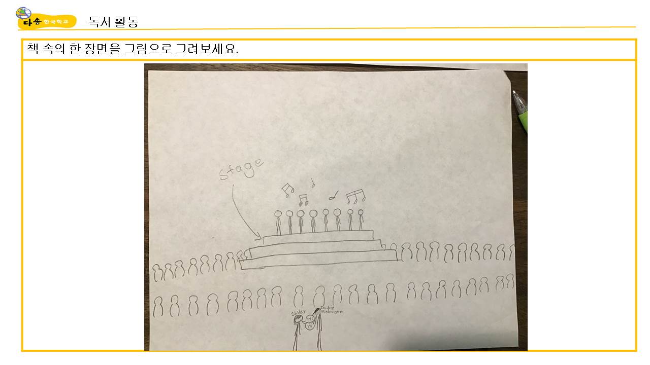 교과서를 다 마친 반도 있어서 다시 복습을 하고 있거나 학사일정에 따라 교과서 수업 및 발표와 프로젝트 수업을 하고 있습니다. 교과서를 다 마친 반에서는 선생님들이 교재를 만들어서 학생들과 나누고 있습니다. 받아쓰기 시험이나 게임을 하면 학생들 모두 매우 집중해서 공부하는 모습이 참 좋았습니다. 어린 반에서는 처음에는 수줍어서 선생님의 질문에 답을 못하곤 했으나 이제는 익숙해져서 답변도 잘하고 발표도 하며 즐겁게 공부하였습니다.