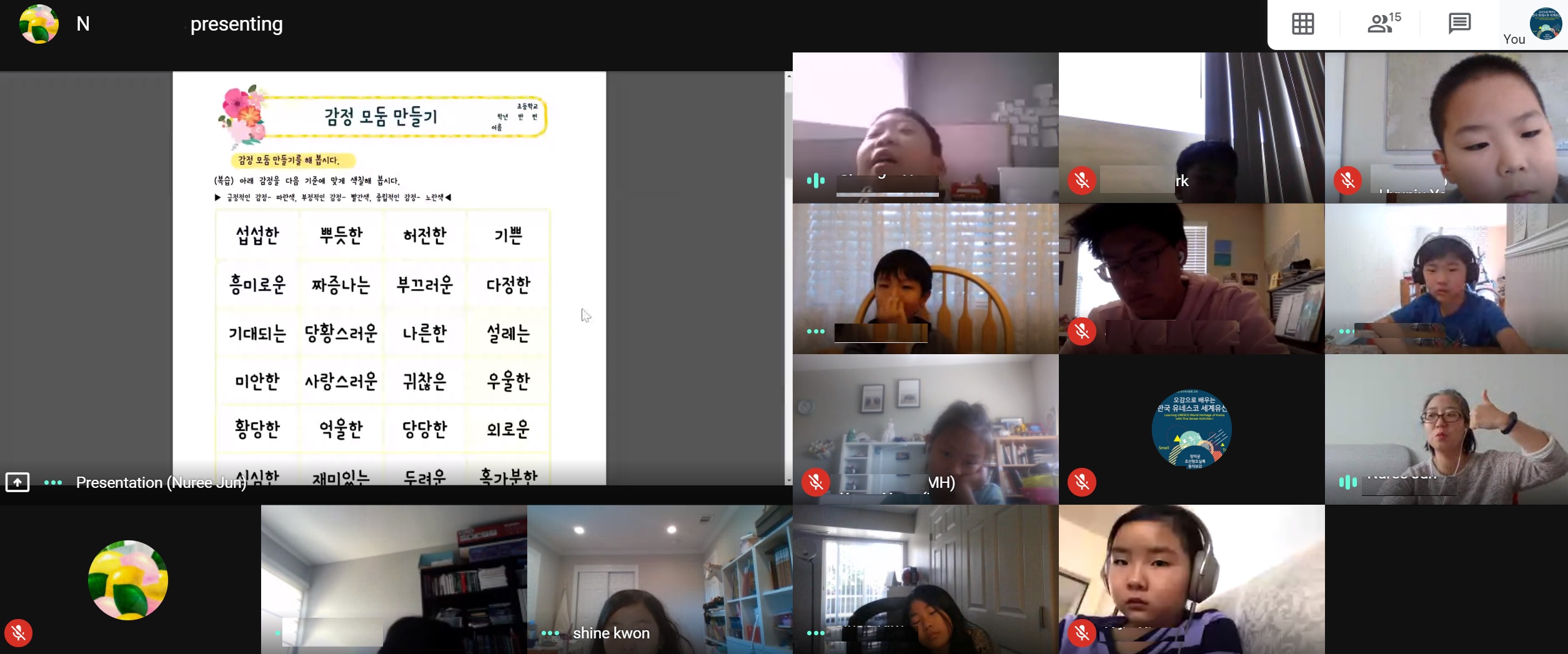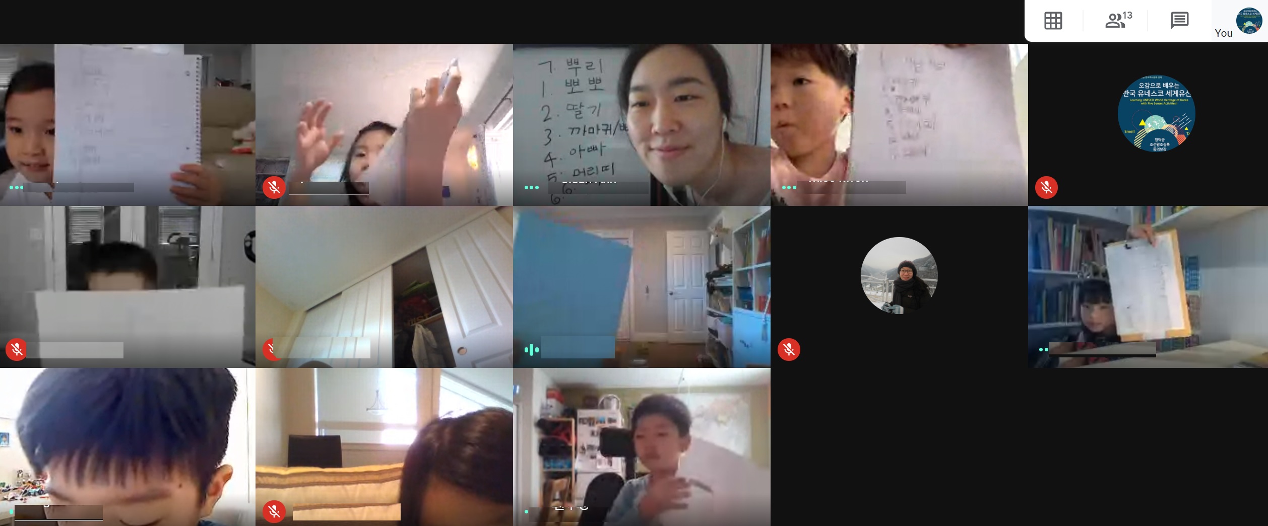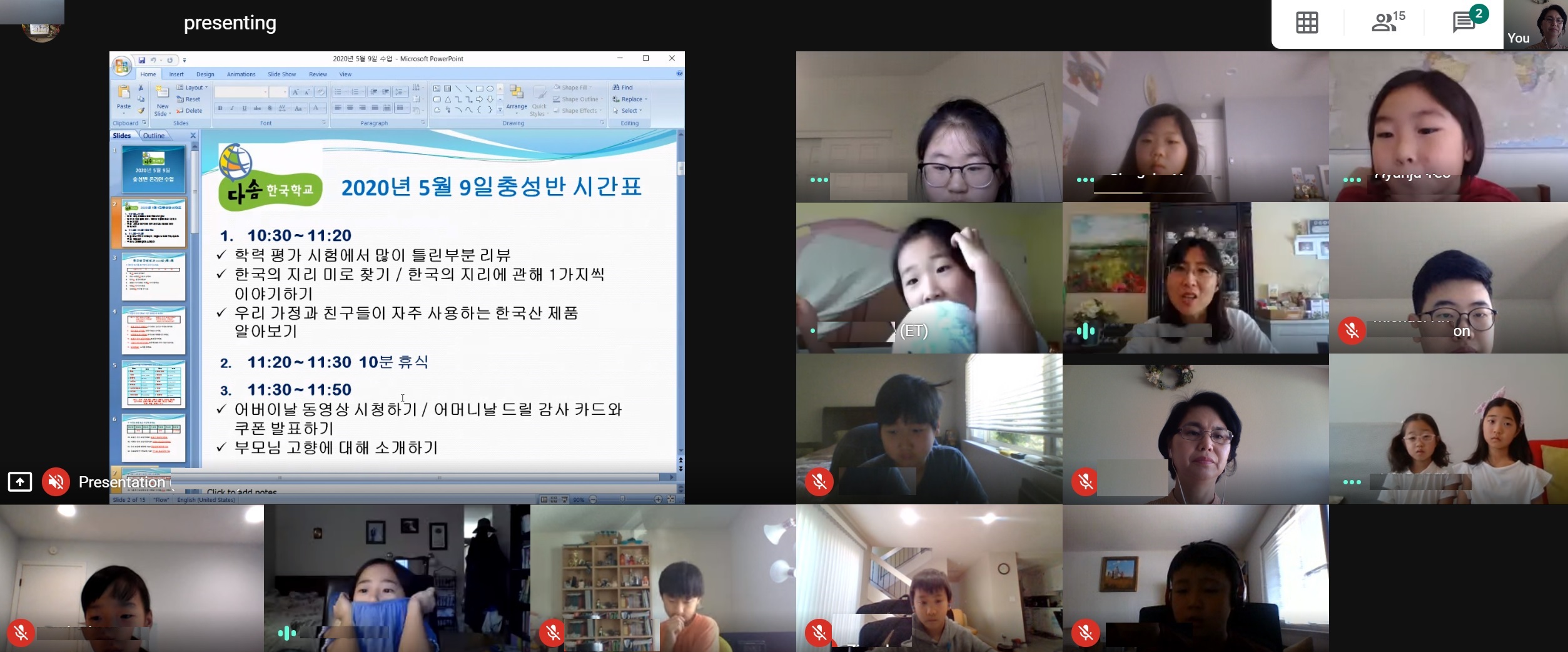 다솜한국학교에서 대체수업이 시작된지 9회째가 되었습니다. 학생들도 대체수업에 잘 적응하고 있습니다. 선생님들의 수고가 많으시지만 최선을 다해 대체수업에 임하고 계십니다. 오늘은 한국의 어버이날과 미국의 어머니날을 맞이하여 어머니날 관련 수업을 하였고 교과서를 다 마친 반에서는 선생님들이 계발하신 수업 자료로 공부했습니다. 또한 한국 역사문화와 관련하여 지난 1년 동안 배운 내용을 복습하는 시간을 가졌습니다.