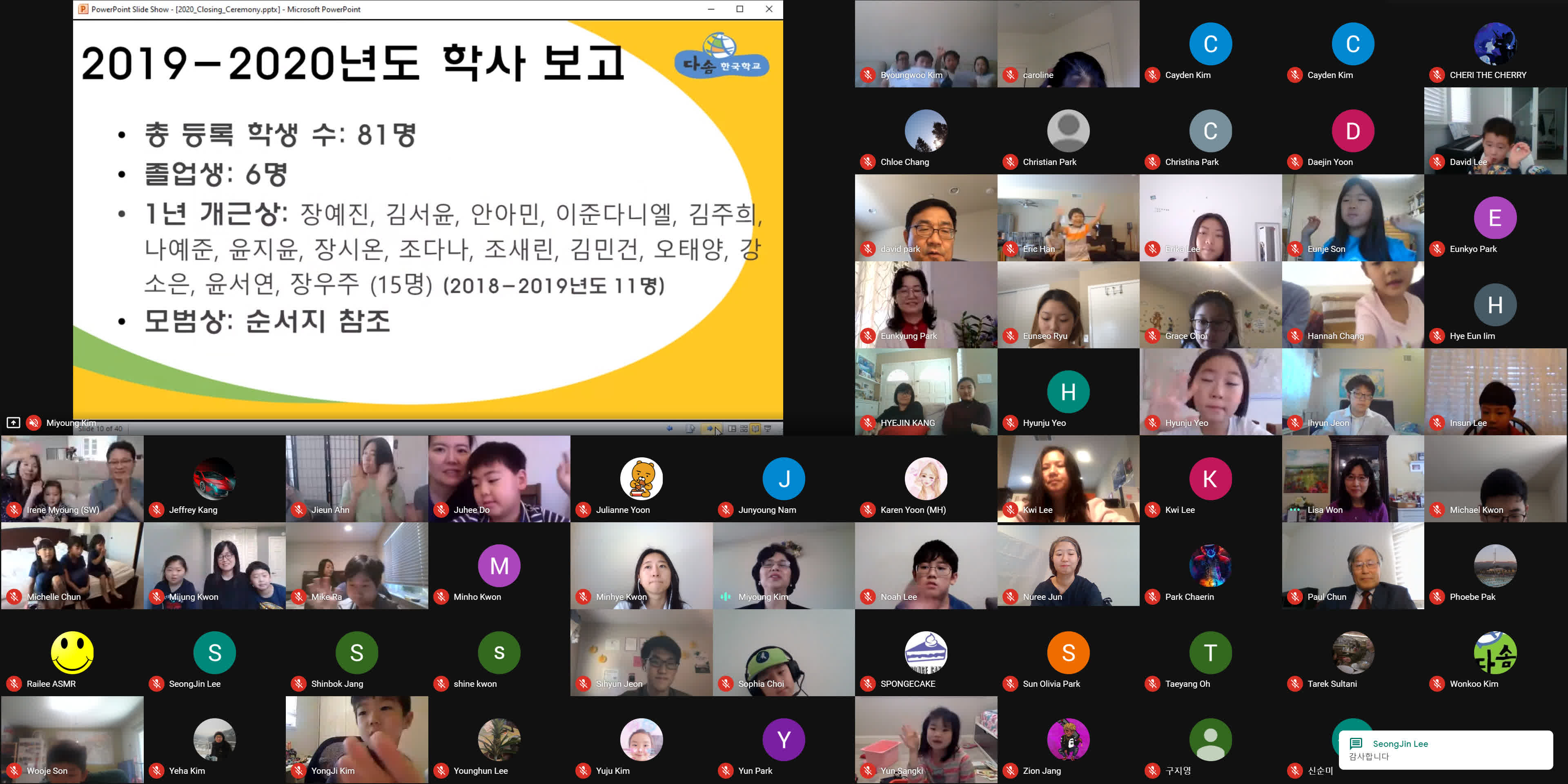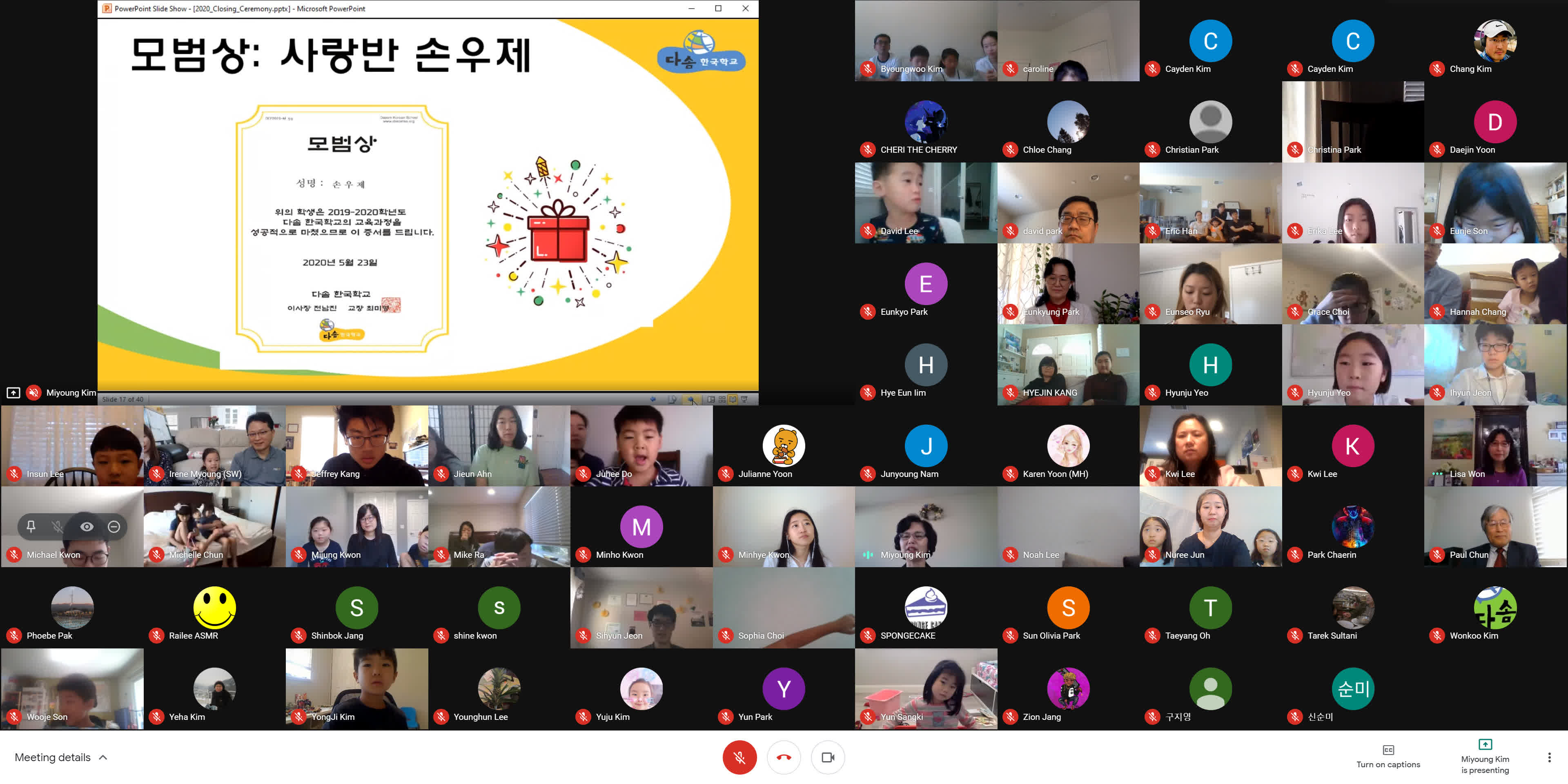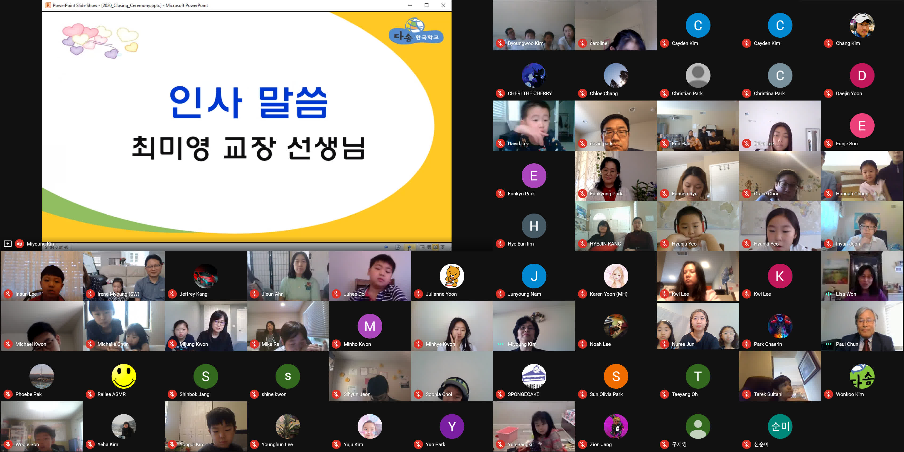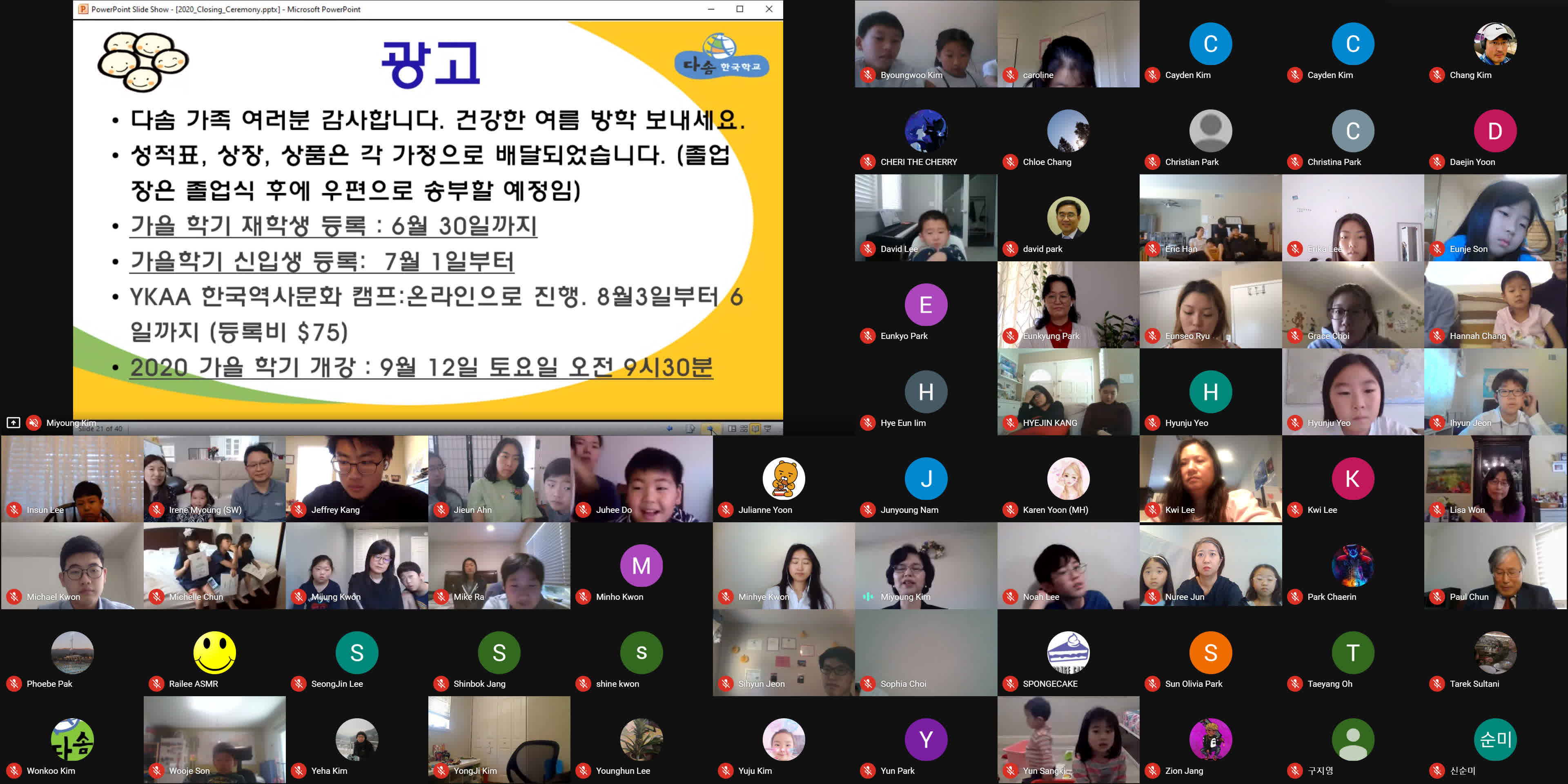 종강식이 시작되기 3분 전에 학생, 학부모, 손님, 교사 모두가 Google MEET 화상 종강식 모임에 접속했습니다. 모두 음소거를 하였고 시작 전에 연주되는 곡을 조용히 함께 감상했습니다. 원은경 교감 선생님의 개회 선언과 국민의례로 국기에 대한 경례를 마치고, 보조교사들이 대표로 애국가를 불렀고 나머지 모든 학생과 참석자들은 각자 음 소거 상태에서 불렀습니다.