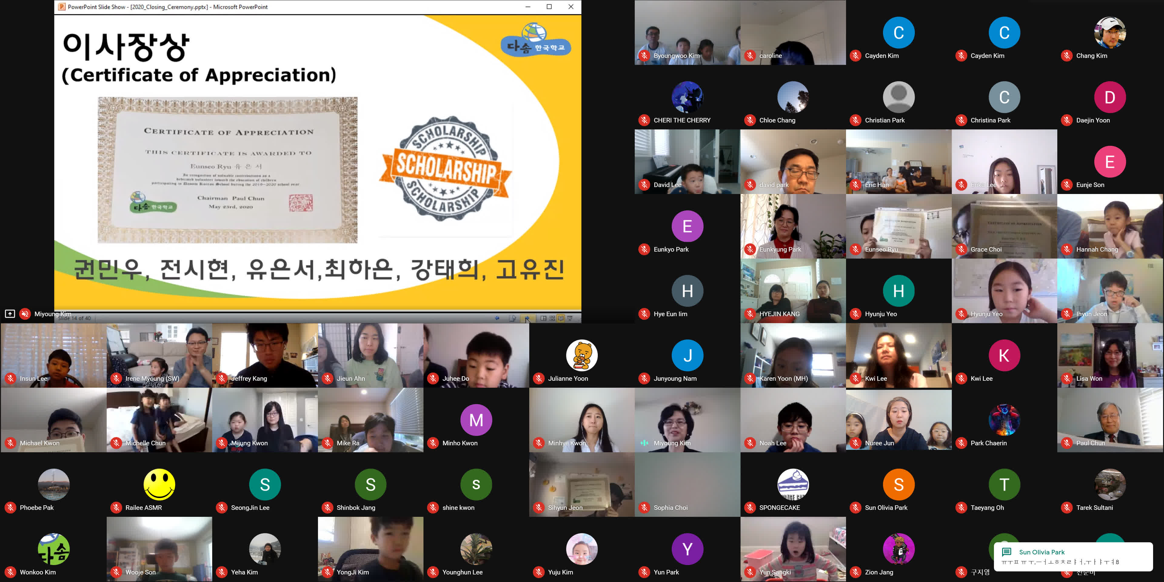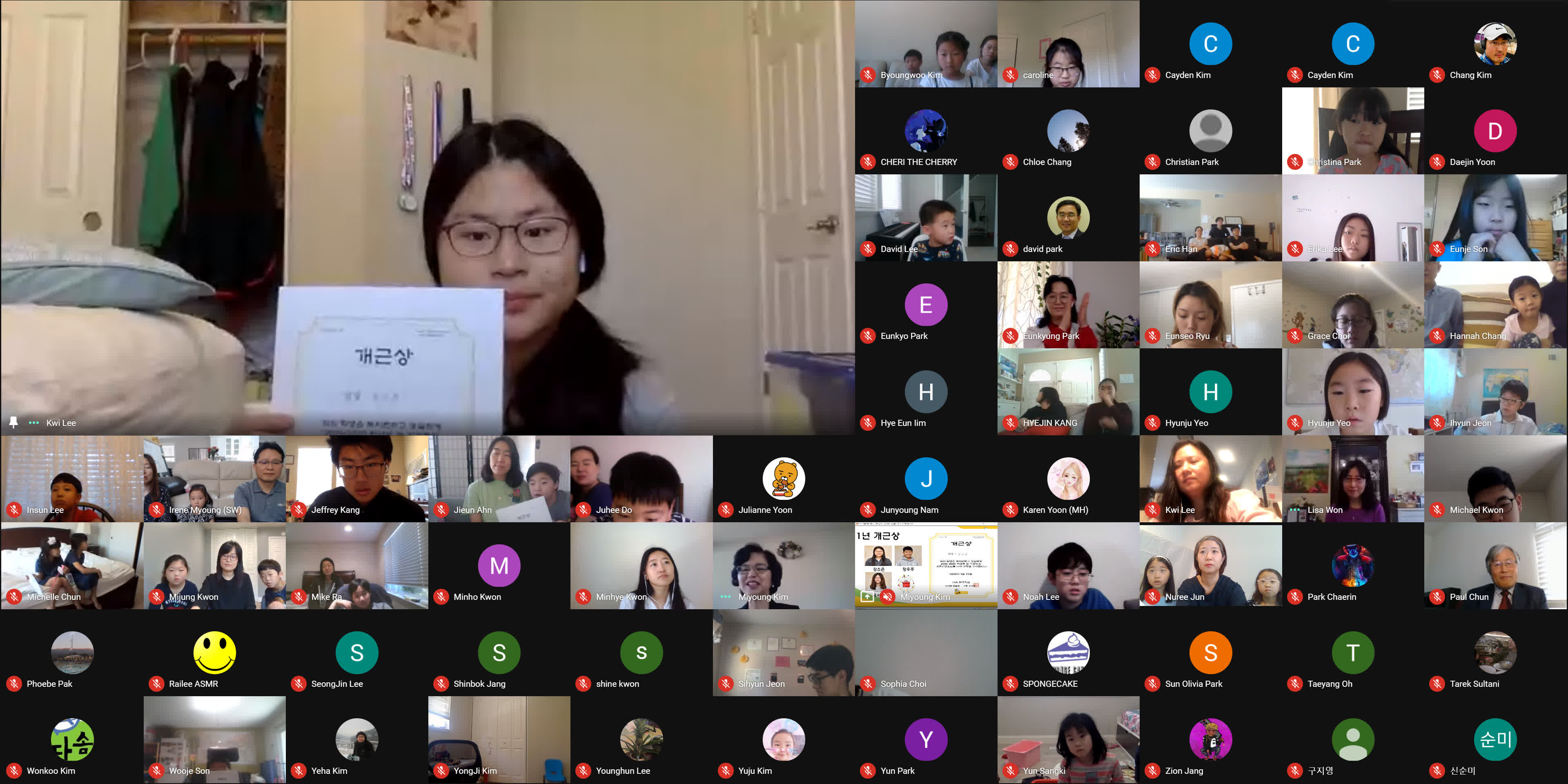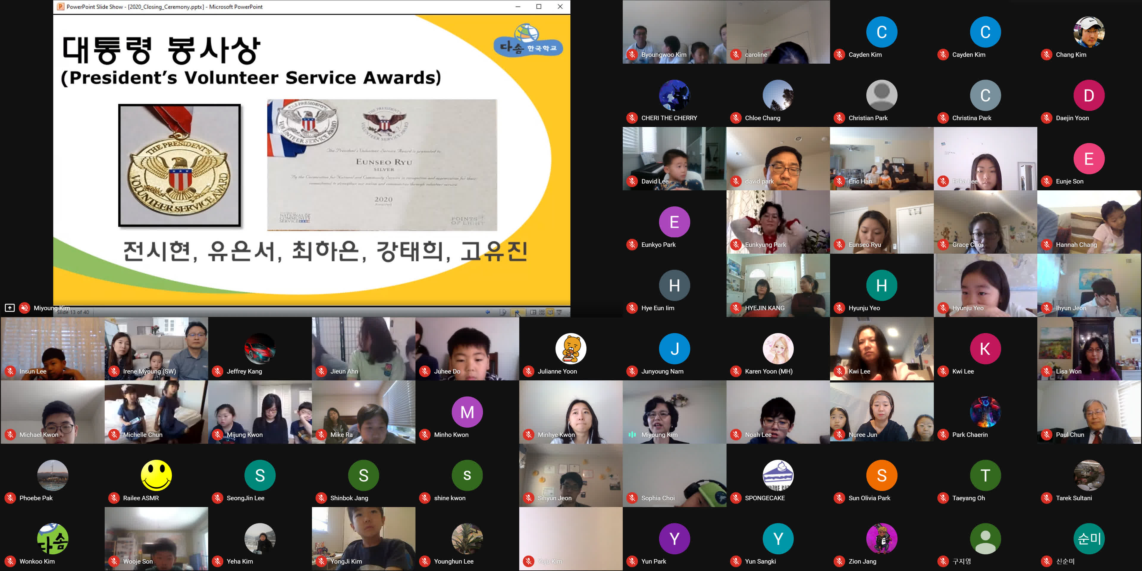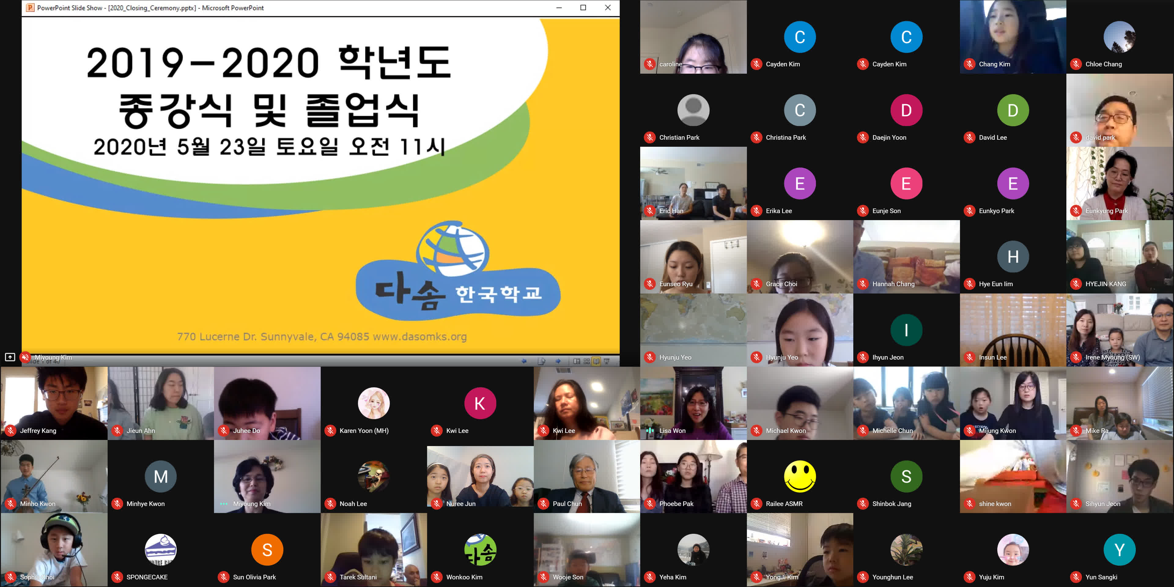 종강식이 시작되기 3분 전에 학생, 학부모, 손님, 교사 모두가 Google MEET 화상 종강식 모임에 접속했습니다. 모두 음소거를 하였고 시작 전에 연주되는 곡을 조용히 함께 감상했습니다. 원은경 교감 선생님의 개회 선언과 국민의례로 국기에 대한 경례를 마치고, 보조교사들이 대표로 애국가를 불렀고 나머지 모든 학생과 참석자들은 각자 음 소거 상태에서 불렀습니다.