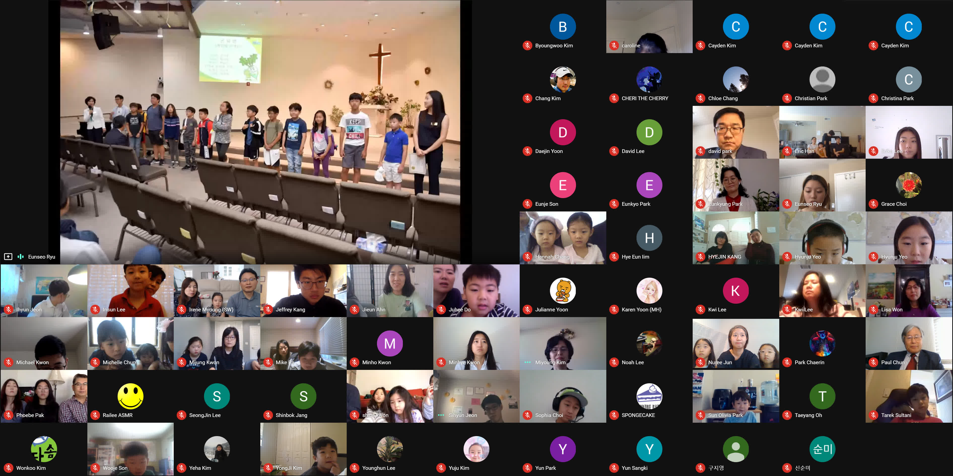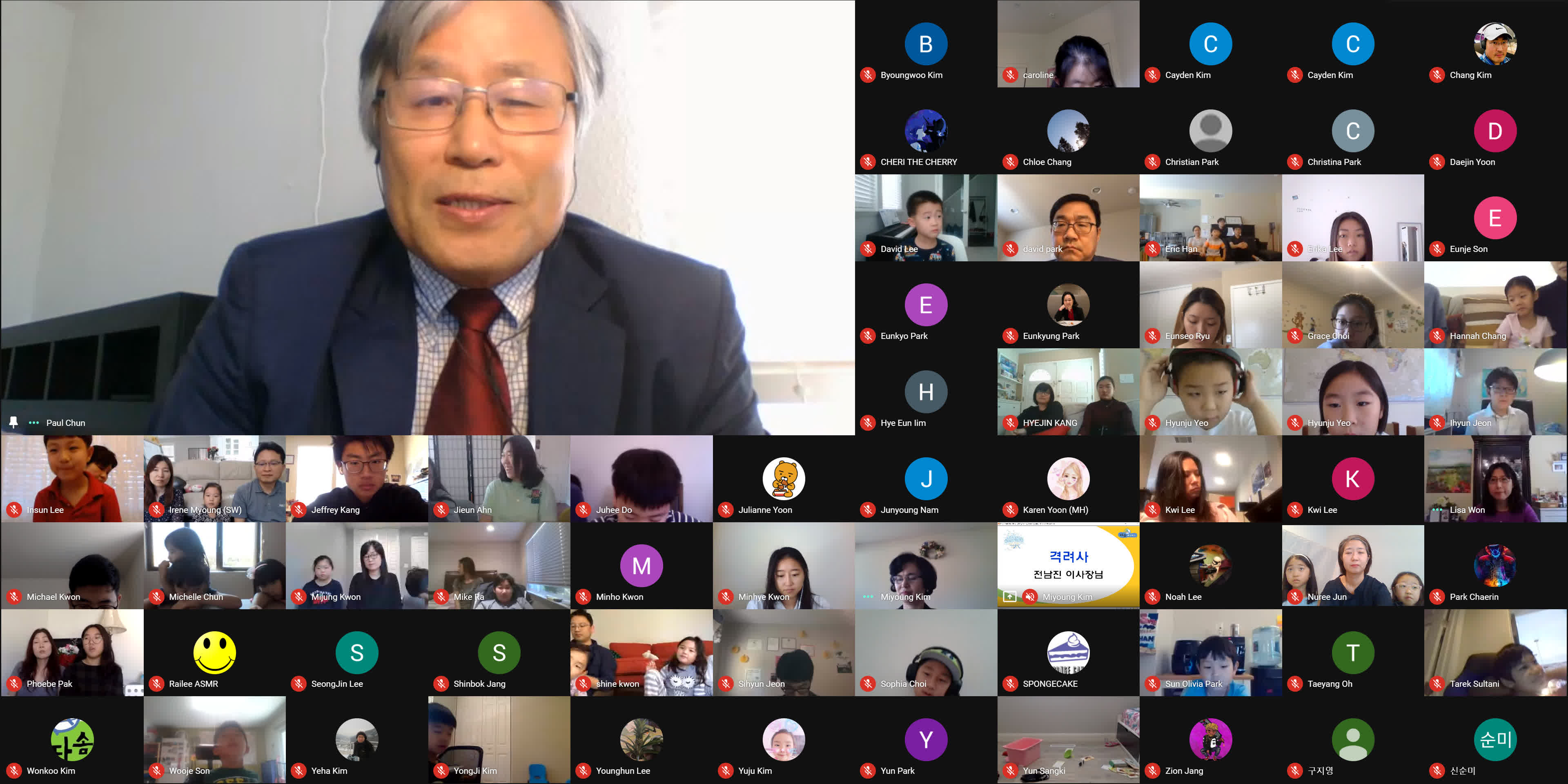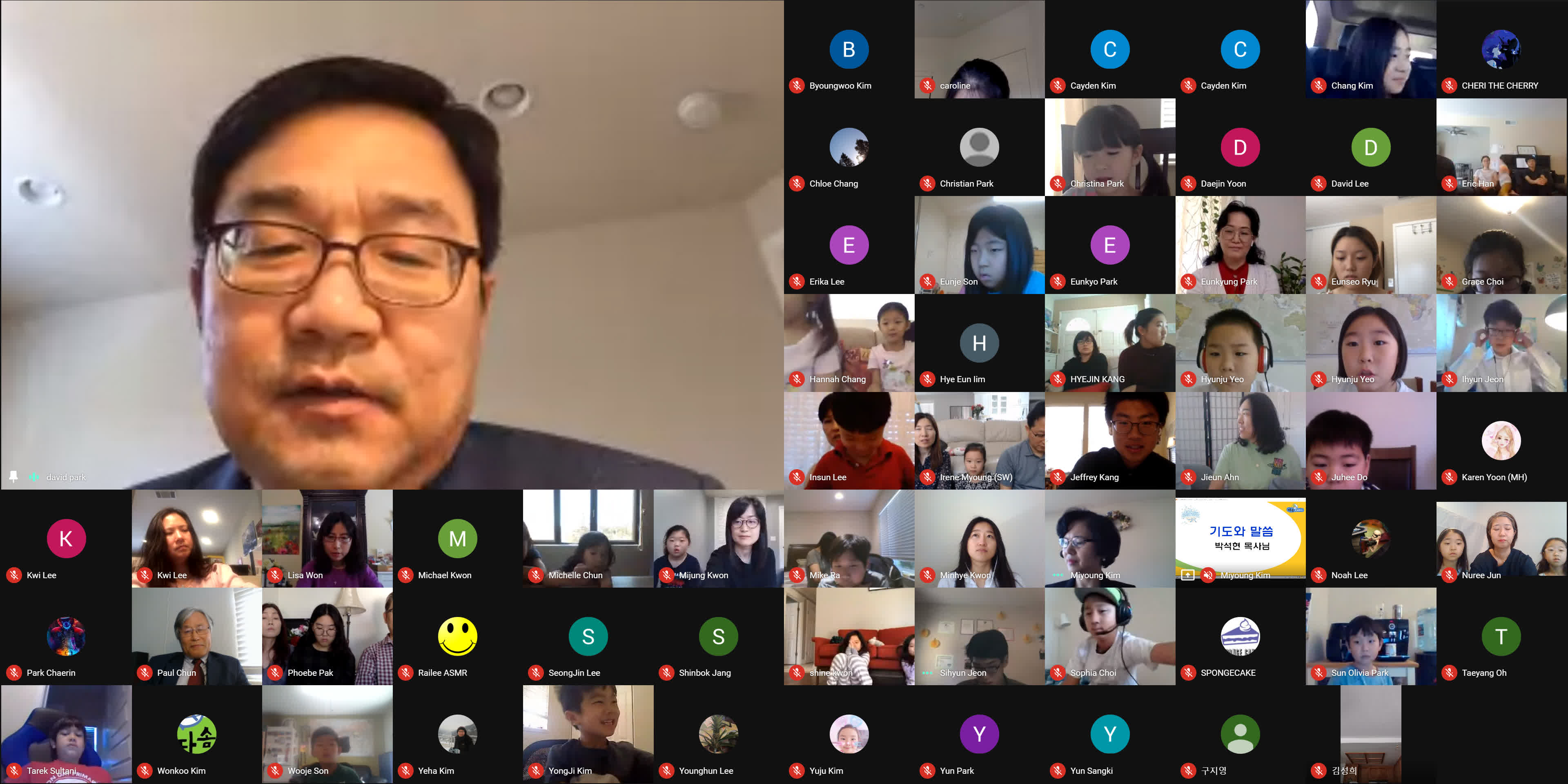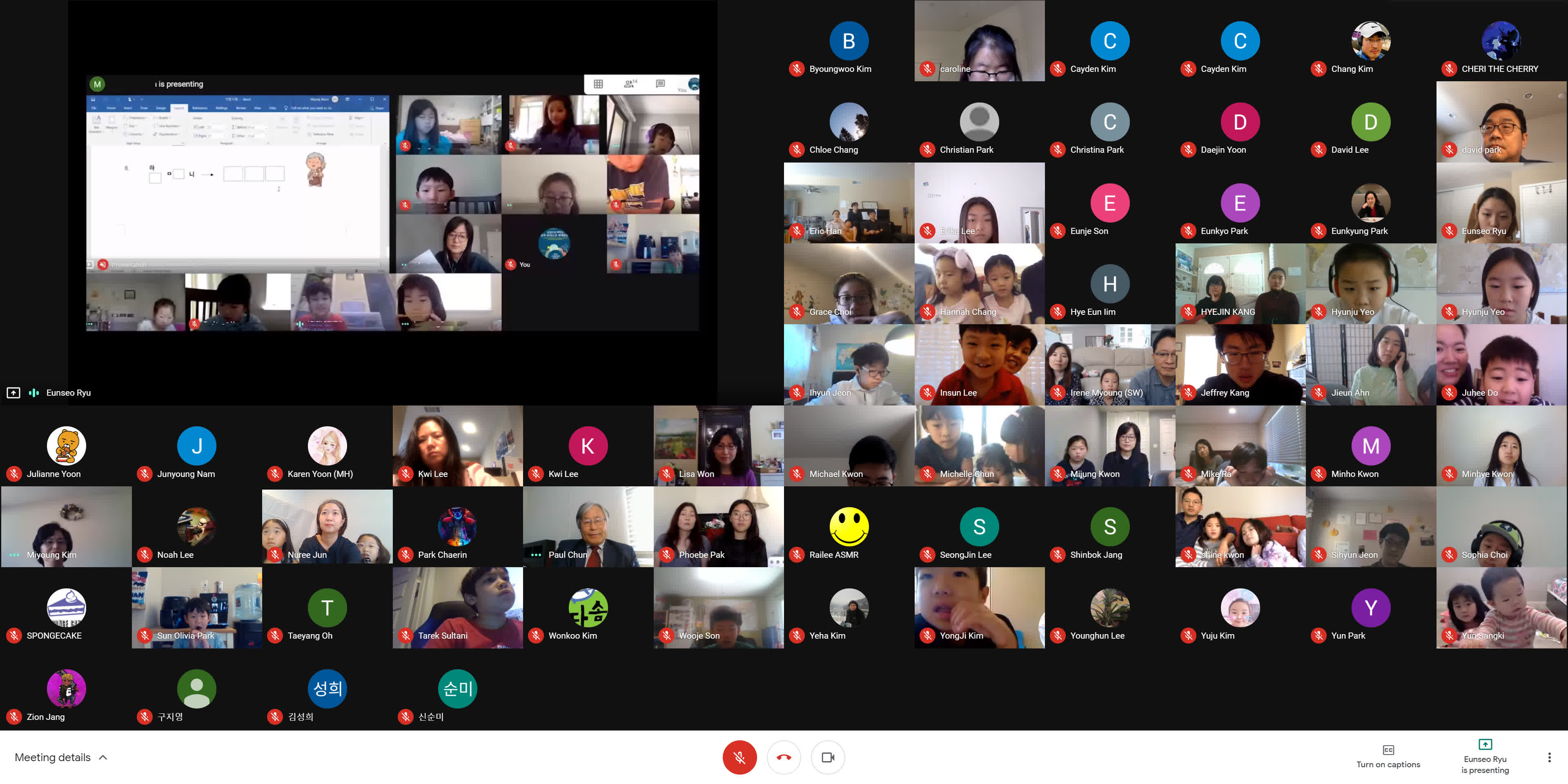 종강식이 시작되기 3분 전에 학생, 학부모, 손님, 교사 모두가 Google MEET 화상 종강식 모임에 접속했습니다. 모두 음소거를 하였고 시작 전에 연주되는 곡을 조용히 함께 감상했습니다. 원은경 교감 선생님의 개회 선언과 국민의례로 국기에 대한 경례를 마치고, 보조교사들이 대표로 애국가를 불렀고 나머지 모든 학생과 참석자들은 각자 음 소거 상태에서 불렀습니다.