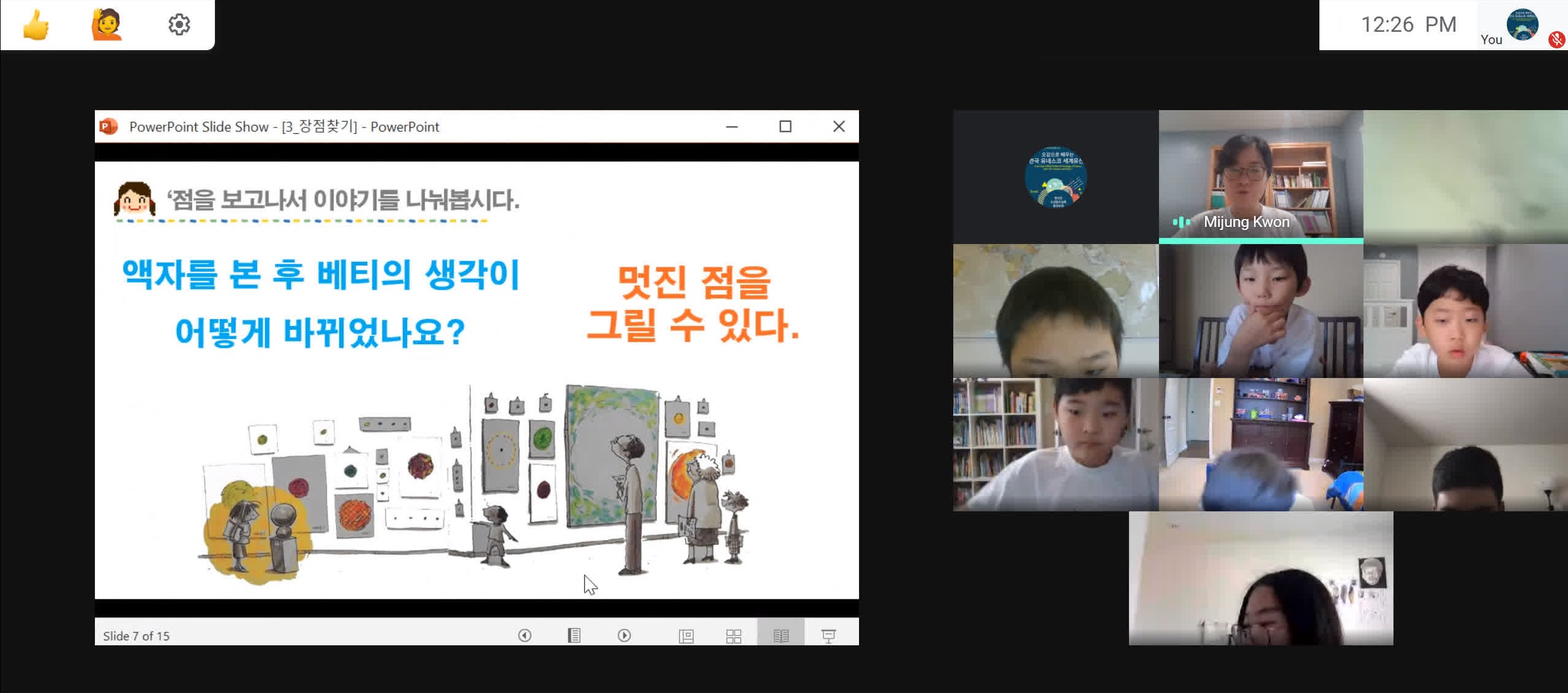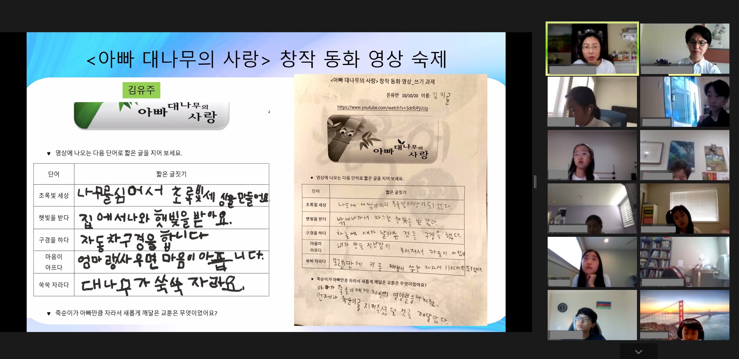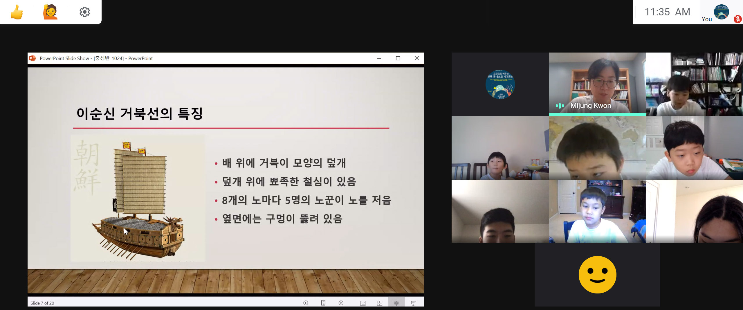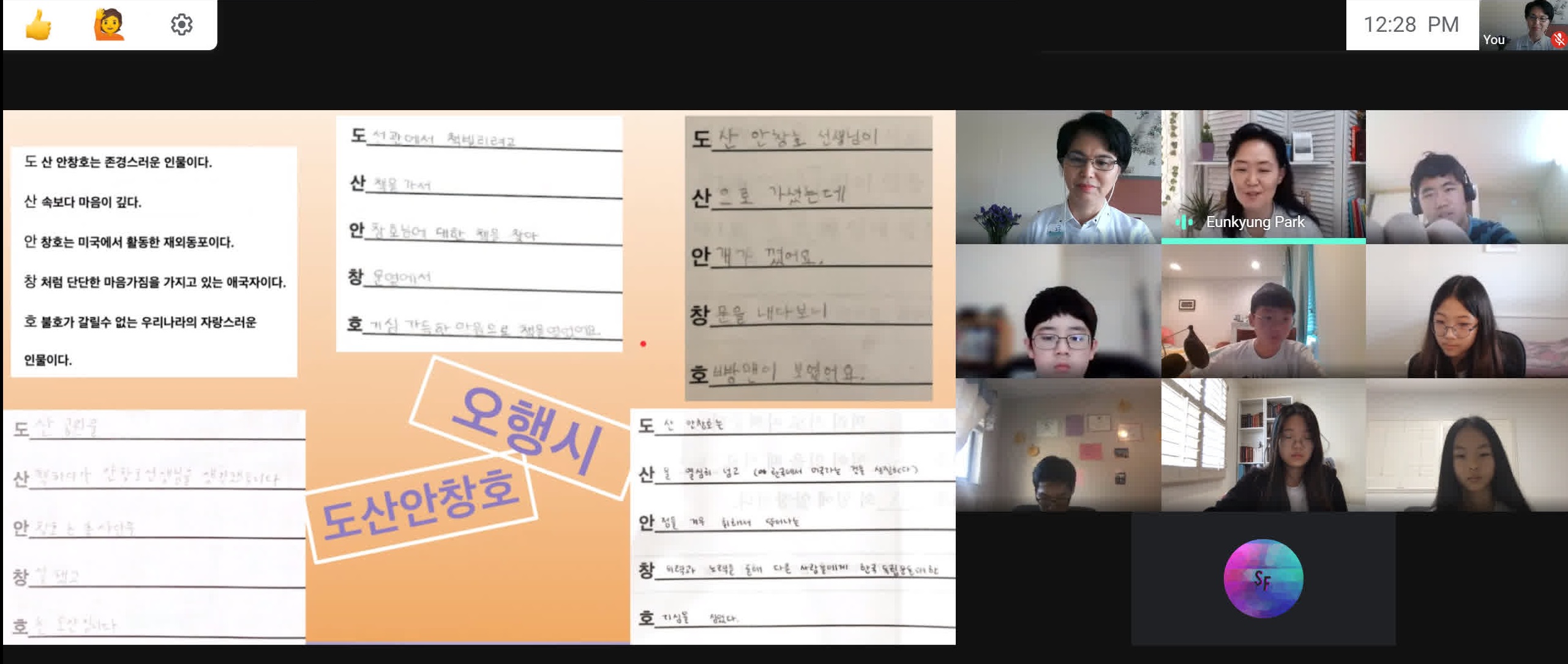 2020-2021학년도 7번째 온라인 수업을 진행했습니다. 첫 시간은 아침 조회로 독도 계기 수업을 하였고 2교시부터 4교시까지한국어 및 반 별 독도 수업을 했습니다. 온라인 수업을 진행하느라 수고하시는 선생님들과 학생들을 격려해 주시기 바랍니다.