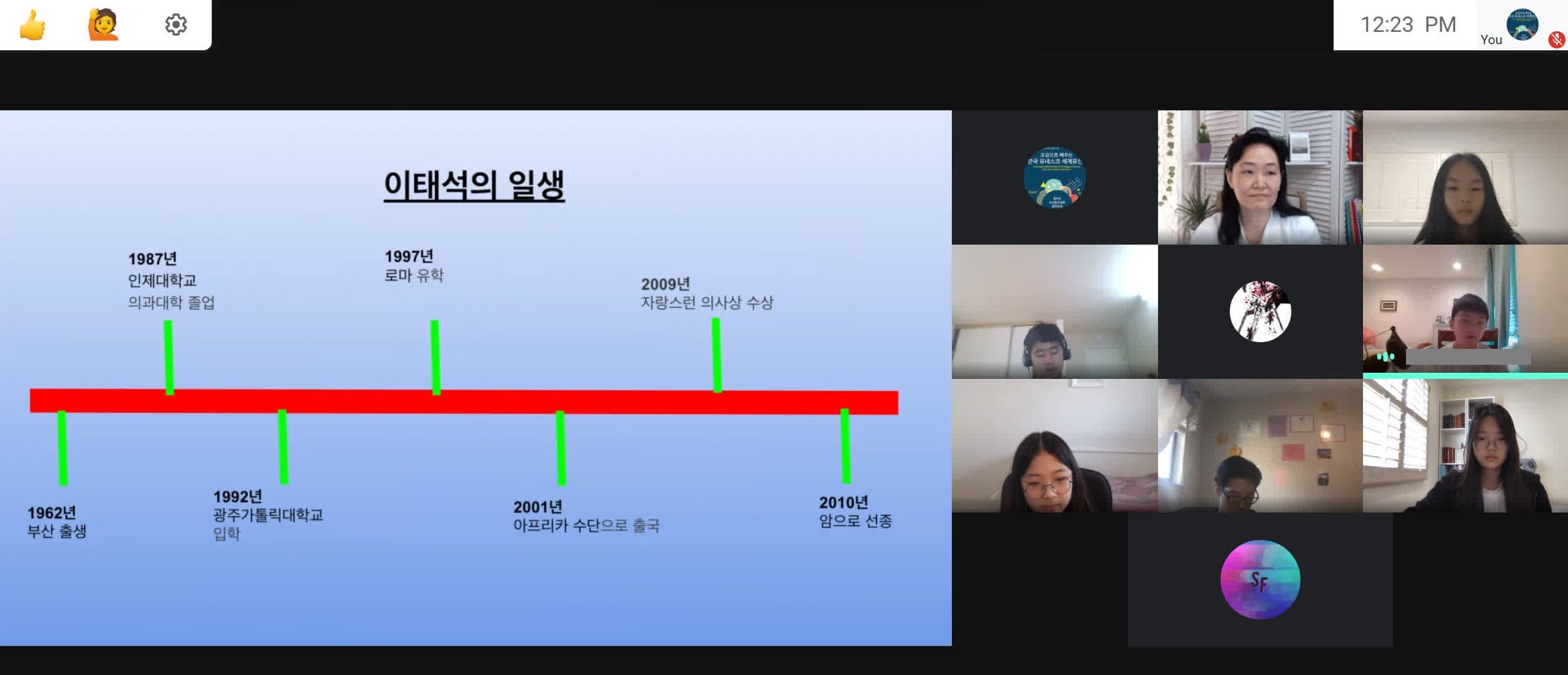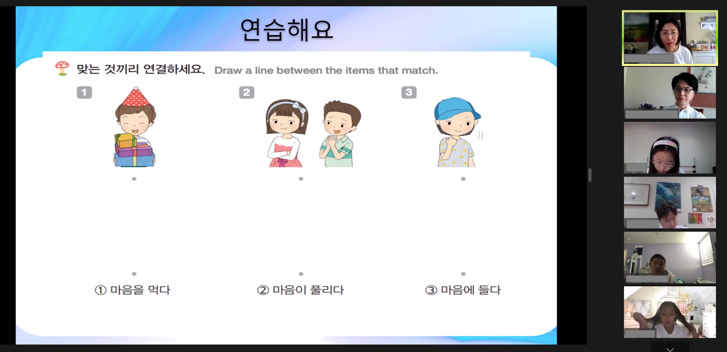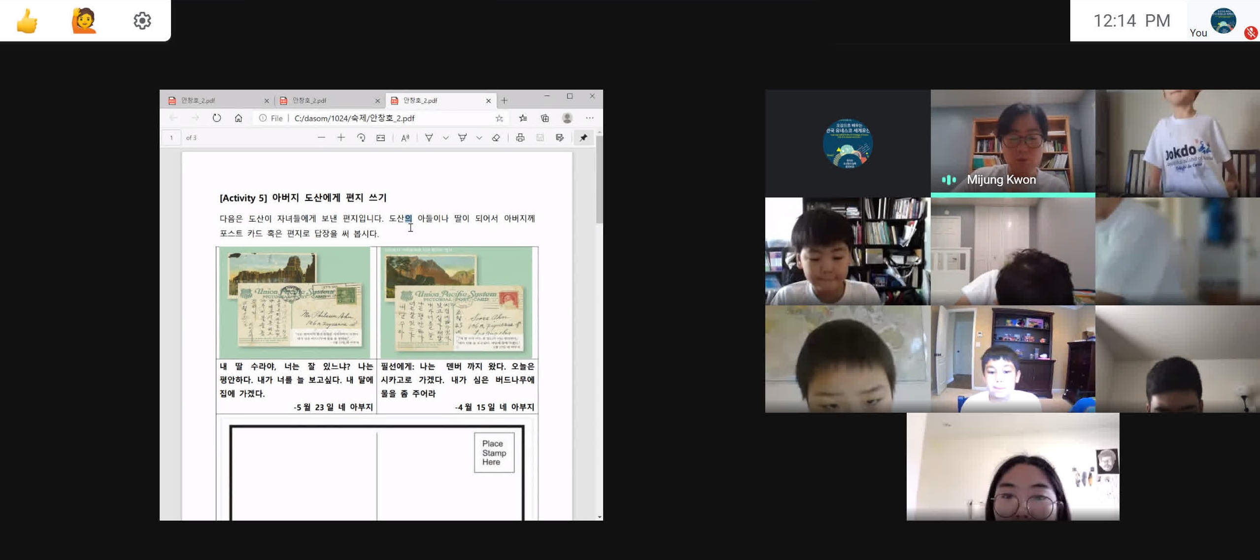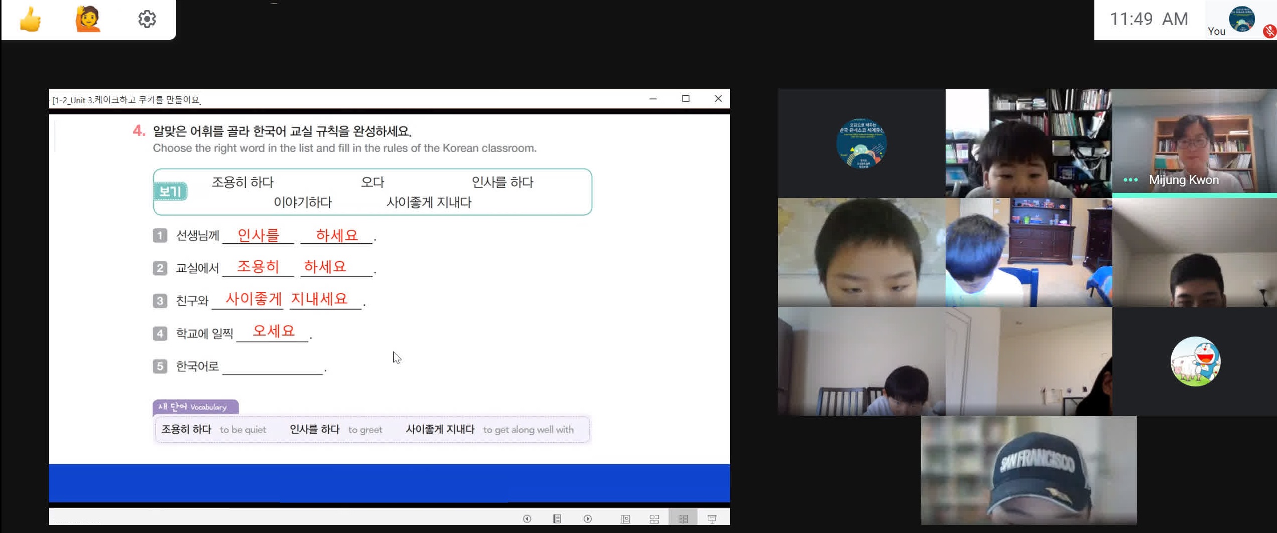 2020-2021학년도 7번째 온라인 수업을 진행했습니다. 첫 시간은 아침 조회로 독도 계기 수업을 하였고 2교시부터 4교시까지한국어 및 반 별 독도 수업을 했습니다. 온라인 수업을 진행하느라 수고하시는 선생님들과 학생들을 격려해 주시기 바랍니다.