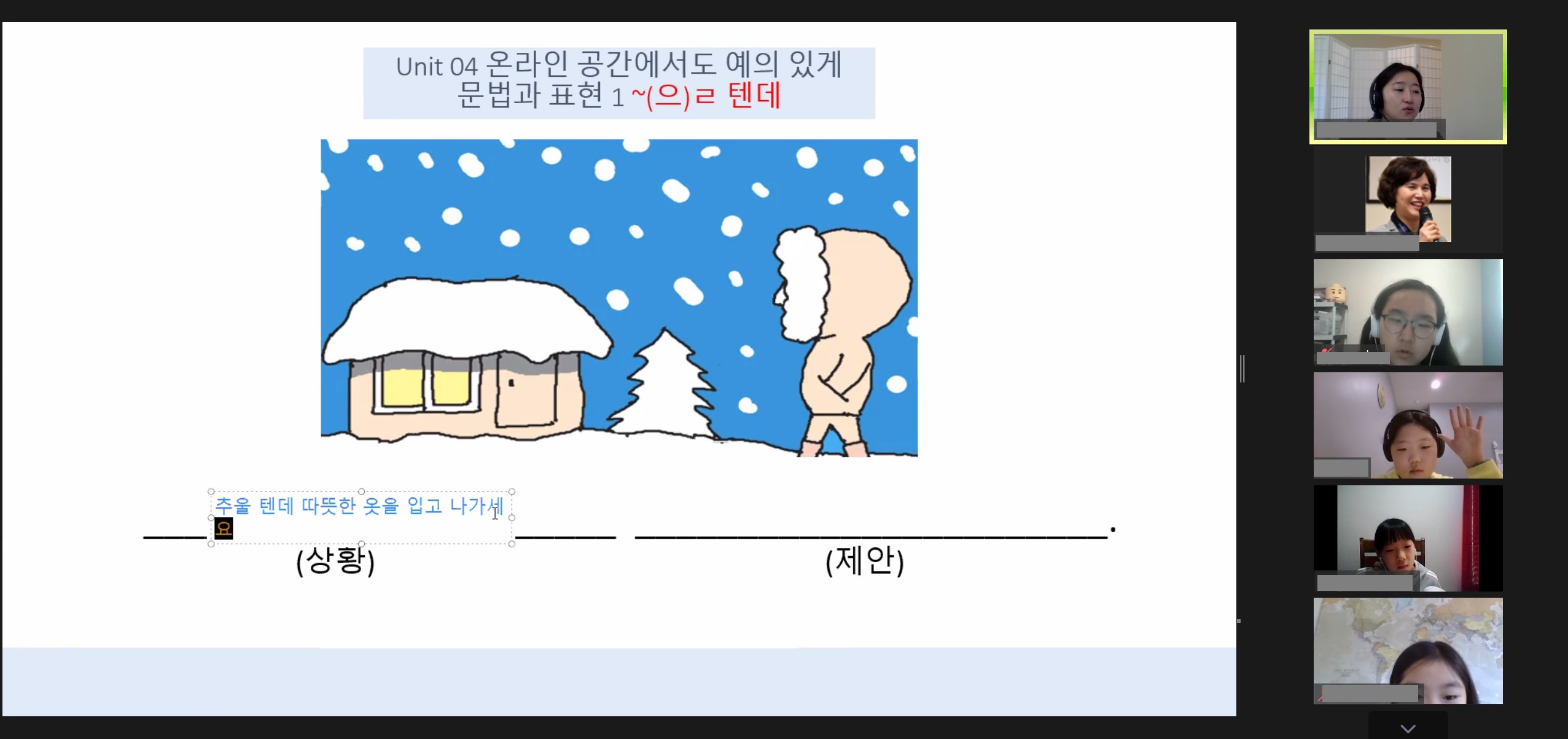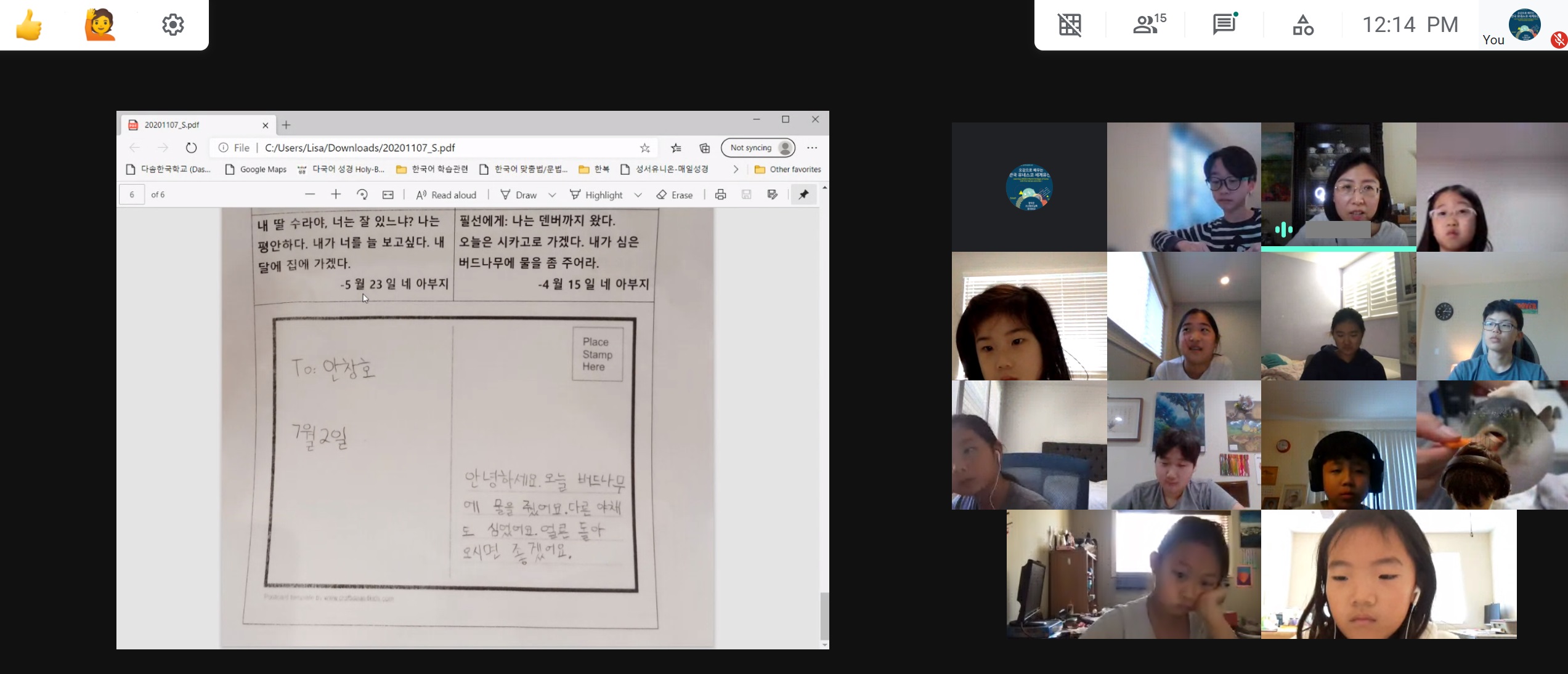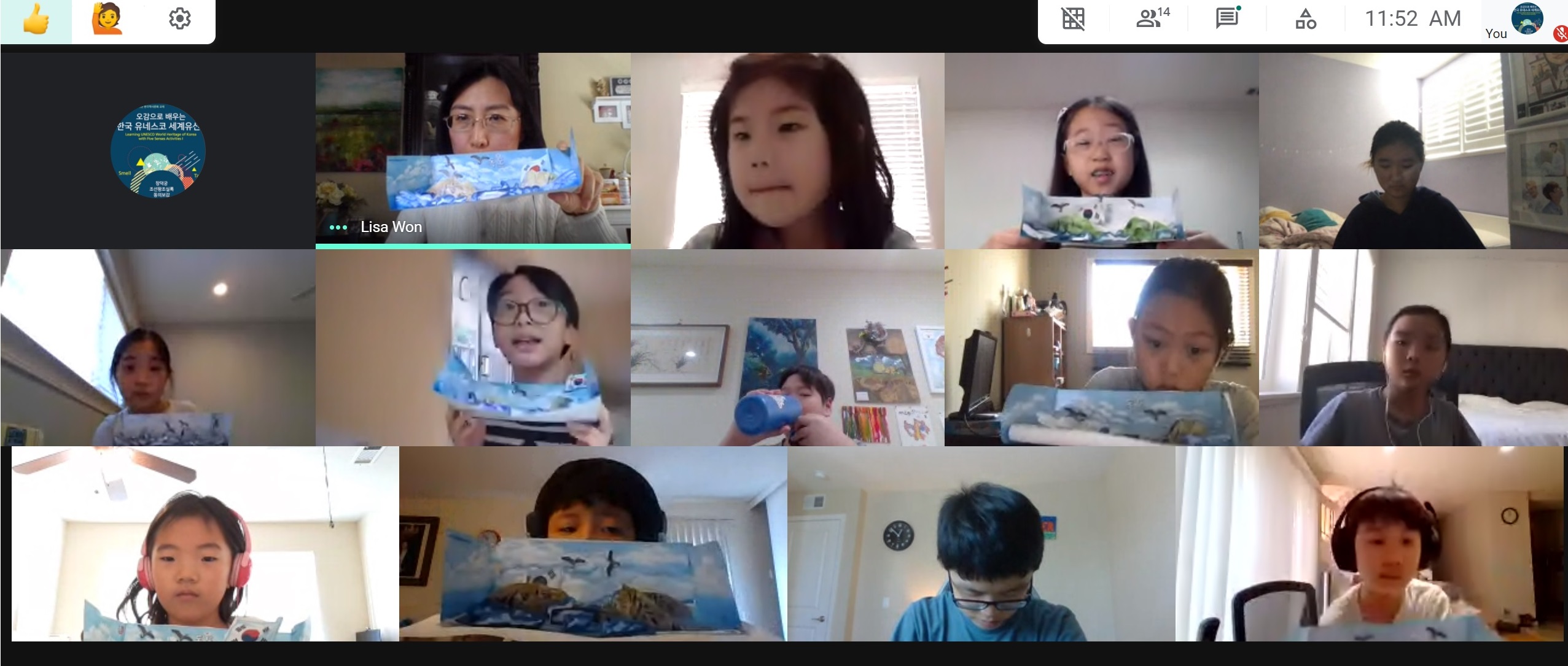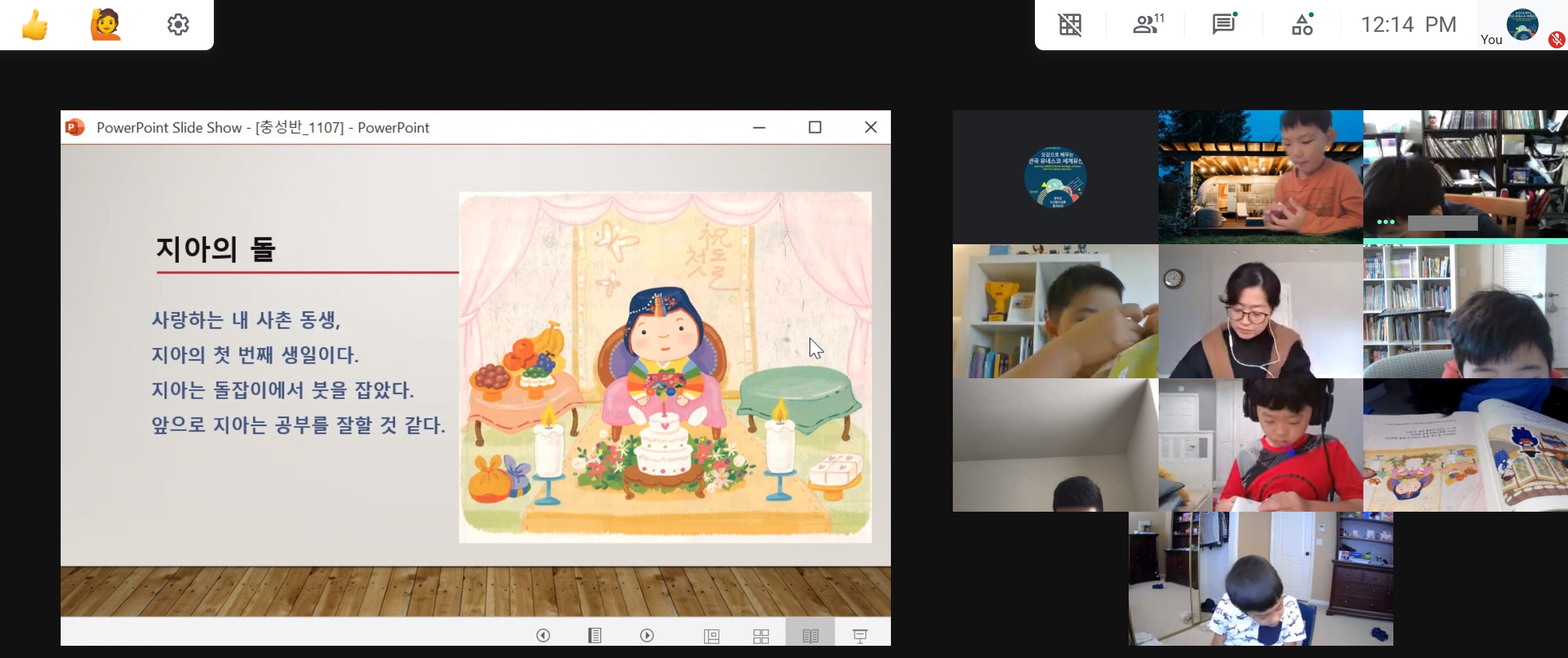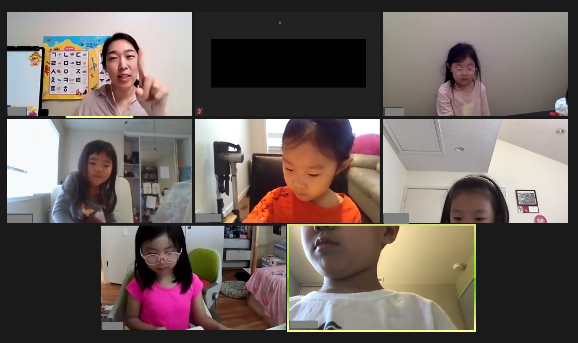 2020년 11월 07일-9번 째 온라인수업 2020년 11월 7일 9번째 온라인 수업이 진행되었습니다. 오전 9시 반에 모두 모여 아침 조회를 했고 10시 10분부터 반 별로 수업이 진행되었습니다. 각 반 수업 모습입니다. Prev Next