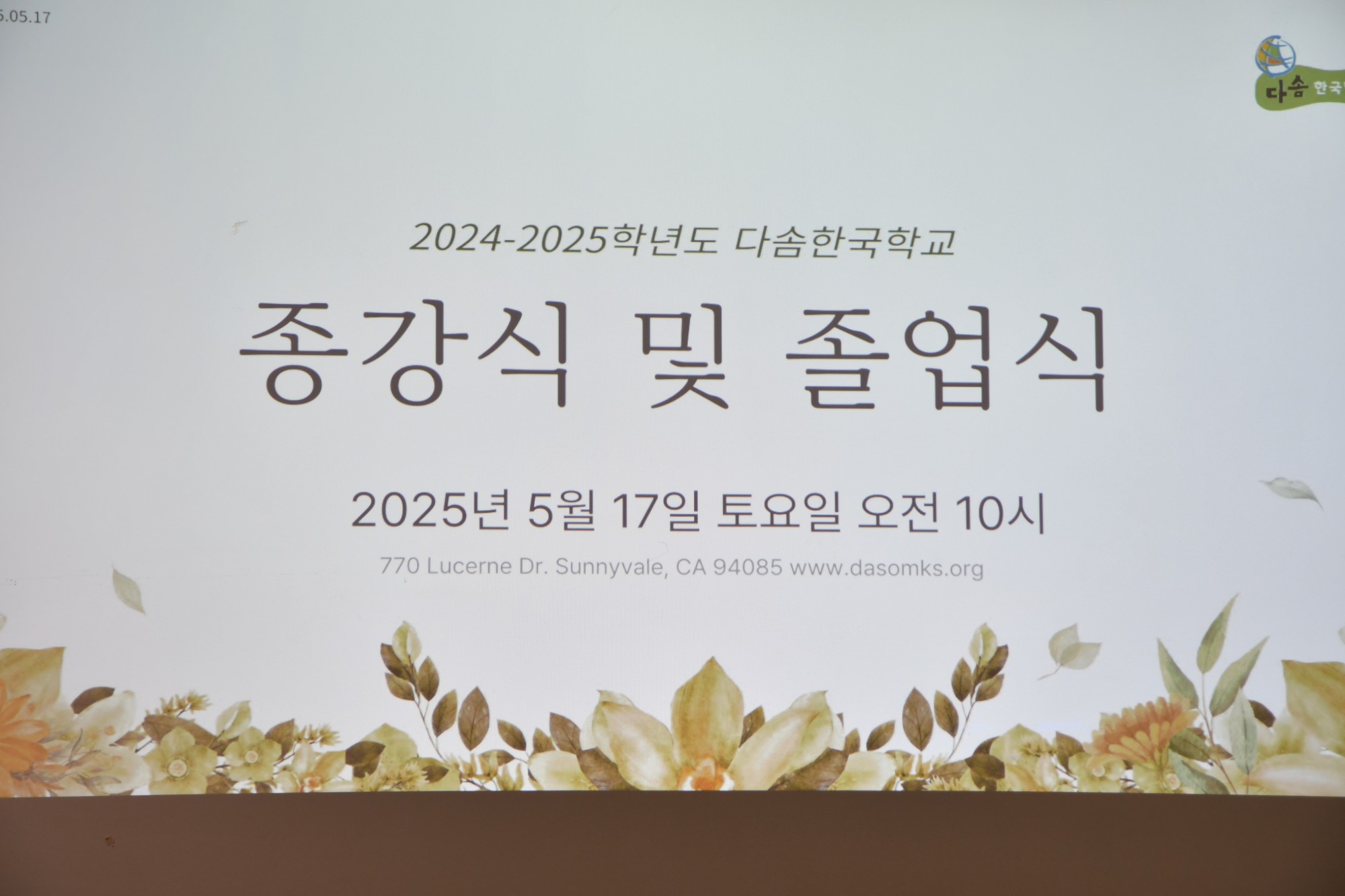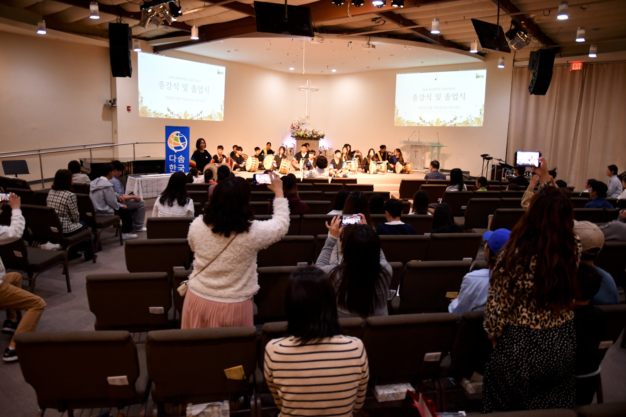 다솜한국학교는 2024~2025학년도를 마무리하며 종강식과 졸업식을 거행하였습니다. 사물놀이팀의 힘찬 북소리로 문을 연 종강식은 권미정 교무 선생님의 사회로 진행되었으며, 국민의례, 박석현 목사님의 말씀과 기도, 학사보고, 교장 인사말, 상장 수여 등의 순서로 이어졌습니다.