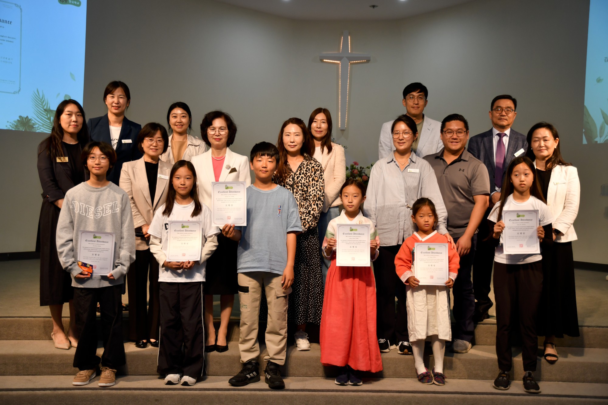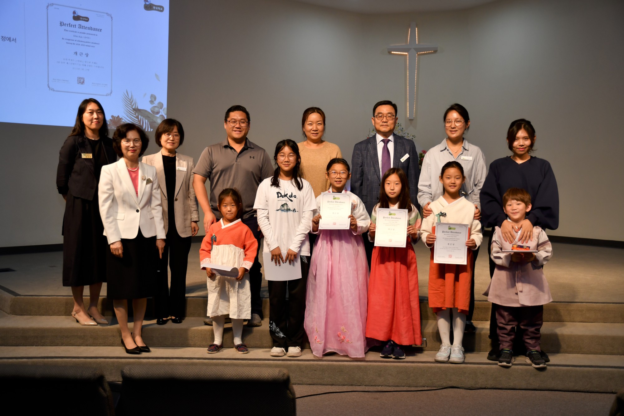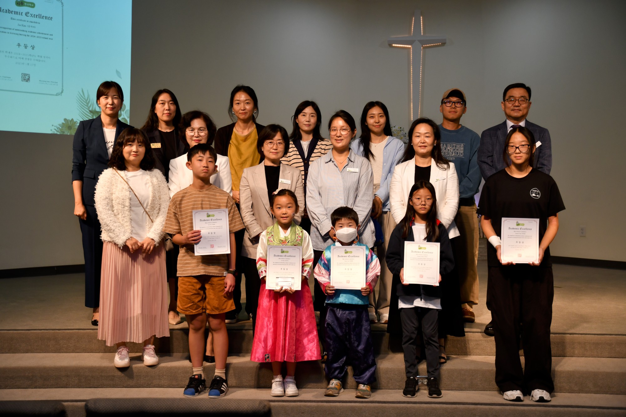 박석현 목사님은 "하나를 아는 것보다 두 가지 이상을 아는 것이 중요하다"고 강조하시며, 영어와 함께 한국어를 잘 배워 다른 사람들과 소통하고 이해할 수 있는 사람이 되기를 당부하셨습니다. 이어 교사들과 학생들의 수고를 격려하며 축복의 기도를 해주셨습니다. 지난 1년을 돌아보는 슬라이드 쇼가 상영되는 동안 학생들은 자신이 등장하는 장면에서 웃음과 추억을 나누었습니다.