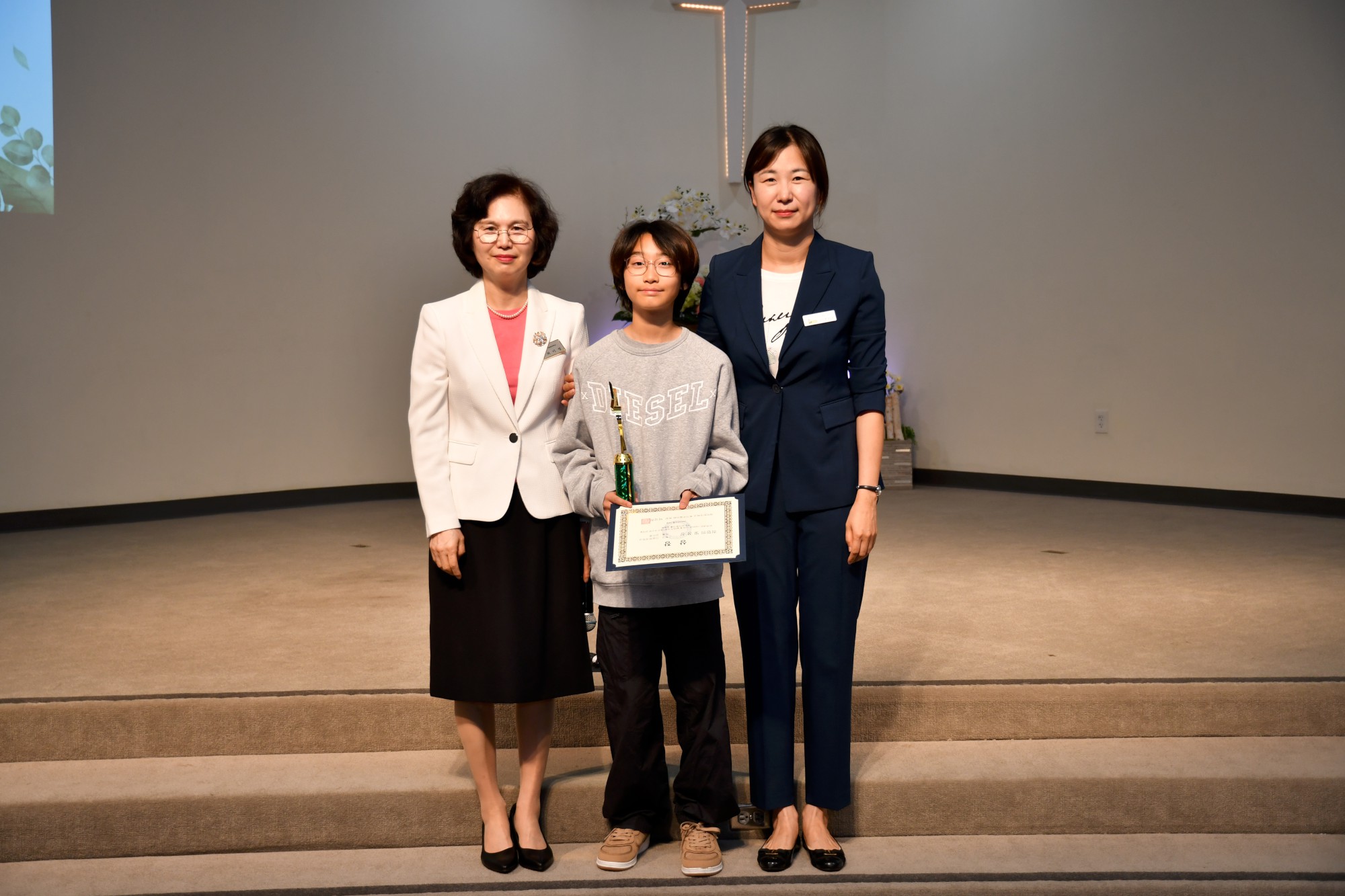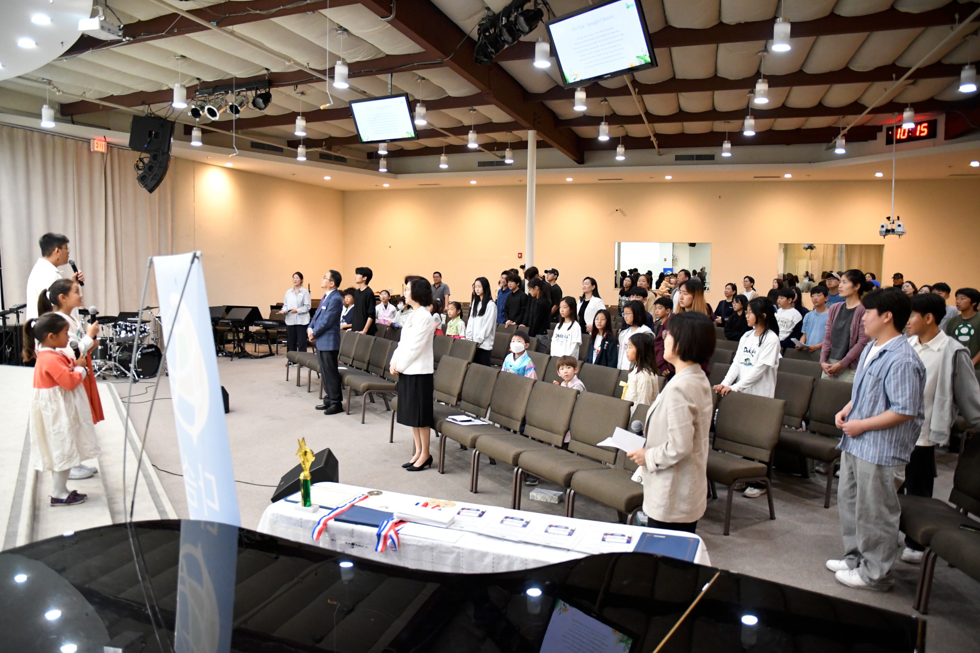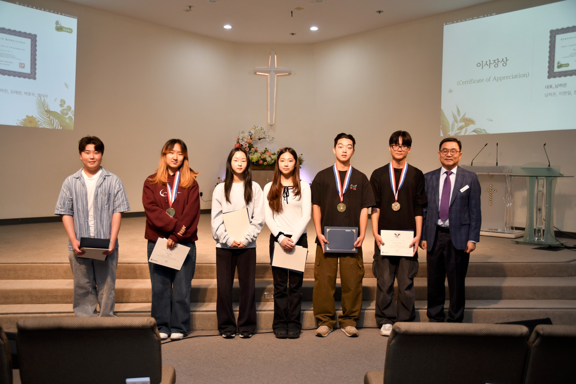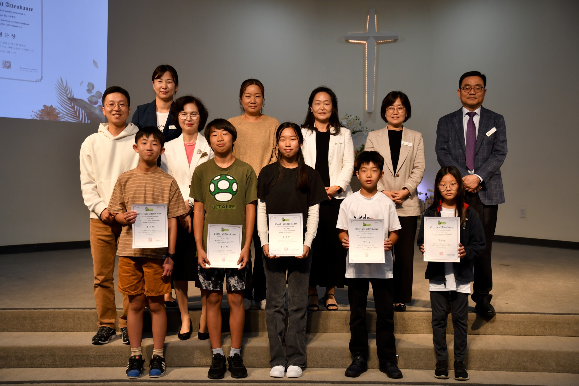 박석현 목사님은 "하나를 아는 것보다 두 가지 이상을 아는 것이 중요하다"고 강조하시며, 영어와 함께 한국어를 잘 배워 다른 사람들과 소통하고 이해할 수 있는 사람이 되기를 당부하셨습니다. 이어 교사들과 학생들의 수고를 격려하며 축복의 기도를 해주셨습니다. 지난 1년을 돌아보는 슬라이드 쇼가 상영되는 동안 학생들은 자신이 등장하는 장면에서 웃음과 추억을 나누었습니다.