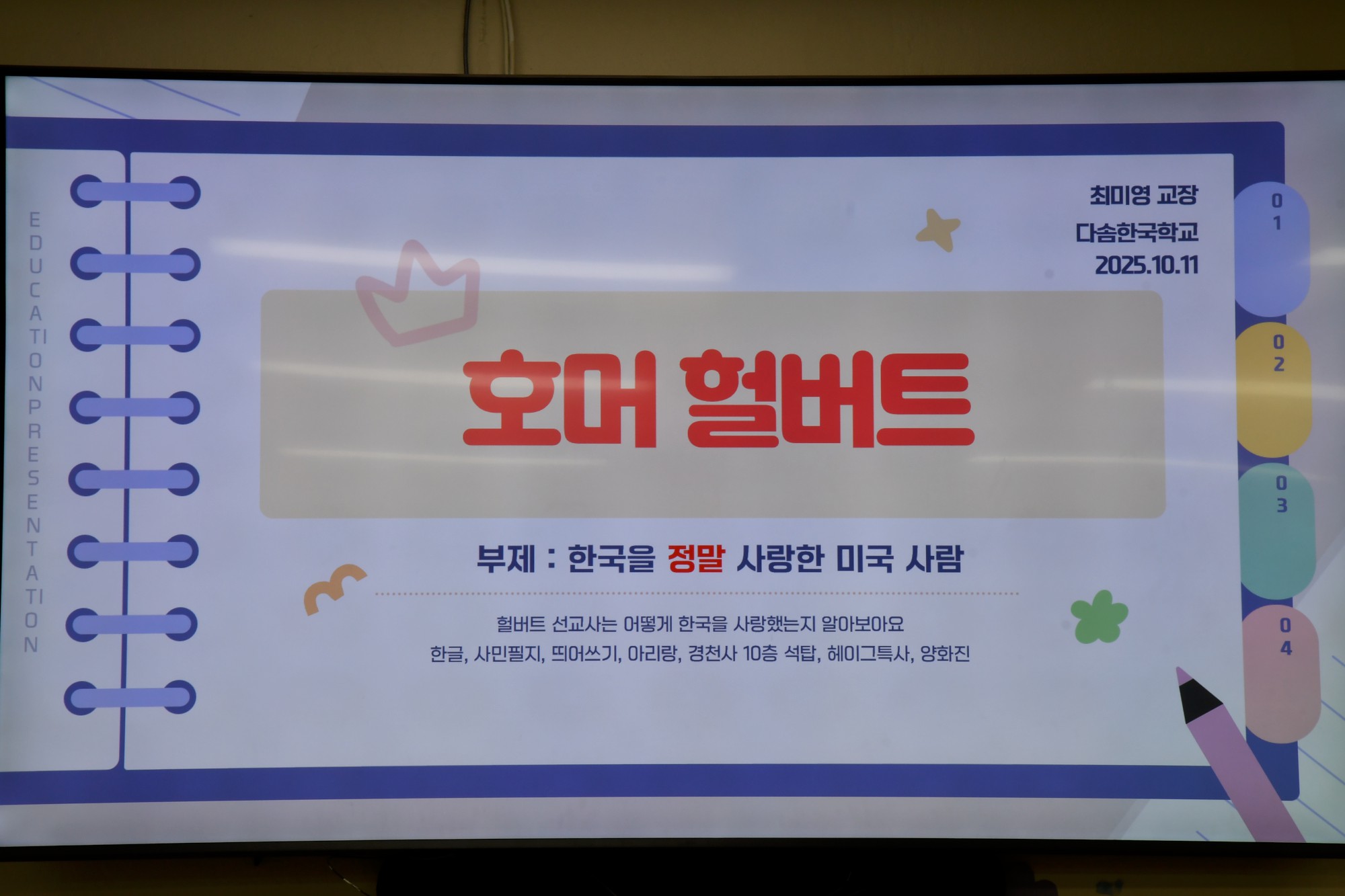 우리 학교에서는 2025-2026학년도 한국 역사·문화 교육과정의 대주제를 ‘인물로 배우는 한국 역사’로 정하고, 지난 10월 11일 첫 수업으로 ‘한국을 끝까지 지지한 호머 헐버트’를 주제로 공부했습니다.