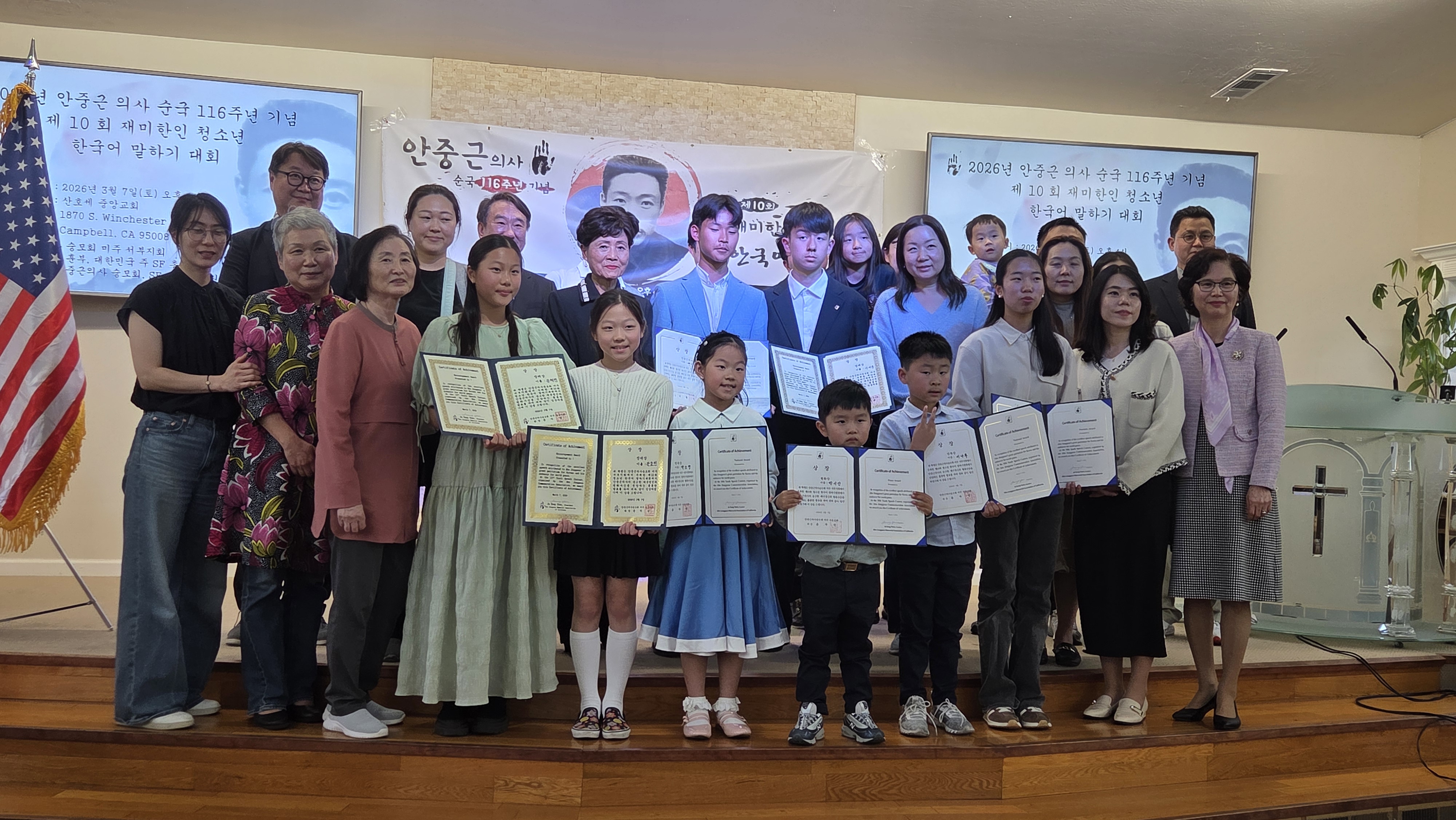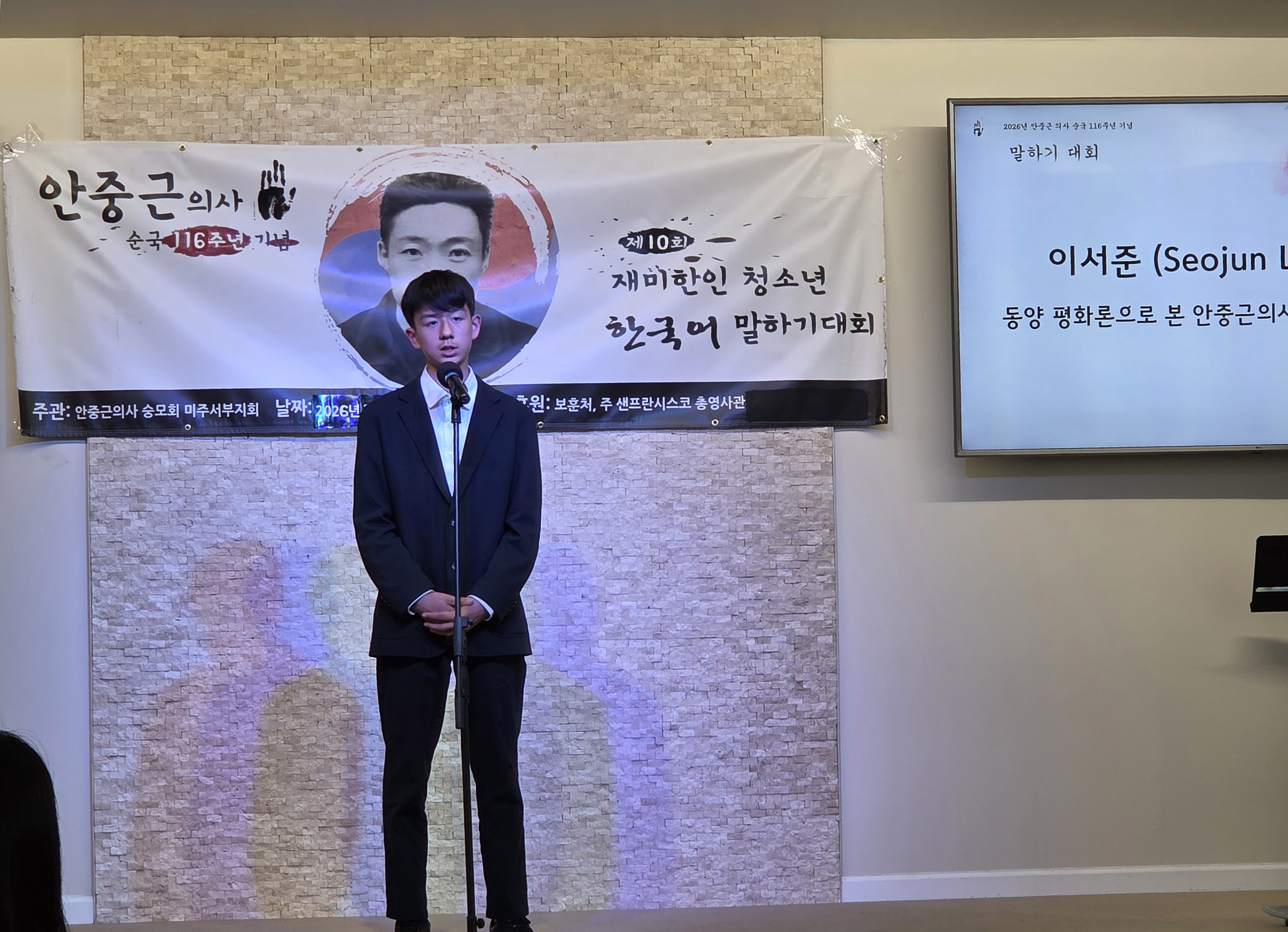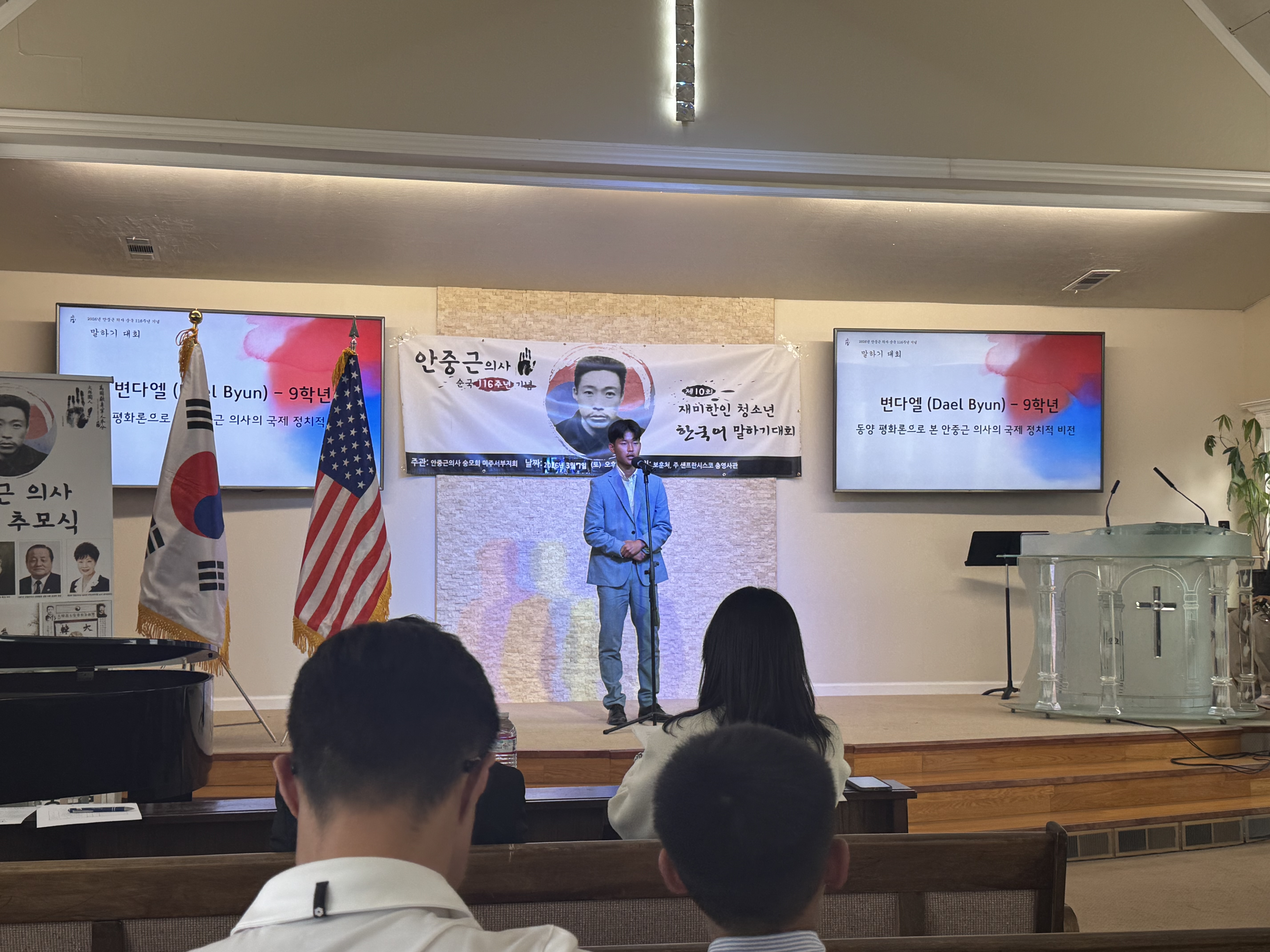 안중근 의사 순국 116주년을 기념해 3월 7일 오후 산호세 중앙교회에서 ‘제10회 재미한인 청소년 한국어 말하기 대회’가 개최되었습니다. 본교에서는 박이안(해랑반), 이서준, 송예담, 변다엘(대한민국반) 학생이 참가하였습니다.