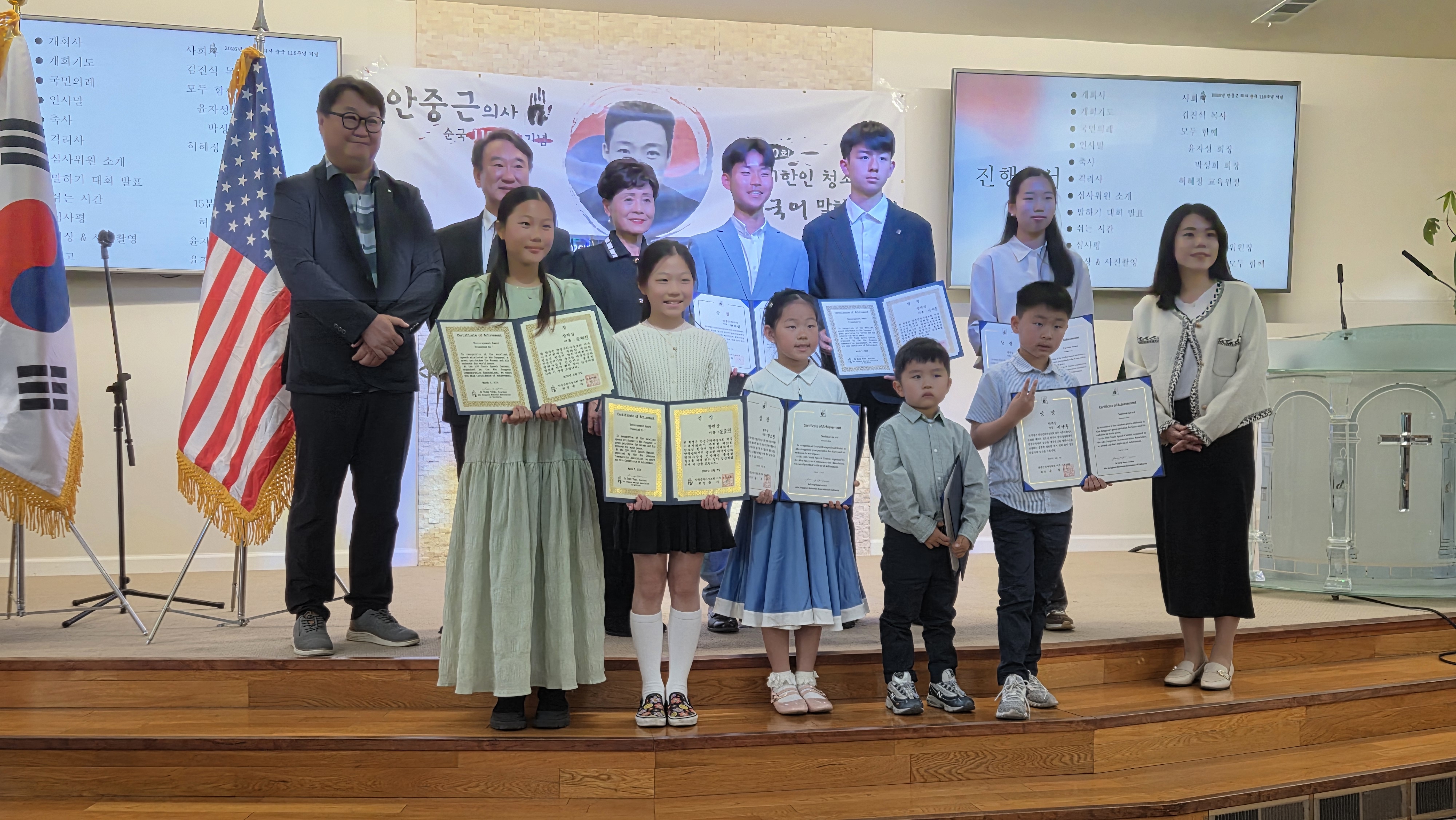 변다엘 학생은 대상인 안중근 의사상을, 박이안 학생은 평화상을, 송예담 학생은 애국상을, 이서준 학생은 장려상을 수상하였습니다.