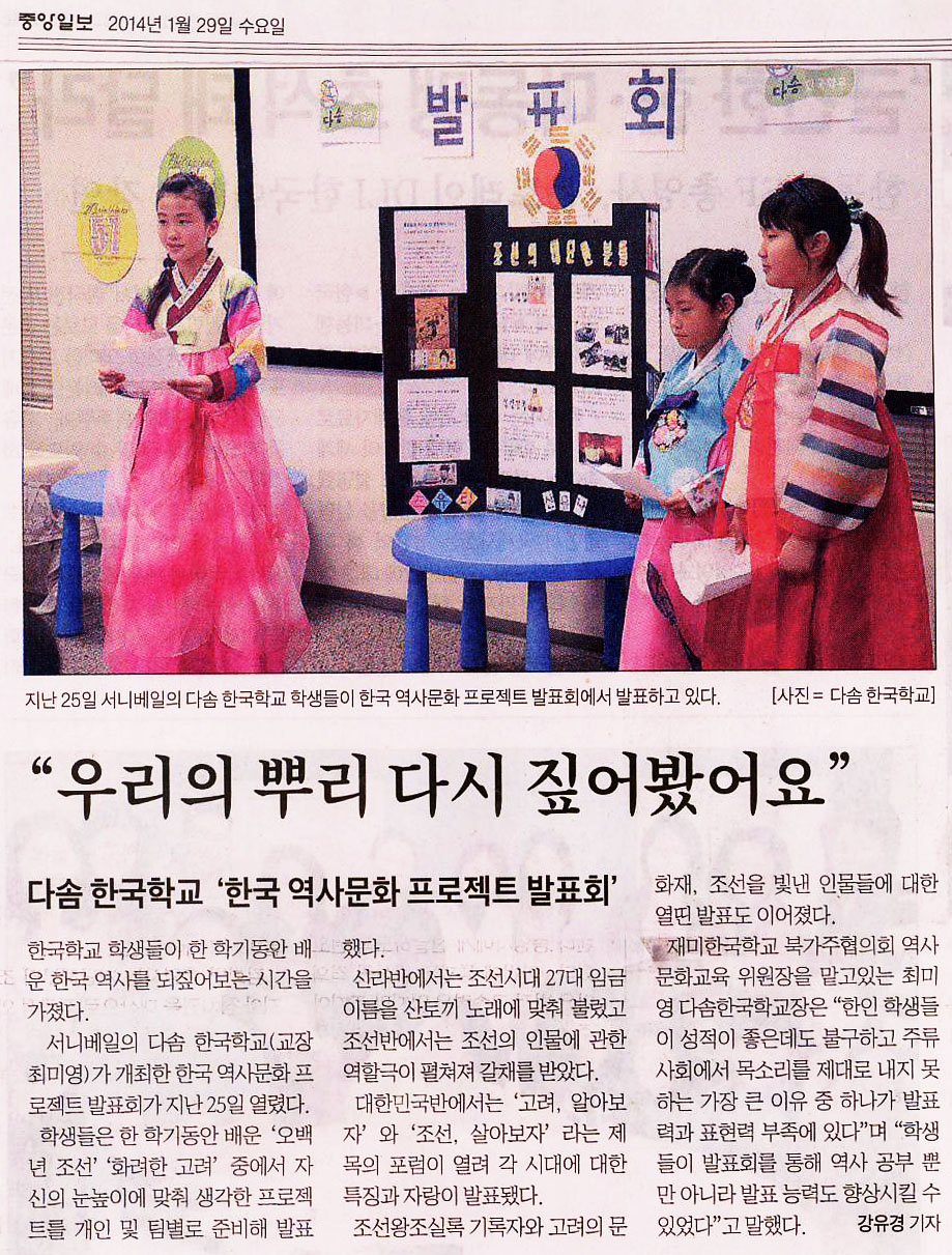보도자료(중앙일보)_다솜한국학교 역사문화 프로젝트 발표회 본 교의 한국역사문화 프로젝트 발표회에 대한 중앙일보 보도 자료입니다. 2014년 1월 29일 Attachments: 2014_01_29_JoongAng.pdf[ ]285 kB Prev Next
