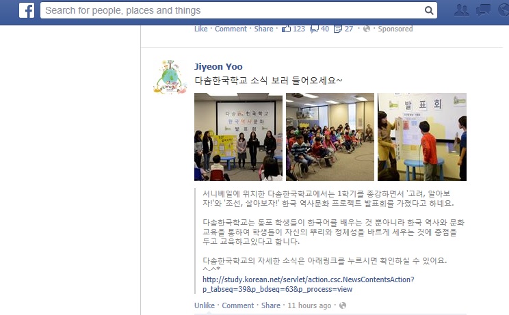 보도자료(Facebook)[고려, 알아보자!]와 [조선, 살아보자!] 한국 역사문화 프로젝트 발표회 본교에서 개최된 한국 역사문화 프로젝트 발표회가 Facebook에도 떠서 전 세계의 한국학교에 알려졌습니다. Prev Next