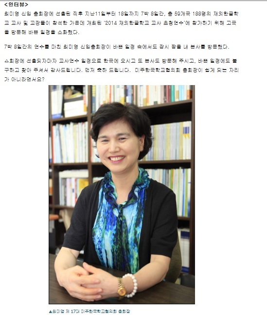 [재외동포신문] 최미영 회장 인터뷰 최미영 본교 교장선생님의 재외동포신문 인터뷰 기사입니다. [관련 링크]: http://www.dongponews.net/news/articleView.html?idxno=26678 Attachments: 2014_07_17th_Naks_Jaewe.pdf[ ]1180 kB Prev Next